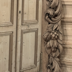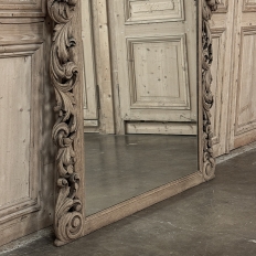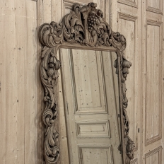 Grand 19th Century French Renaissance Mirror is more than just a mirror, it's a work of art! The sculptor who created it was truly talented, and worked in bold full relief to capture the essence of the bounty of nature in the framework from one side to the other. A bold acanthus scrollwork provides the corner base from which the carvings emanate, with luxuriant scrolls continuing up each side accented with bounty-of-the-earth represented by various fruits, continuing all the way up and around the rounded upper corners. The bold acanthus flourishes then expand across the crown to reach a peak at the center, which is dominated by an heraldic crest carved with peaches, a cluster of grapes, and foliage in bold relief. Painstakingly stripped using our proprietary process that retains the patina and sheer natural beauty of the old wood, all performed by our expert in-house staff.