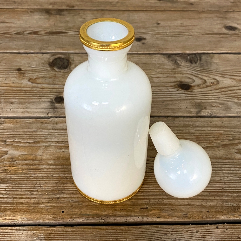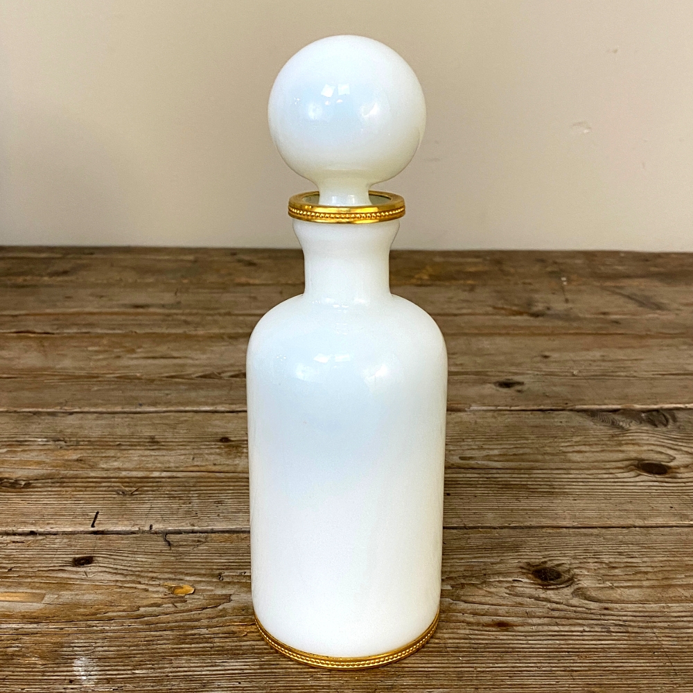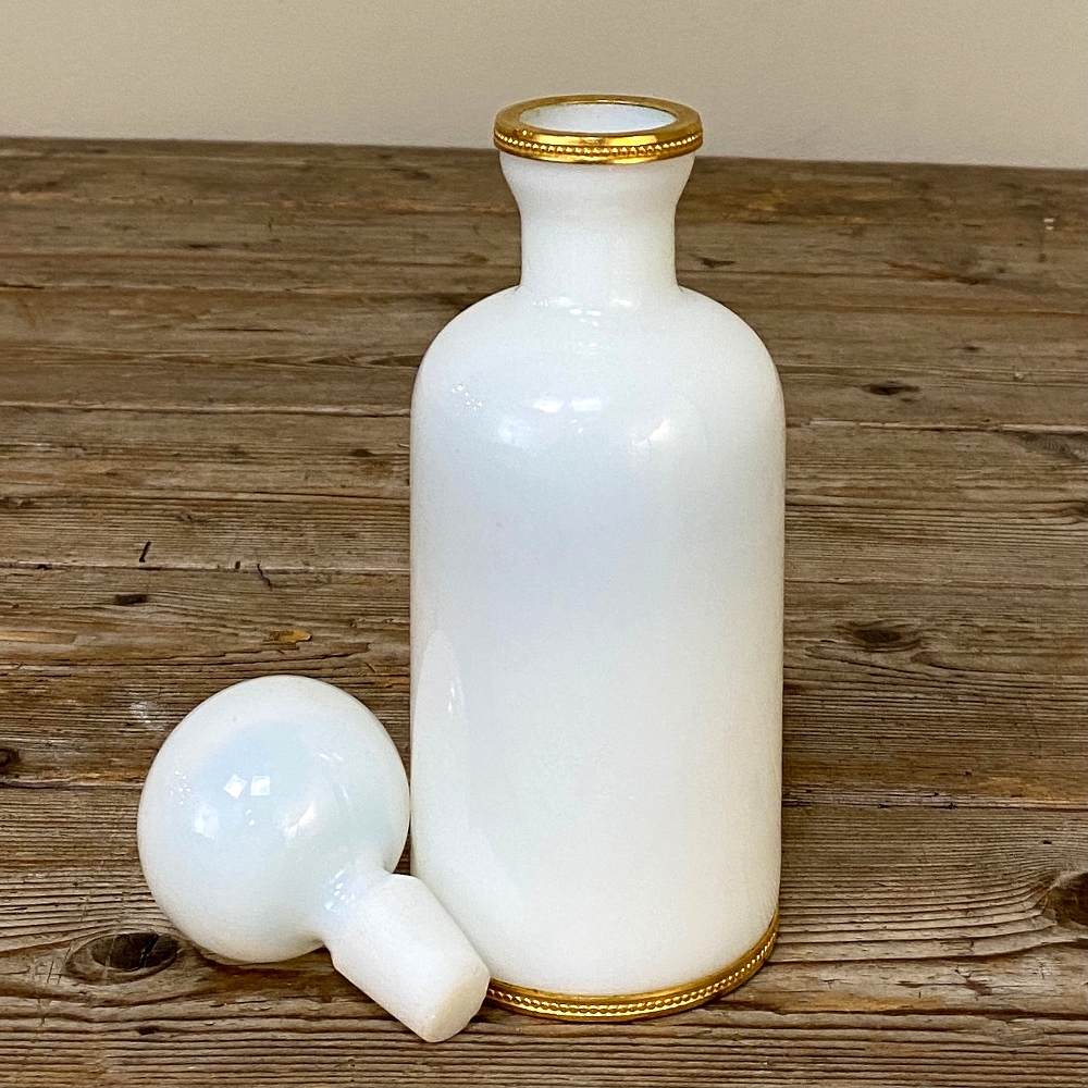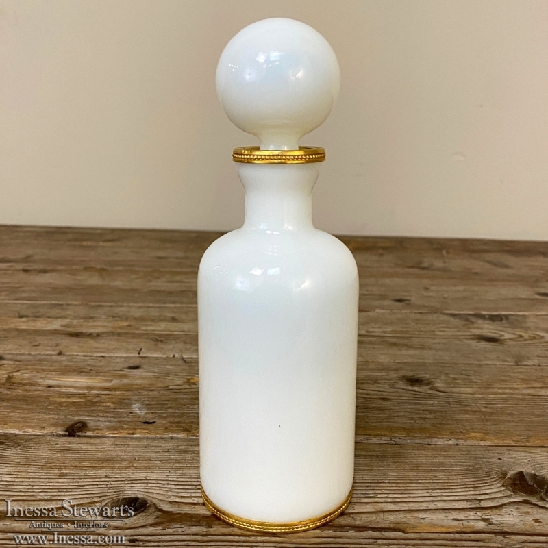 19th Century French Opaline Perfume Bottle with Stopper makes a great decorative accessory, and is highly collectible as only a limited number in this condition have survived the past century. This example features excellent detail in a beaded rim and base highlighted in gold leaf. The translucent quality of the glass has been admired for hundreds of years by aficionados all over the world!