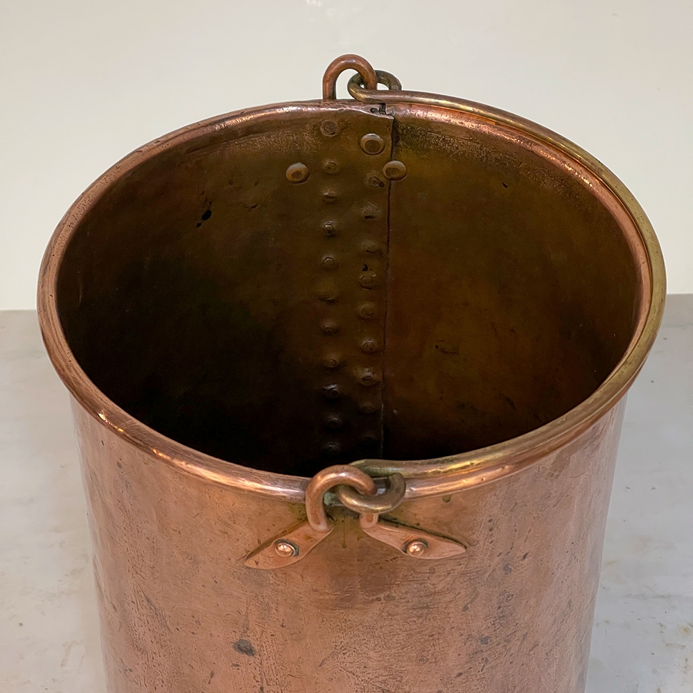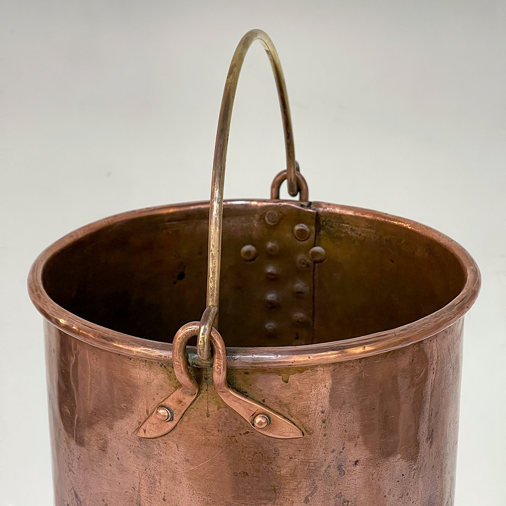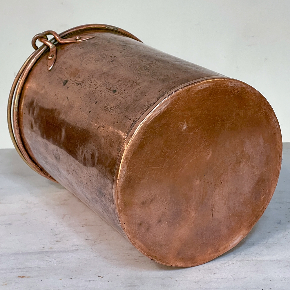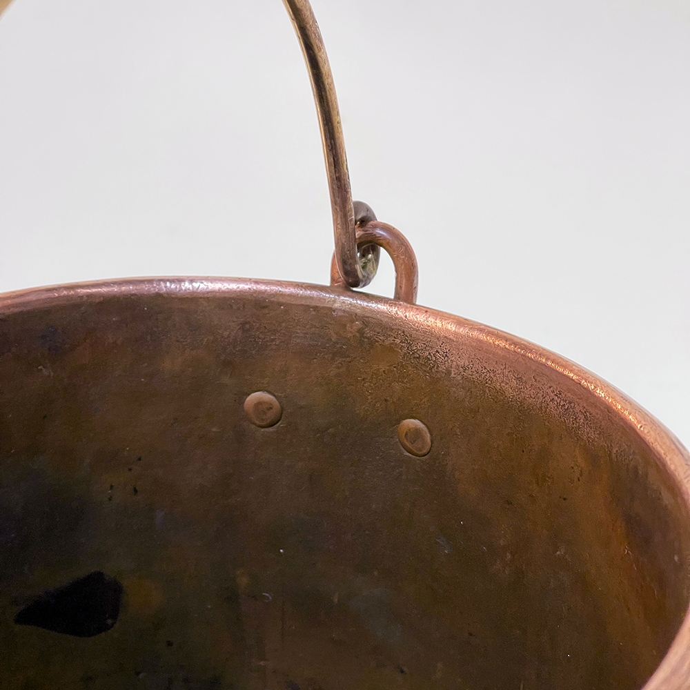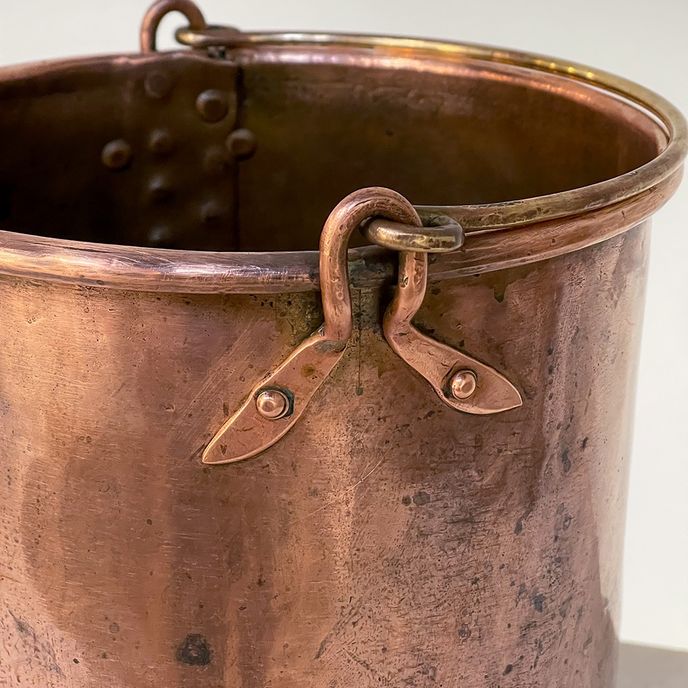 19th Century Hand-Hammered Copper Pot with Riveted Seams & Handles will make a perfect decorative accent for any rustic or Country French decor. Formed from solid copper, it features a copper handle held with loops that are hammered and riveted to the sides. The side is formed from one sheet wrapped around into a cylinder then riveted together. A circular lipped base is soldered on to provide lasting enjoyment. Use as a flower pot, in the garden, or anywhere a charming accent is desirable!