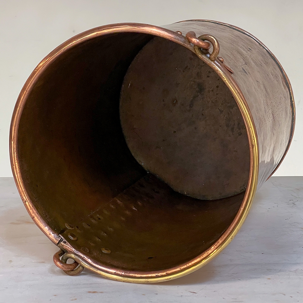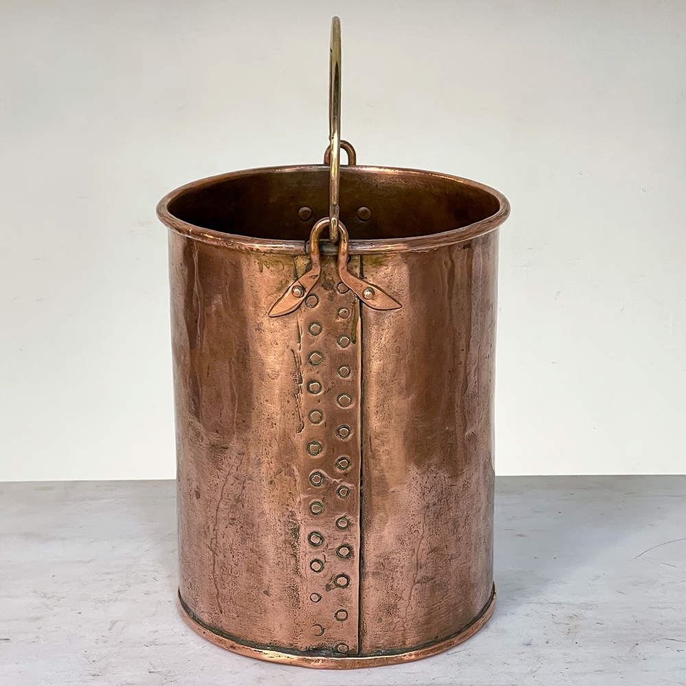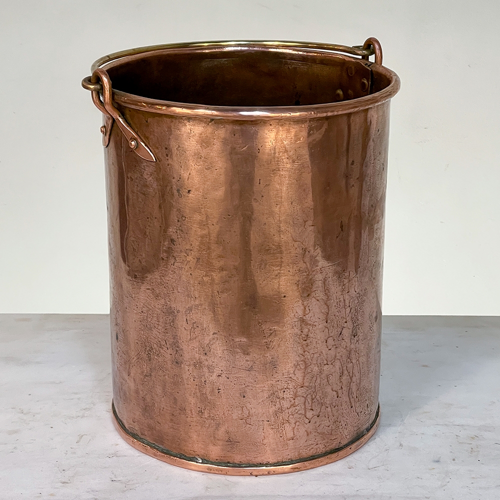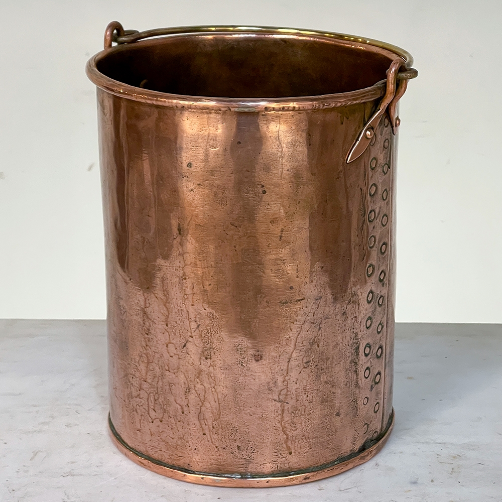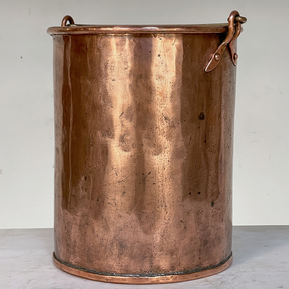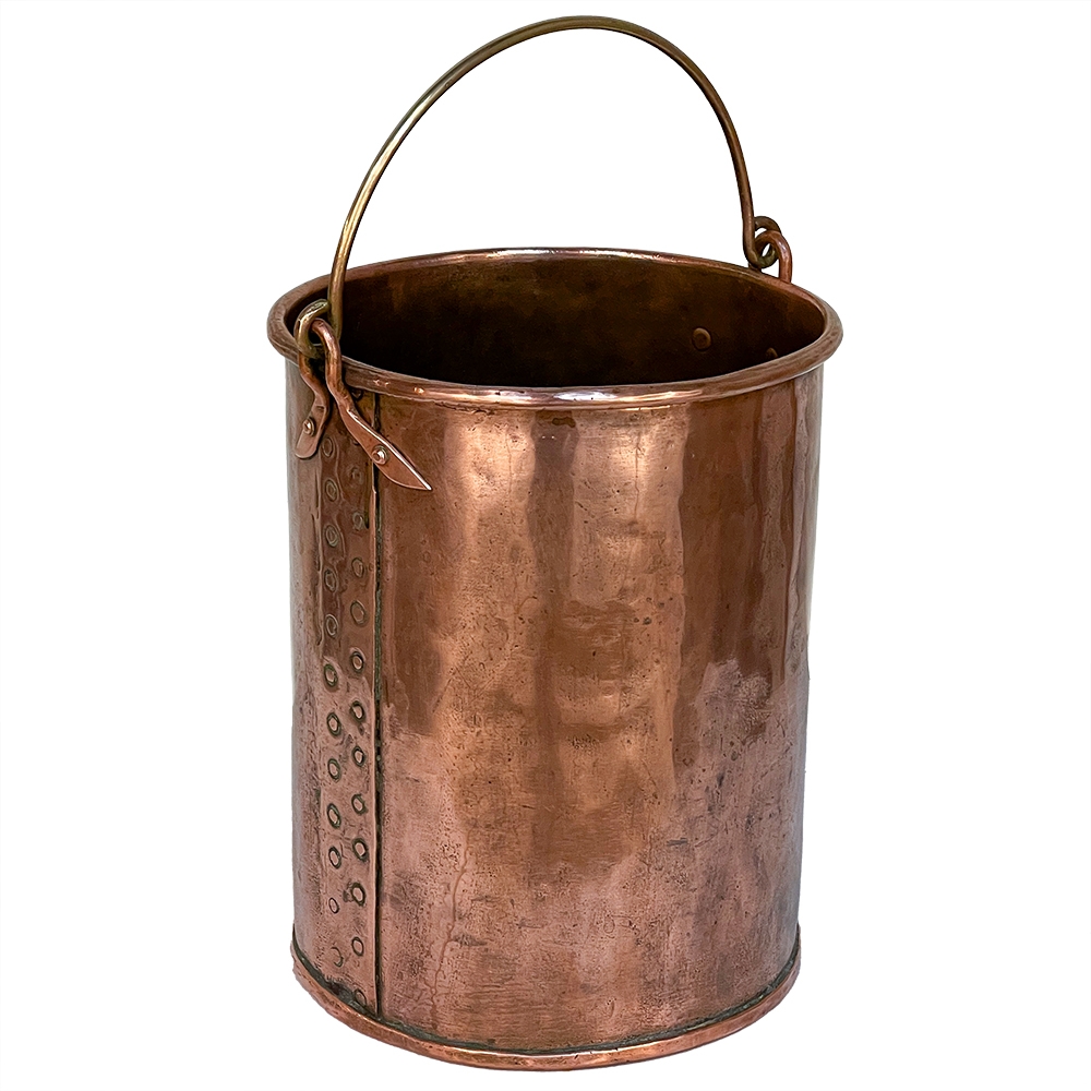 19th Century Hand-Hammered Copper Pot with Riveted Seams & Handles will make a perfect decorative accent for any rustic or Country French decor. Formed from solid copper, it features a copper handle held with loops that are hammered and riveted to the sides. The side is formed from one sheet wrapped around into a cylinder then riveted together. A circular lipped base is soldered on to provide lasting enjoyment. Use as a flower pot, in the garden, or anywhere a charming accent is desirable!