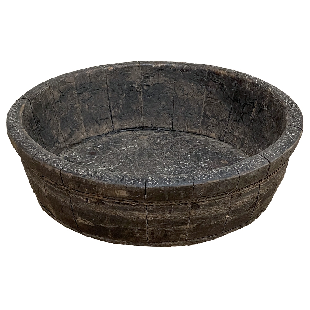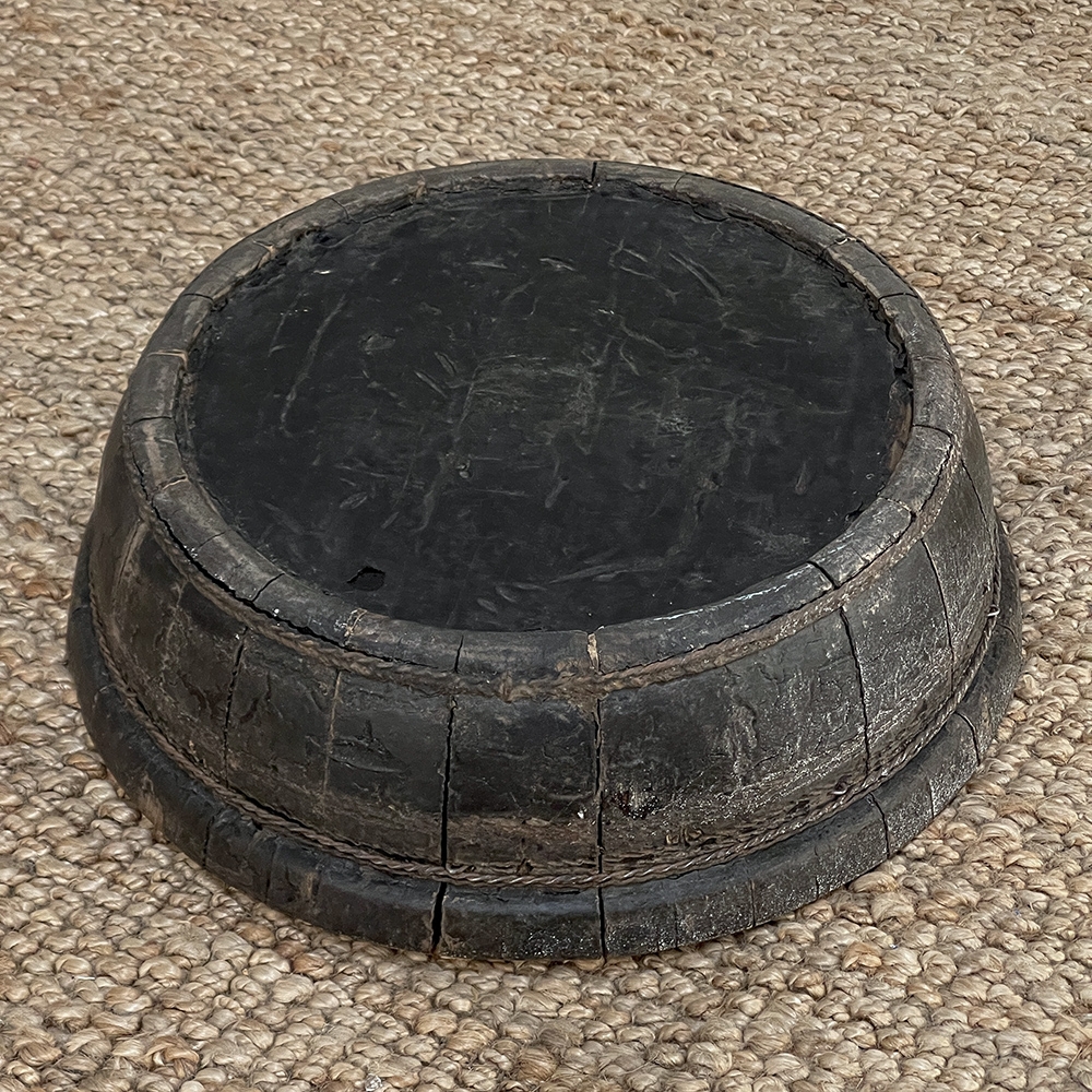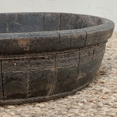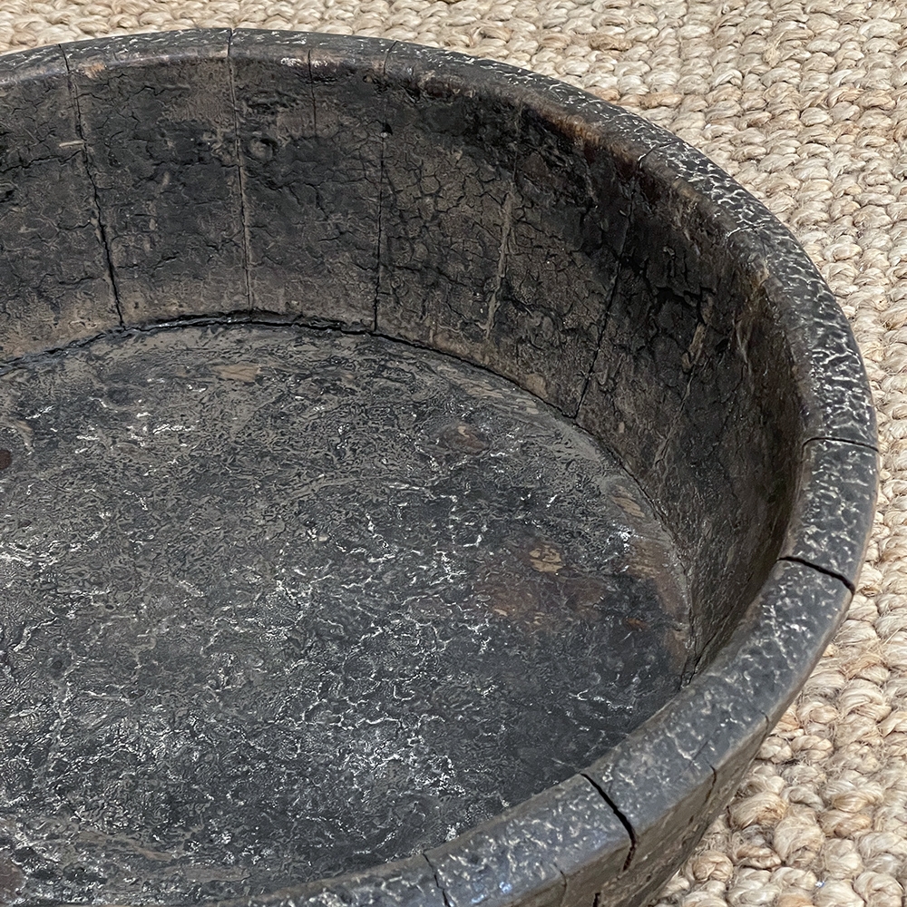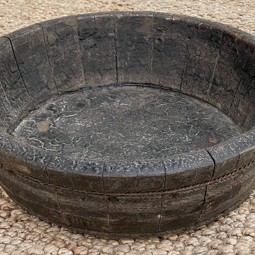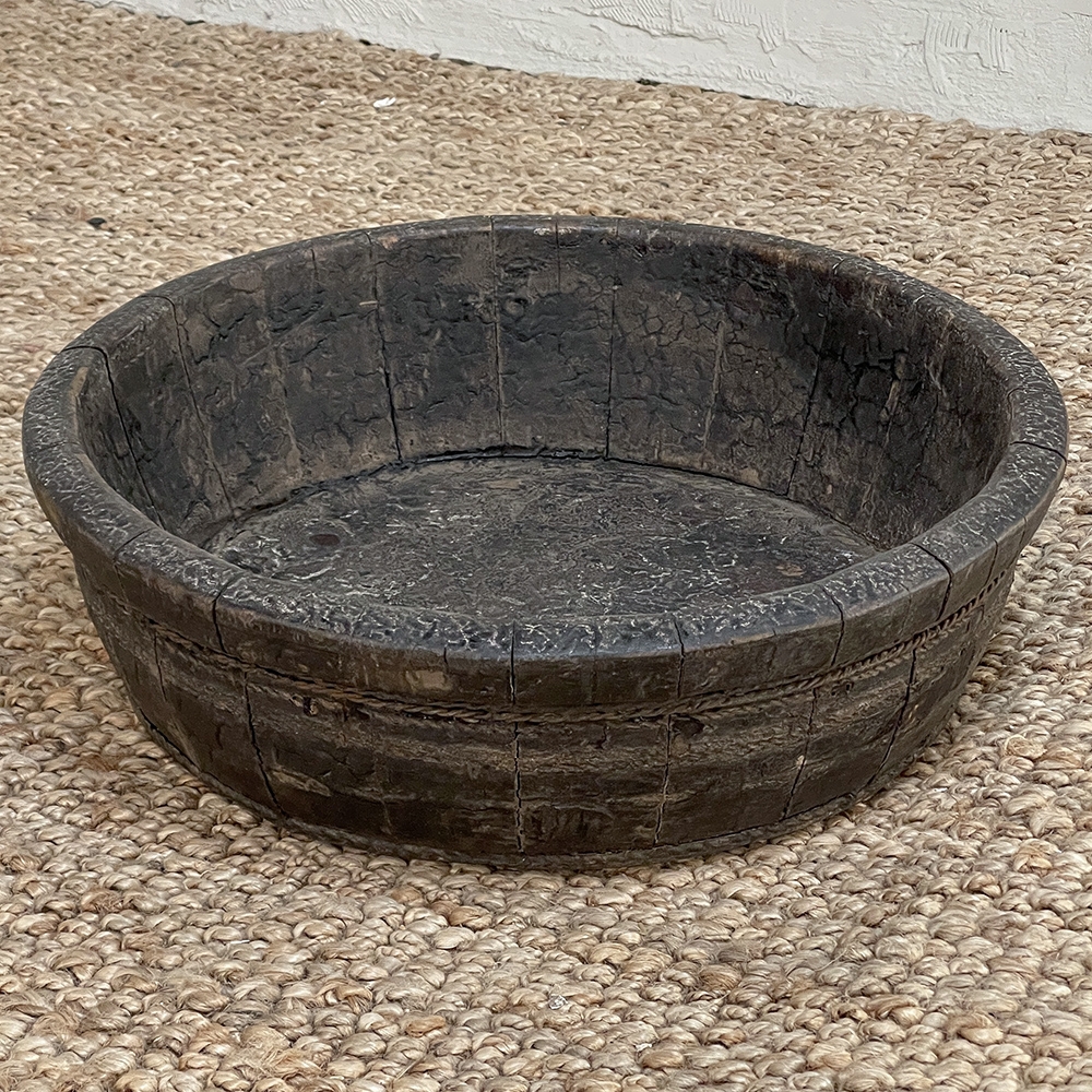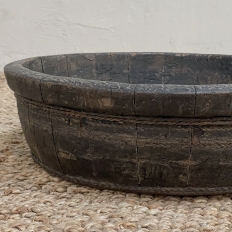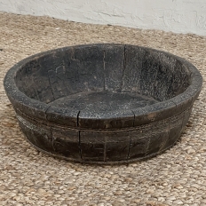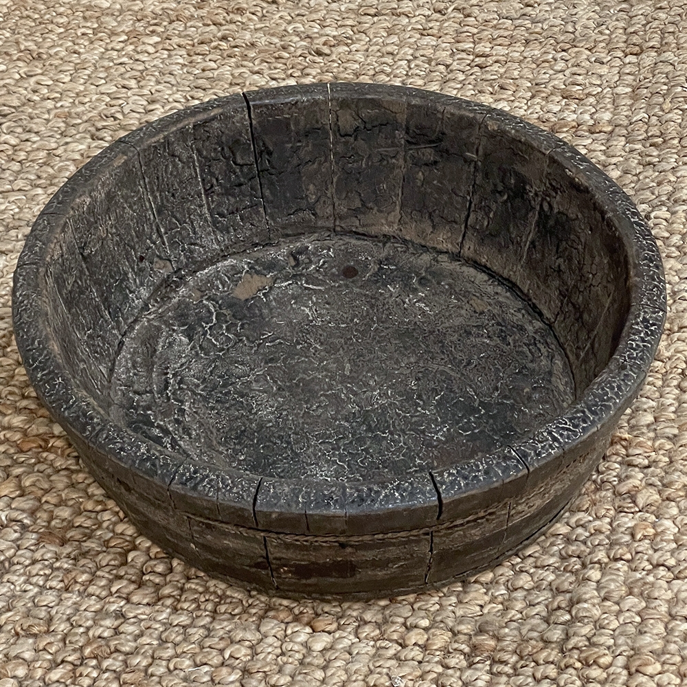 19th Century Rustic European Wooden Bowl was hand-crafted by the village cooper who also made barrels for the community using the same techniques handed down from generation to generation. Sturdy oak staves were steamed and fitted together then secured by hot iron wire that contracted when it cooled to tighten the joints. Perfect as a saucer for a larger pot, as a decorative accent in the garden, or by itself for a rustic or casual interior display!