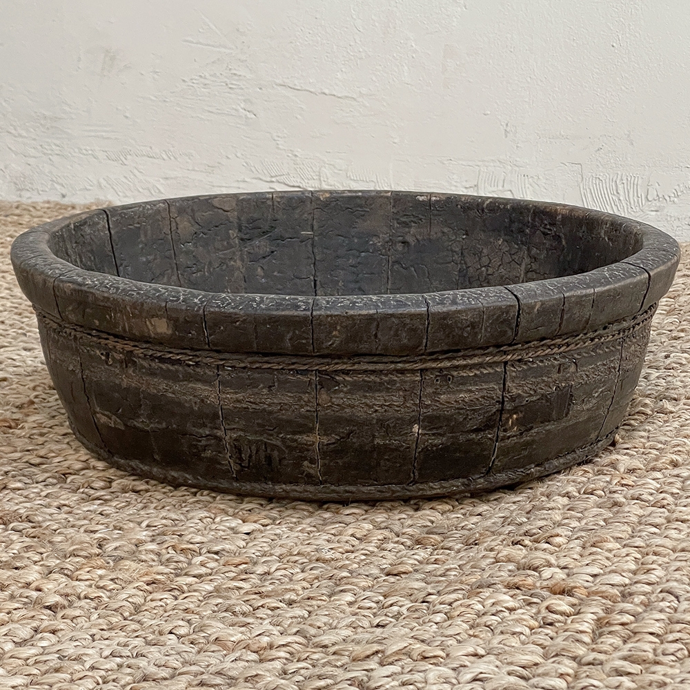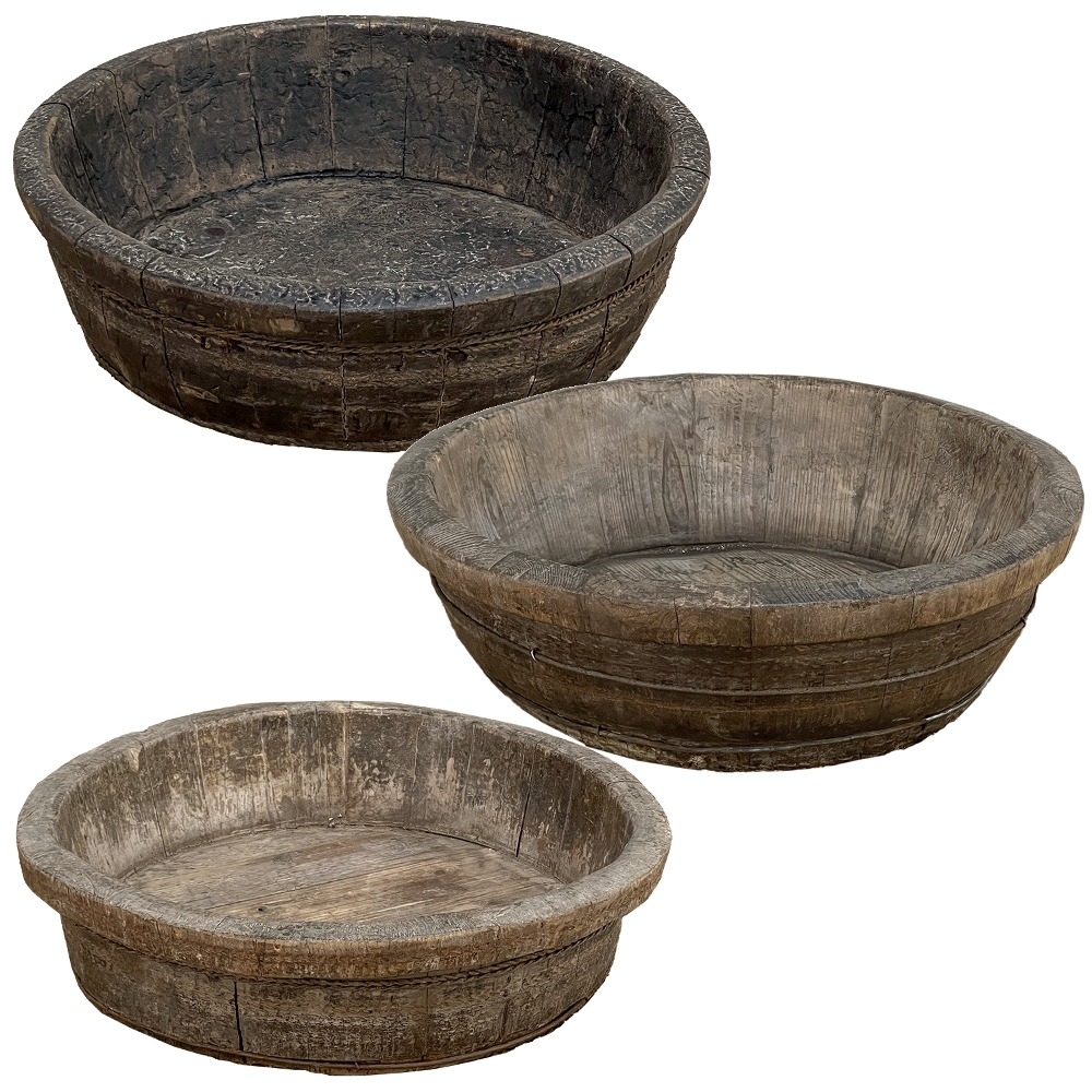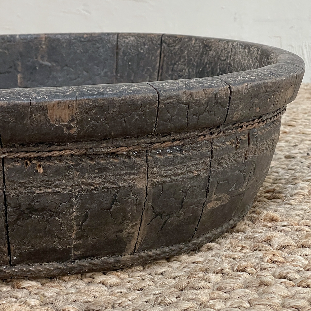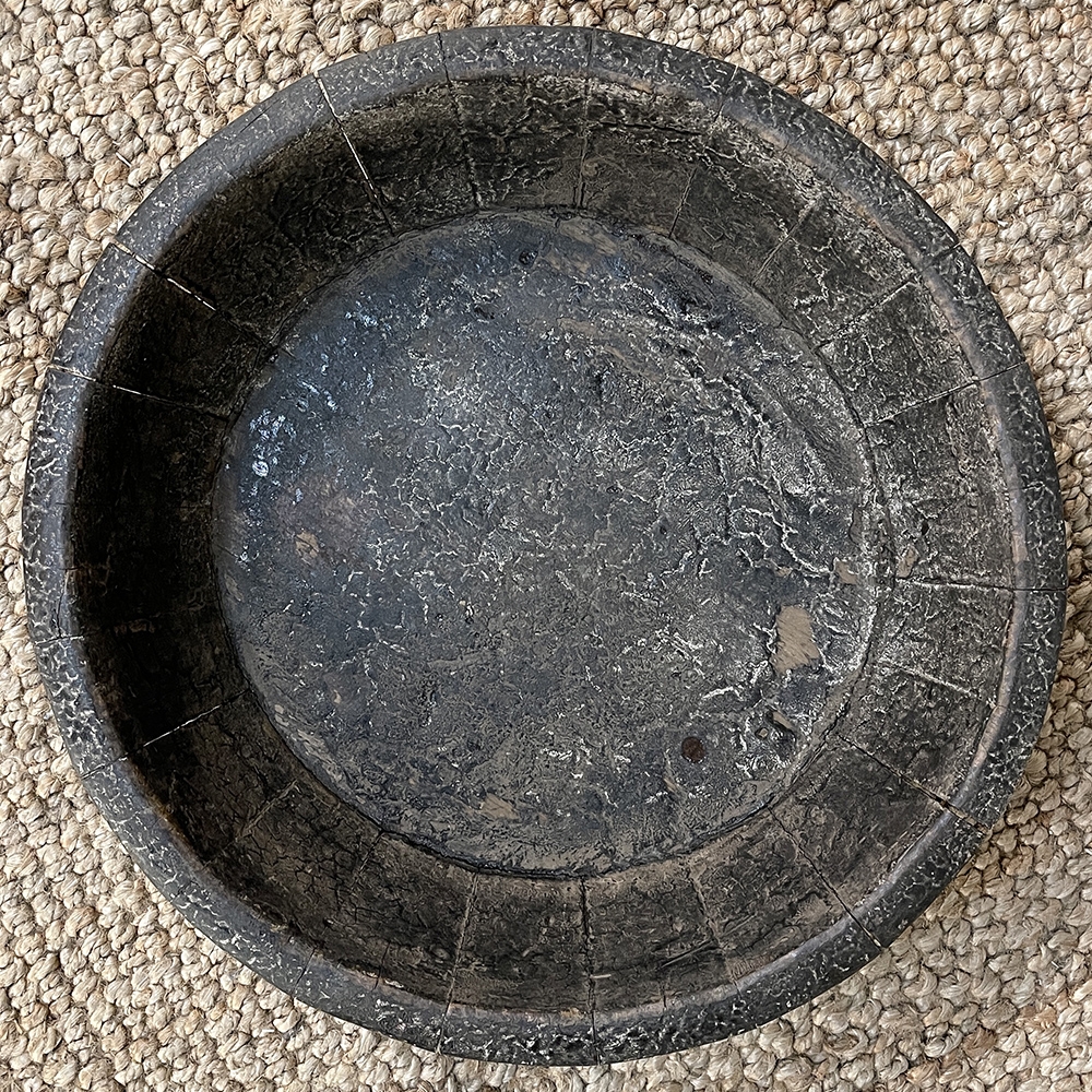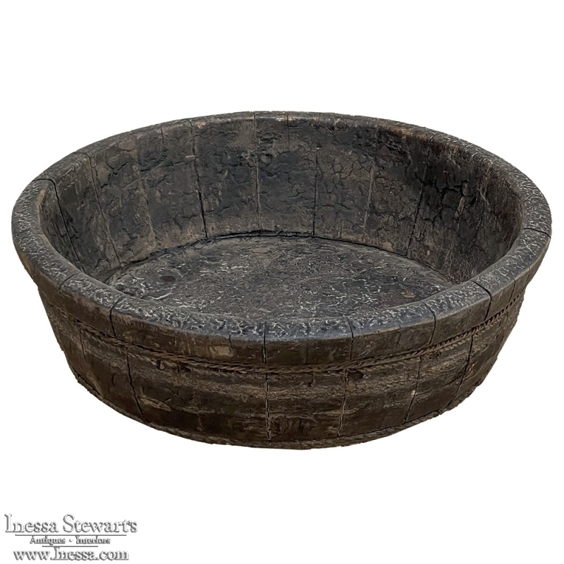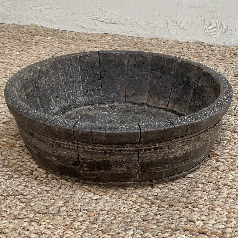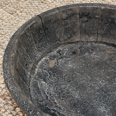 19th Century Rustic European Wooden Bowl was hand-crafted by the village cooper who also made barrels for the community using the same techniques handed down from generation to generation. Sturdy oak staves were steamed and fitted together then secured by hot iron wire that contracted when it cooled to tighten the joints. Perfect as a saucer for a larger pot, as a decorative accent in the garden, or by itself for a rustic or casual interior display!