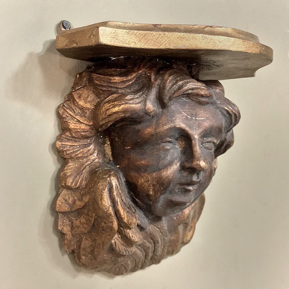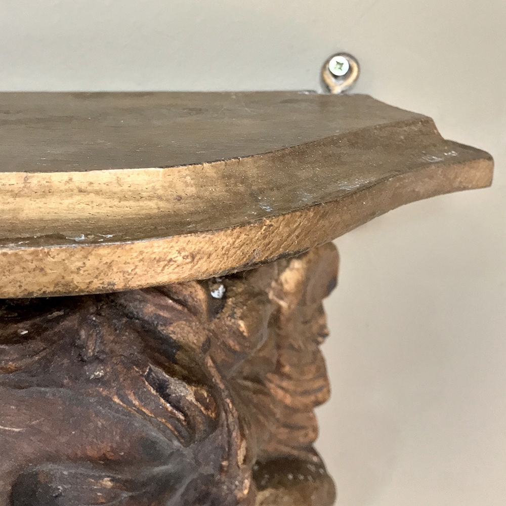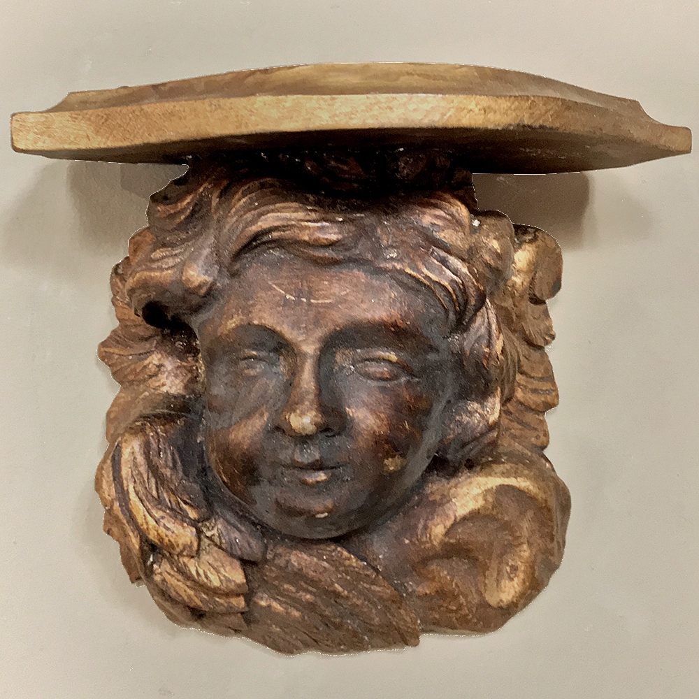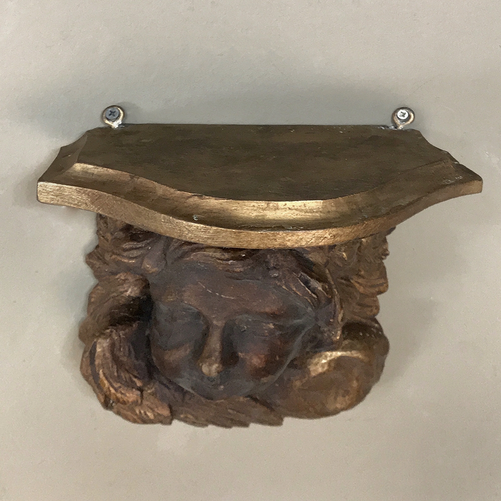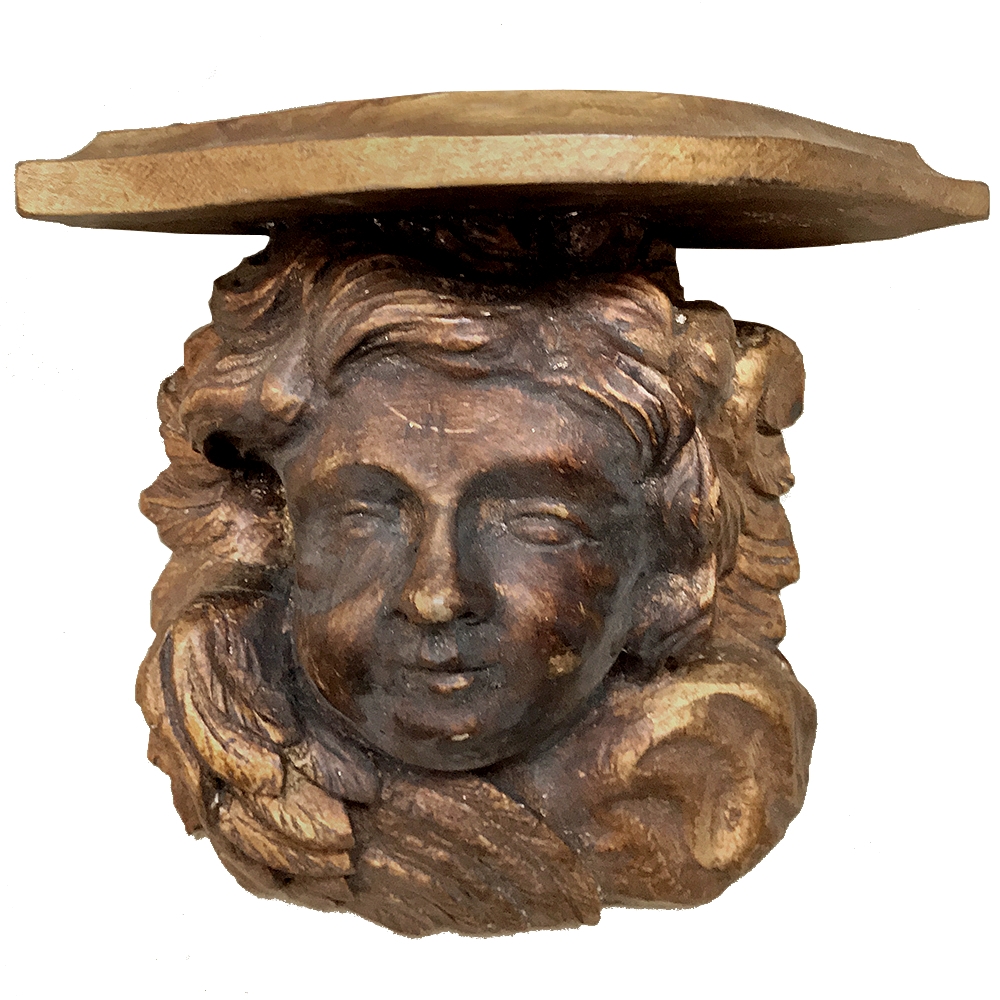 Sale19th Century Wall Sconce Carved with Cherub is a charming way to display a small objet d'art, vase with flowers, or other decoration. Hand-carved from solid wood, it has been finished in a patinaed gold. The angelic face will make you smile each time you pass it by, and has been mated with a contoured and beveled surface perfect for decorative accents that will add to the charm of the sconce itself, although it is decorative enough to be an accessory alone.