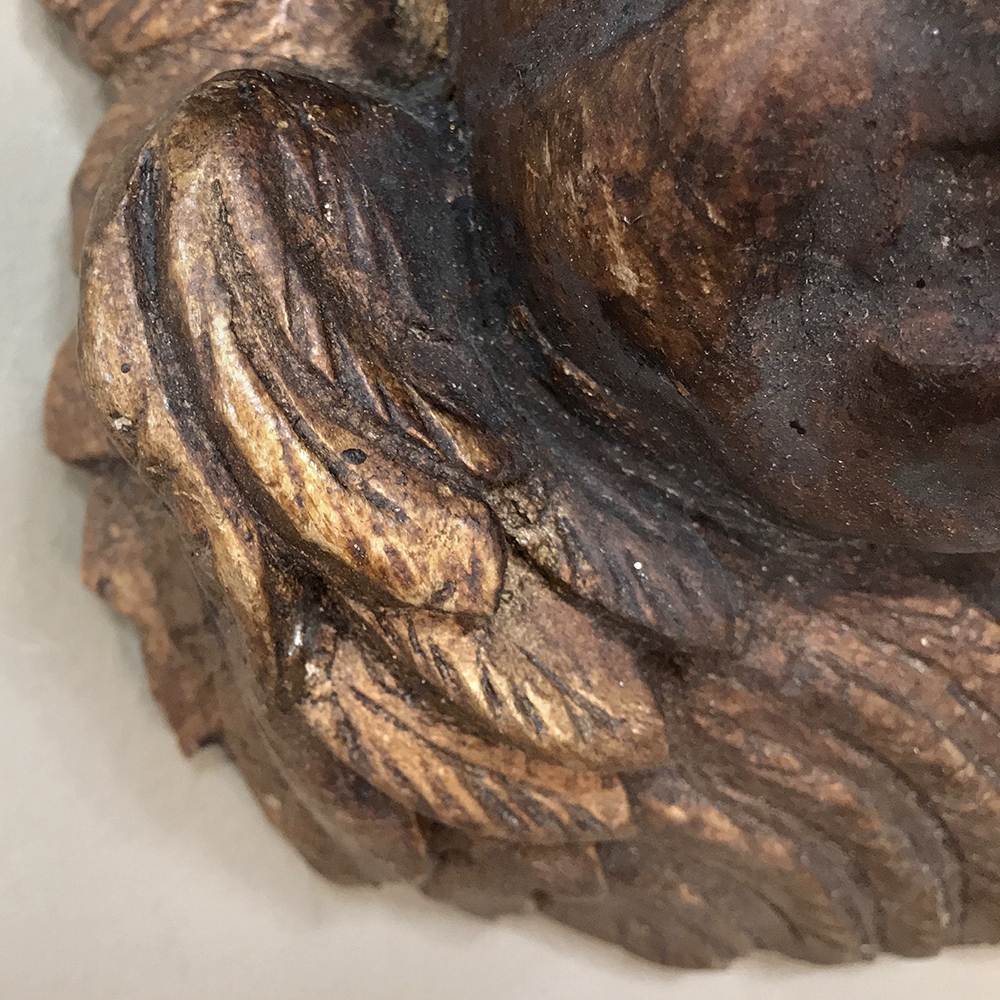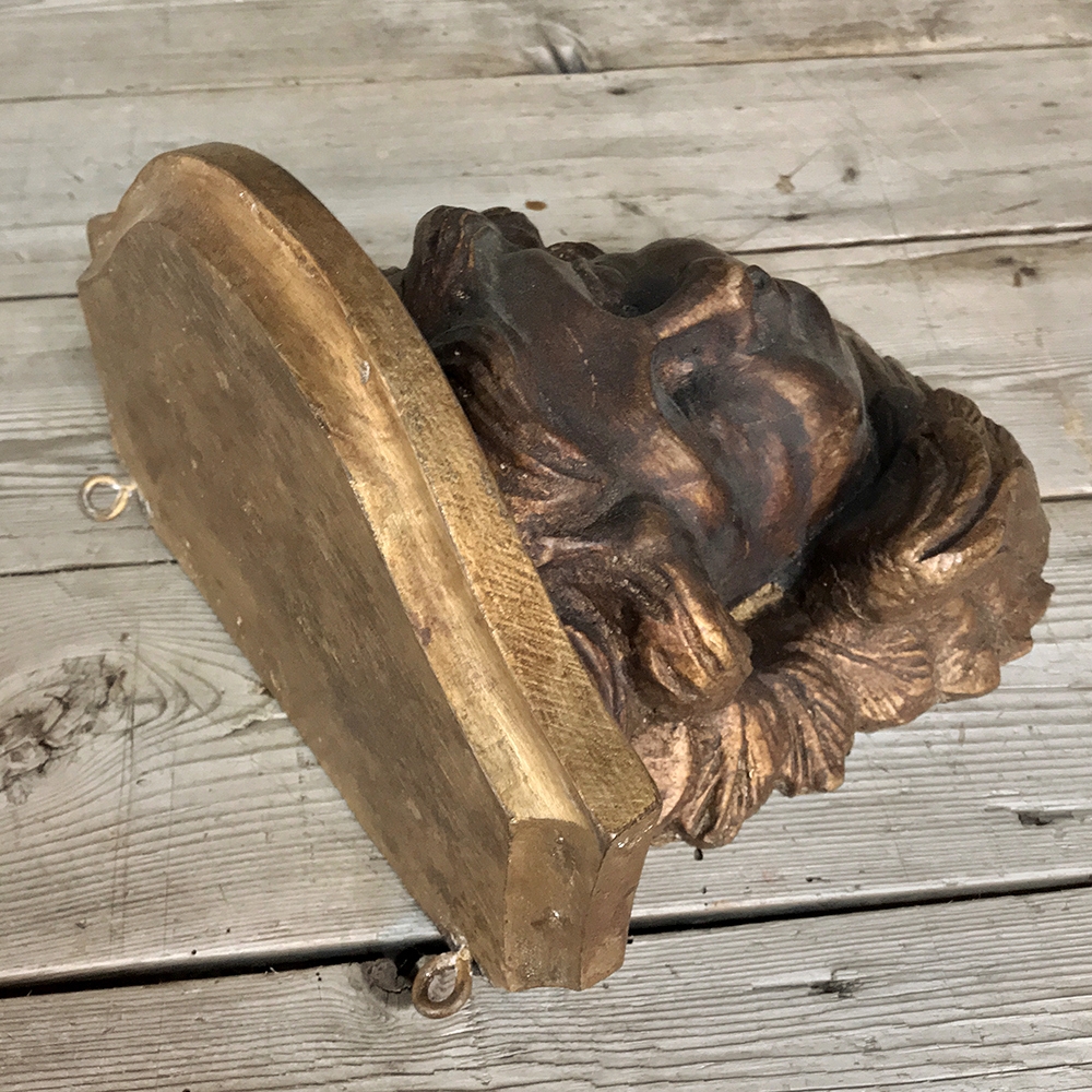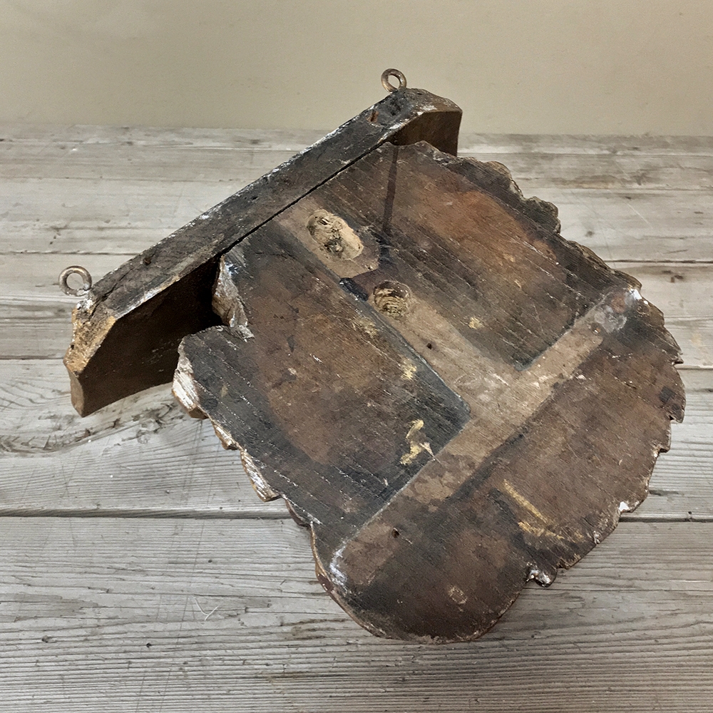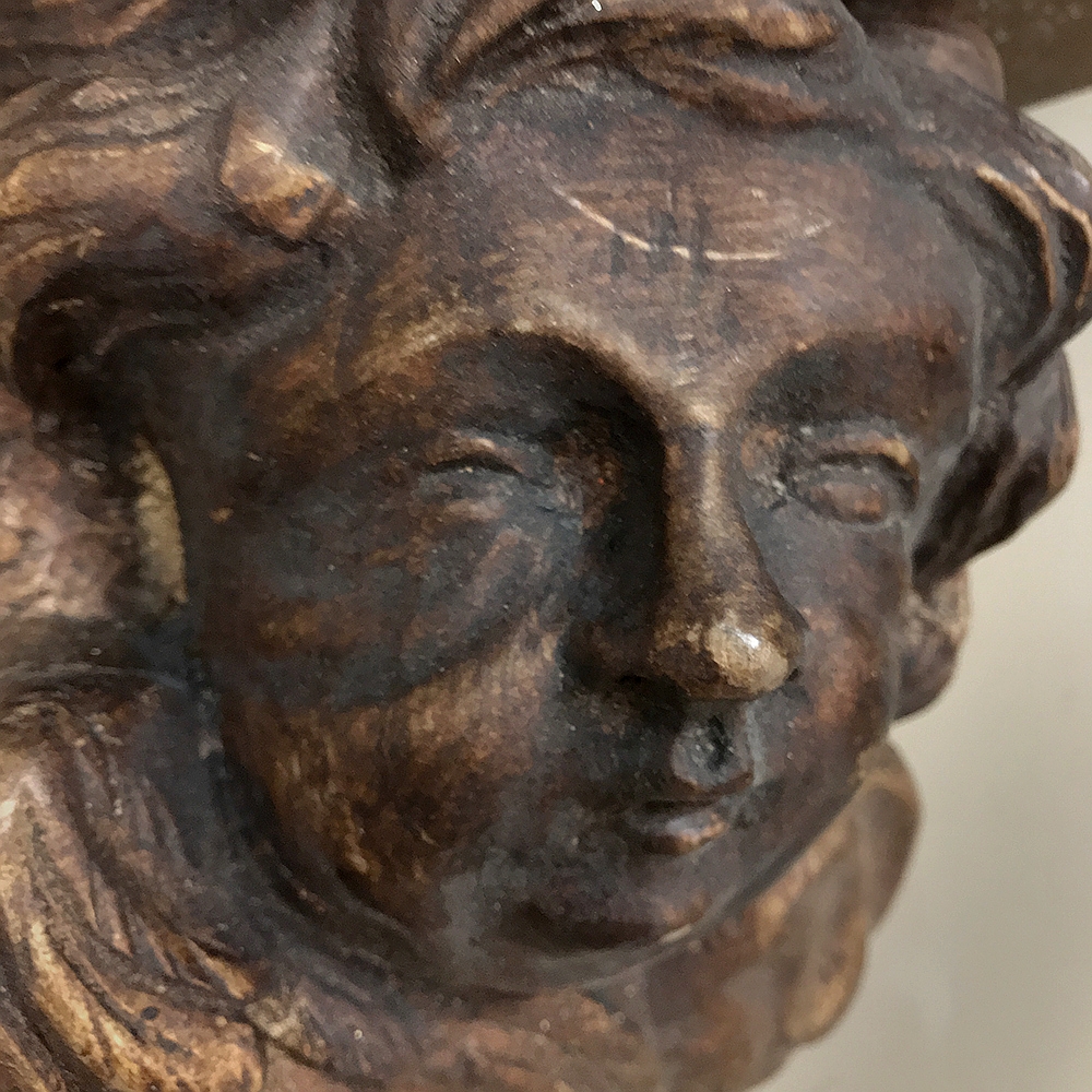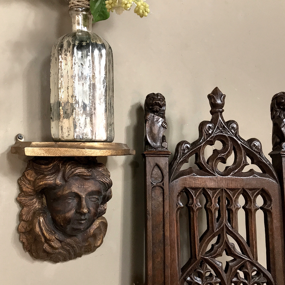 Sale19th Century Wall Sconce Carved with Cherub is a charming way to display a small objet d'art, vase with flowers, or other decoration. Hand-carved from solid wood, it has been finished in a patinaed gold. The angelic face will make you smile each time you pass it by, and has been mated with a contoured and beveled surface perfect for decorative accents that will add to the charm of the sconce itself, although it is decorative enough to be an accessory alone.