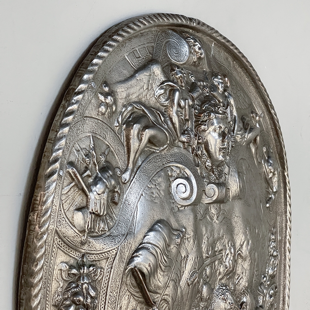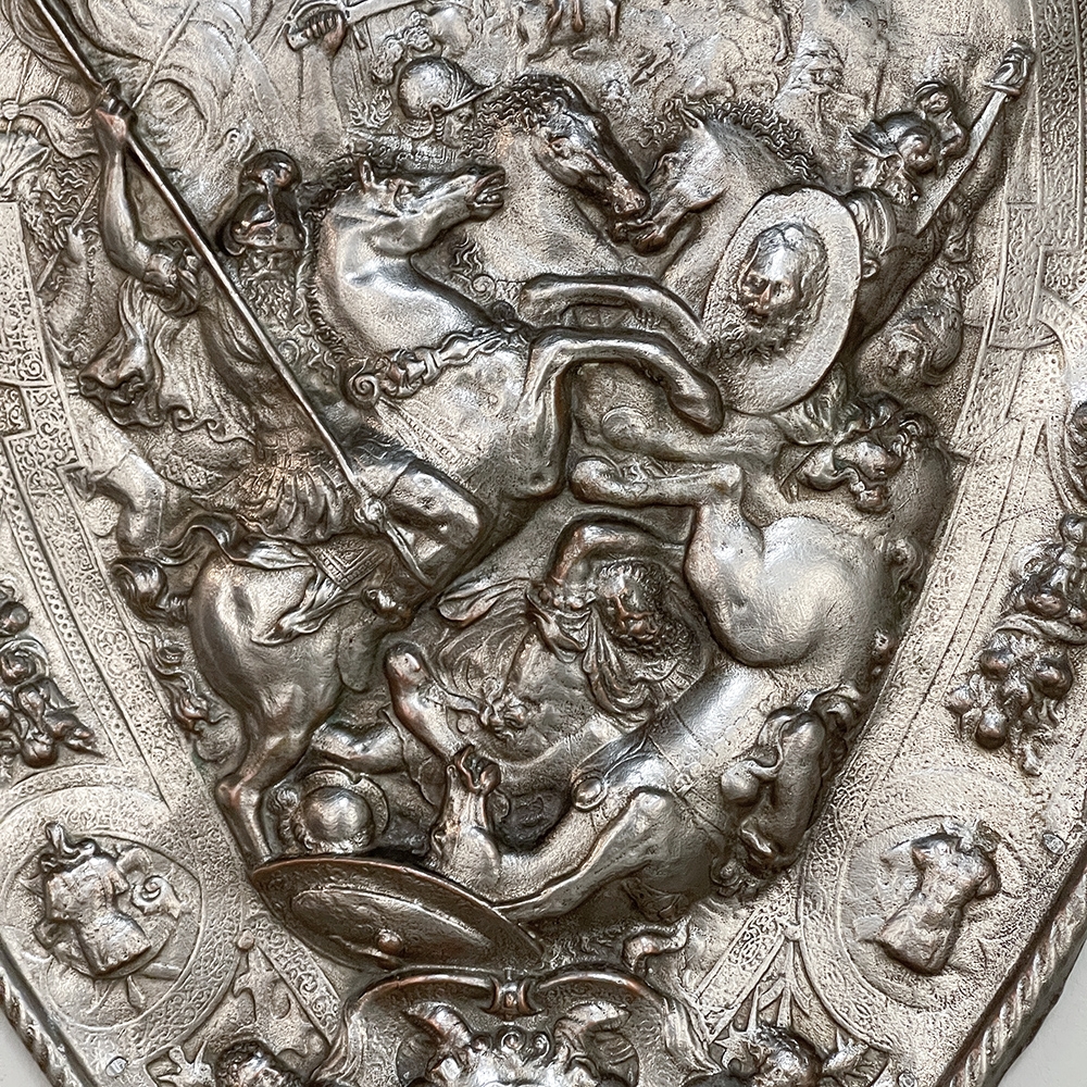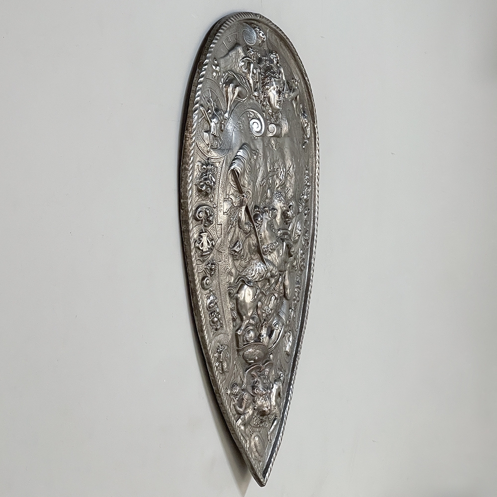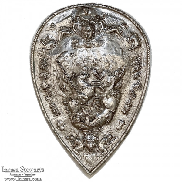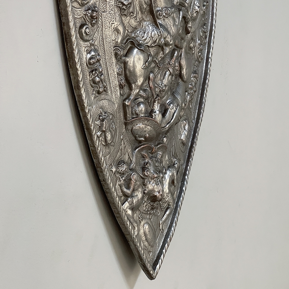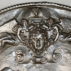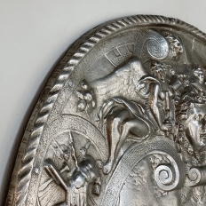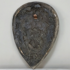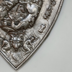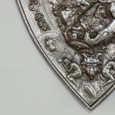 Antique Decorative Nickel-Plated Brass Wall Shield was designed to adorn a masculine decor, featuring a classic shield shape that dates back to ancient Greece, and fully embossed with various symbols of bellicose activity and accouterments, including a ferocious battle scene as the main element. The symbolism both glorifies the warrior and simultaneously portrays the horror of war. Such is the history of the human race. Created from solid embossed brass, it has been given a nickel finish on the front and a coating on the back to resist tarnish.
