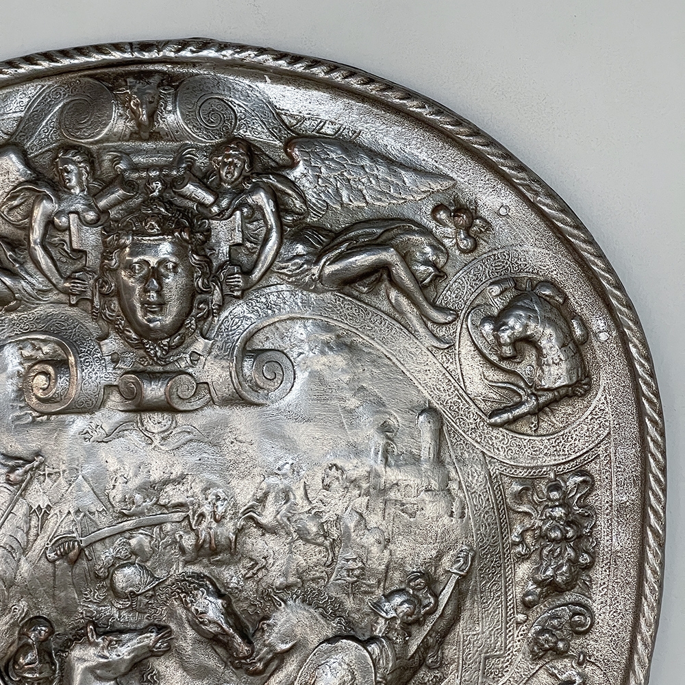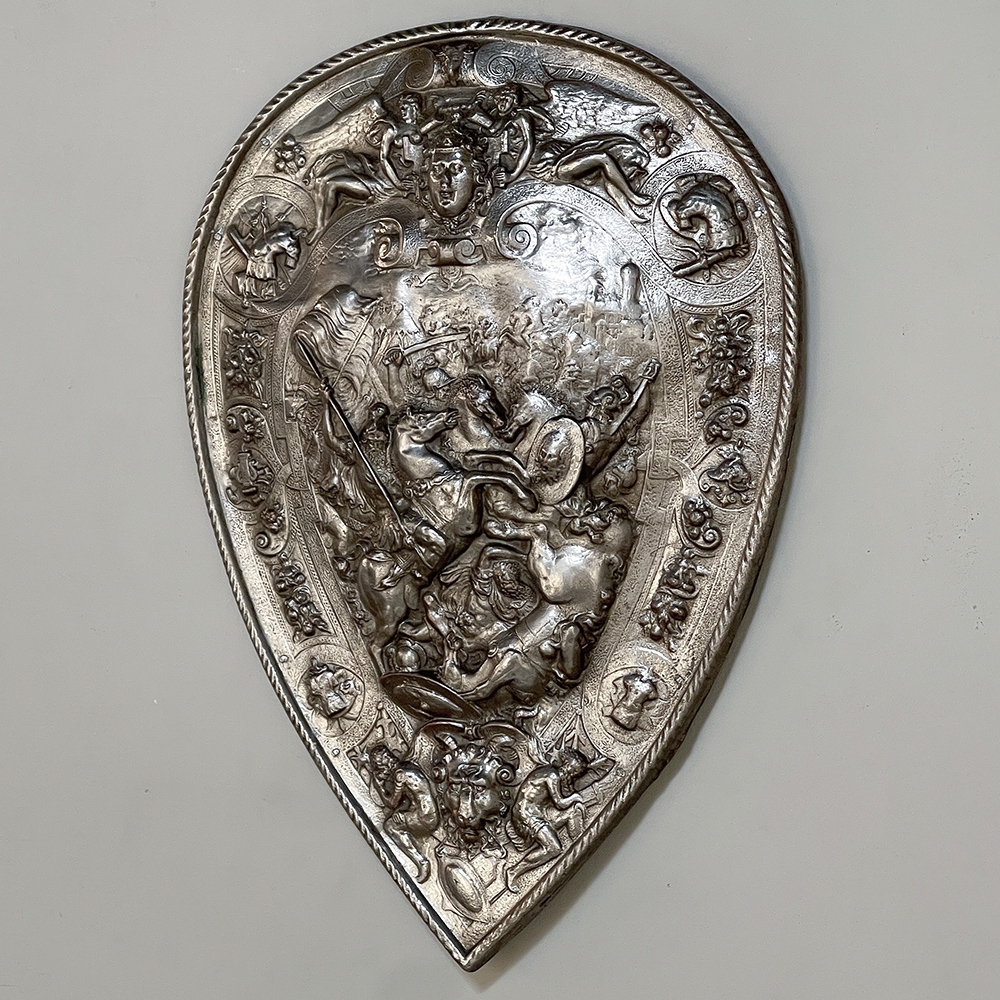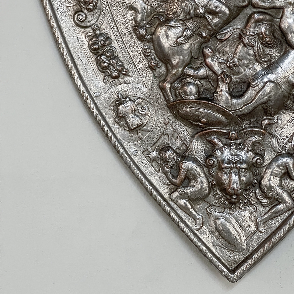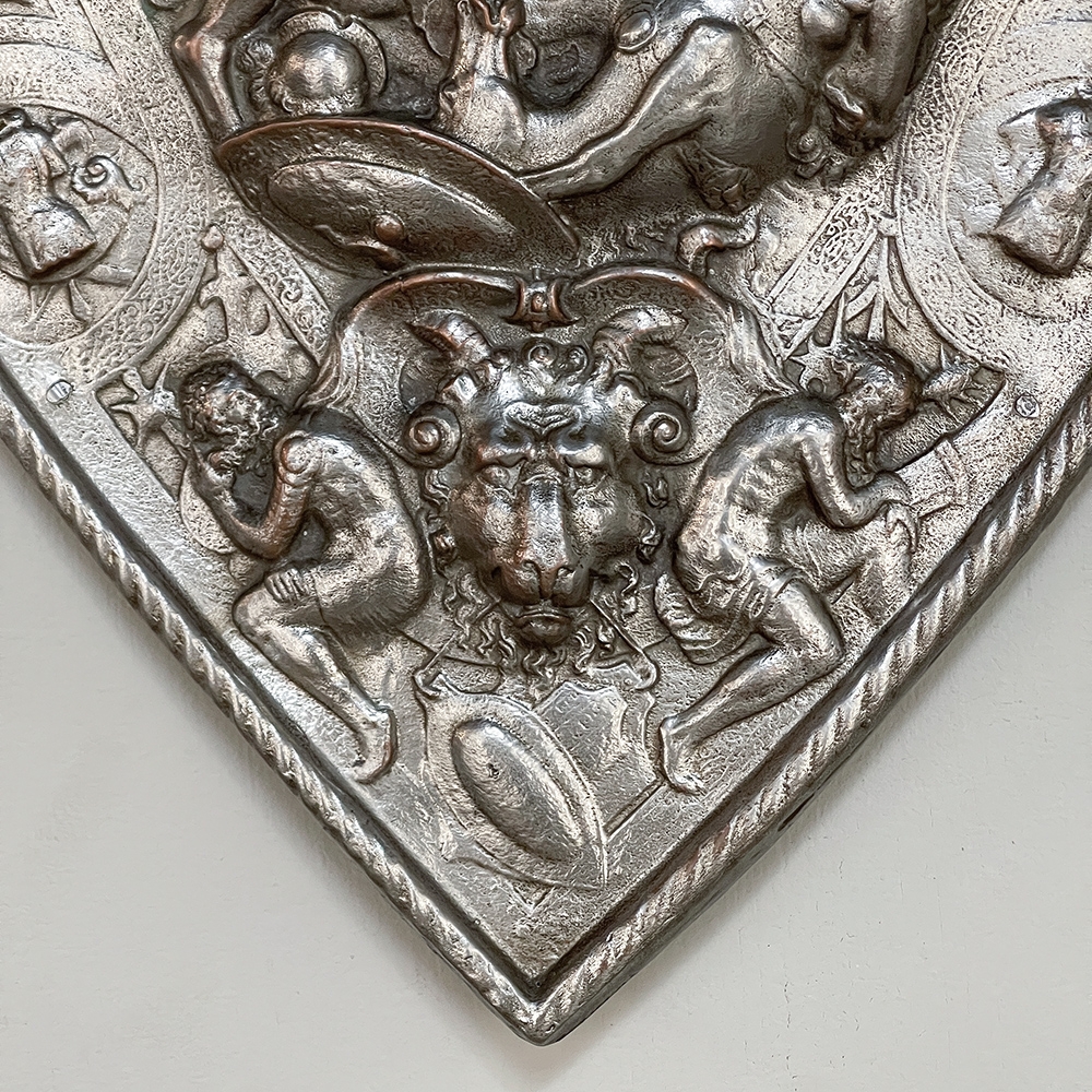 Antique Decorative Nickel-Plated Brass Wall Shield was designed to adorn a masculine decor, featuring a classic shield shape that dates back to ancient Greece, and fully embossed with various symbols of bellicose activity and accouterments, including a ferocious battle scene as the main element. The symbolism both glorifies the warrior and simultaneously portrays the horror of war. Such is the history of the human race. Created from solid embossed brass, it has been given a nickel finish on the front and a coating on the back to resist tarnish.