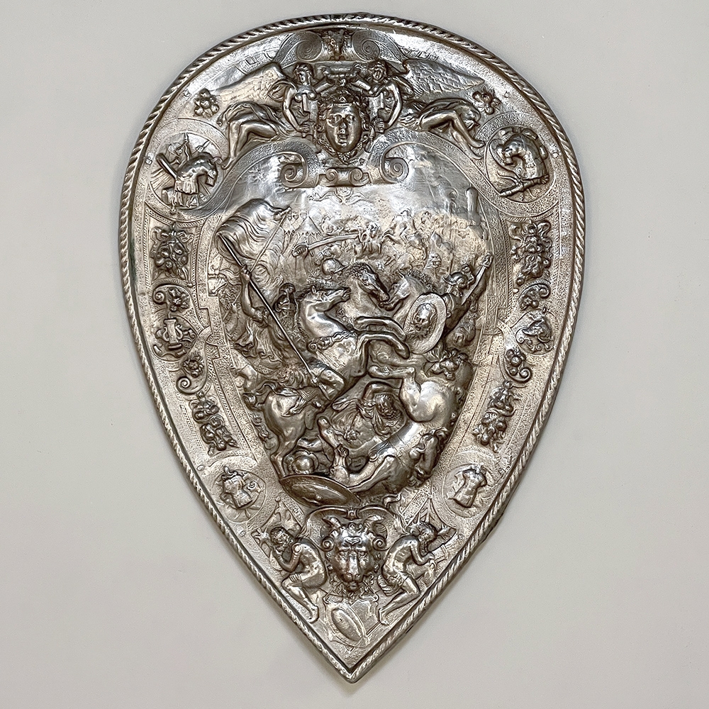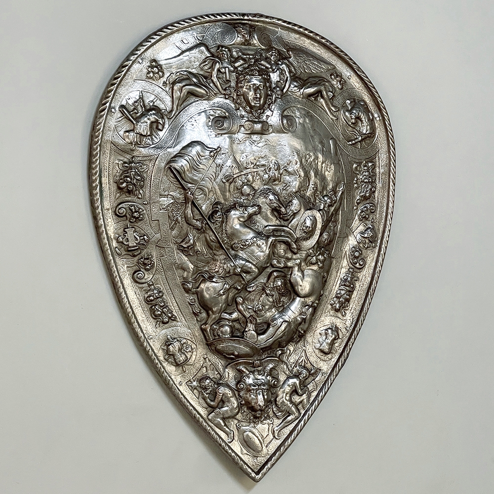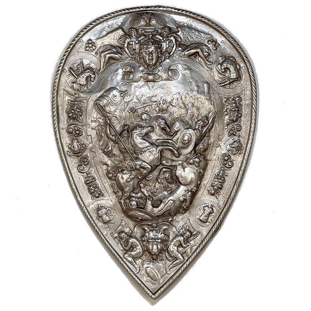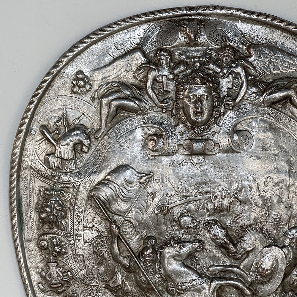 Antique Decorative Nickel-Plated Brass Wall Shield was designed to adorn a masculine decor, featuring a classic shield shape that dates back to ancient Greece, and fully embossed with various symbols of bellicose activity and accouterments, including a ferocious battle scene as the main element. The symbolism both glorifies the warrior and simultaneously portrays the horror of war. Such is the history of the human race. Created from solid embossed brass, it has been given a nickel finish on the front and a coating on the back to resist tarnish.