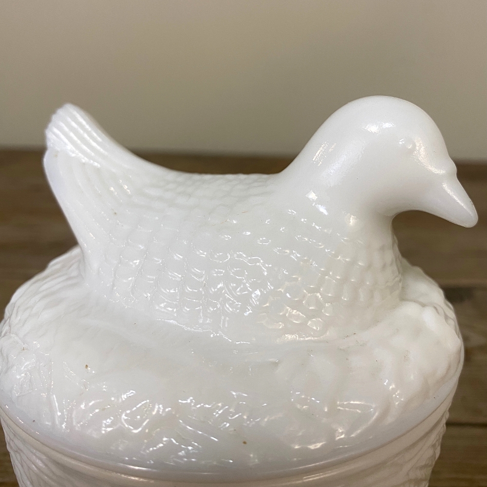 Antique French White Opaline 'Birdbox' Sugar Cellar by Portieux Vallerysthal is a lovely decorative accessory for your dining enjoyment, and depicts a nesting bird with finely detailed pattern on the entire exterior surface.