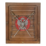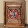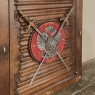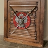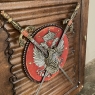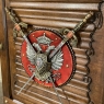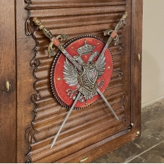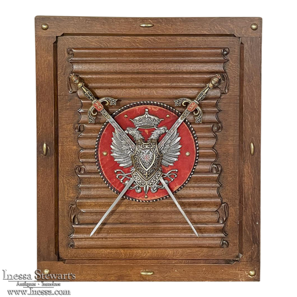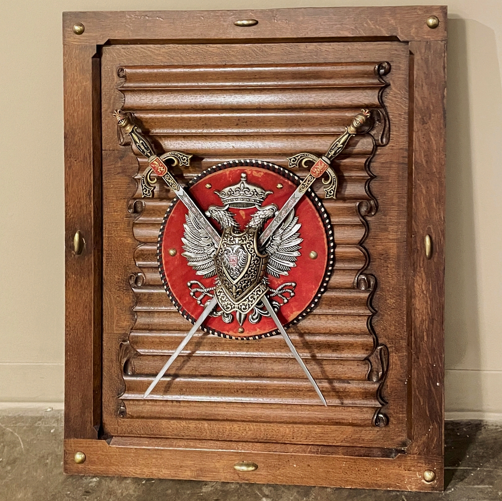 Antique Gothic Display Plaque with Swords & Double-Headed Eagle is an ideal choice to accessorize the masculine decor! The panel was rendered in solid oak, and features brass tacks around the otherwise unadorned frame encircling a linenfold panel upon which the primary artform has been mounted. A circular plaque in red provides the background for a double headed eagle with regal crown rendered in steel and providing three dimensional effect, enhanced even more by the intricately detailed breastplate of armor into which two highly decorated long daggers or short swords have been inserted. The hilts of the swords feature knight's helmets and fleurs de lys, with embellished guards and finely designed blades, all hand-painted to enrich the detail. The symbolism is intriguing, as the polycephalous eagle is most recently associated with the Austrian, German and Russian empires, but in fact dates back to the Bronze age, and was used early on by the Hittites over four millennia ago! The fleur de lys is also an ancient symbol, most commonly associated with ancient French culture, but appearing worldwide and expressing various religious and secular symbolisms. The perfect gift for the man of the house!