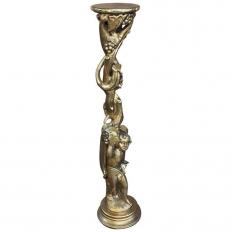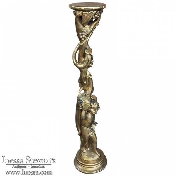 SaleThis stunning Antique Italian Giltwood Baroque Pedestal remains in exceptional condition, and was hand-sculpted from solid wood to depict a cherub amongst fully laden grapevines before being given a luxurious gold finish. Perfect for displaying a special objet d'art or just as a decoration unto itself! The gold finish has achieved a nice patina over the past few decades.