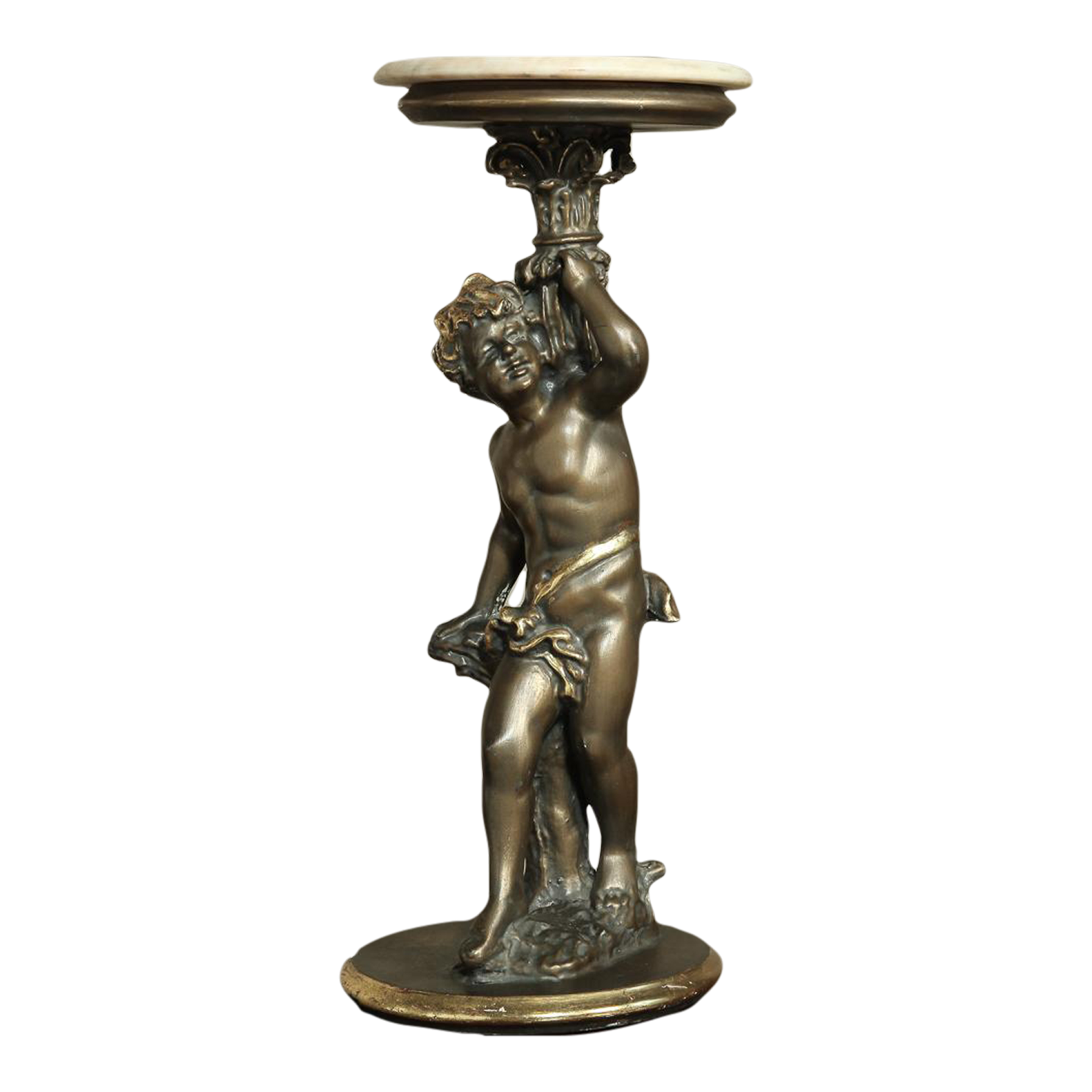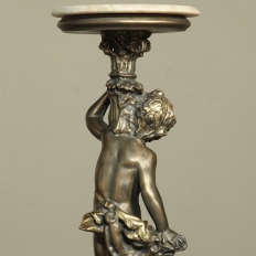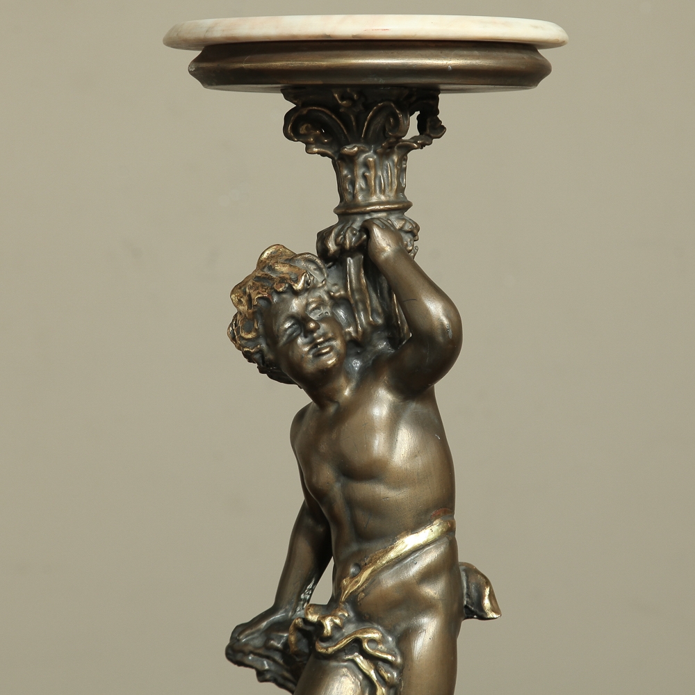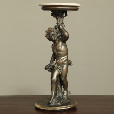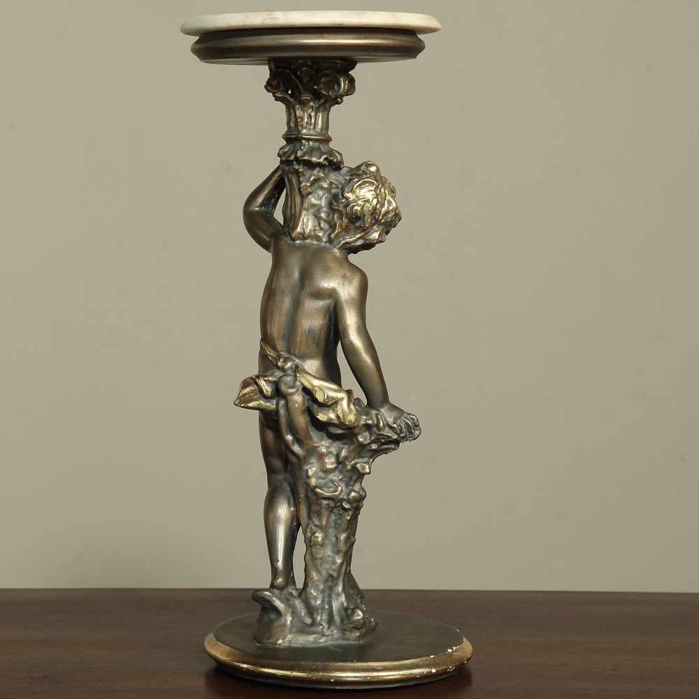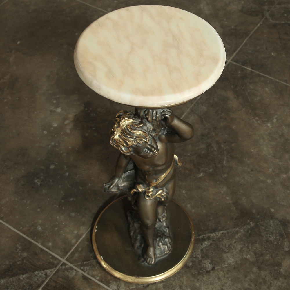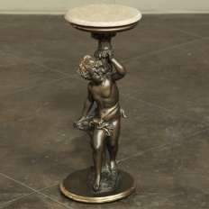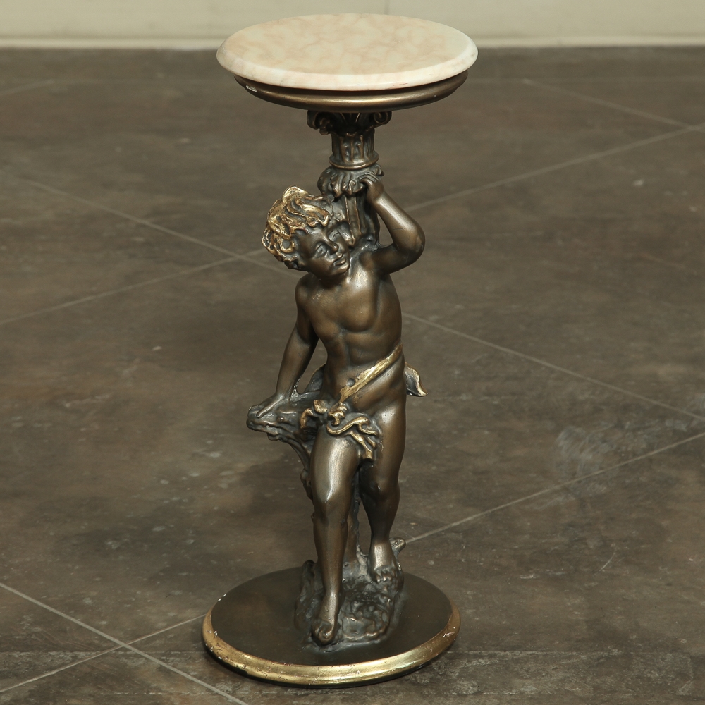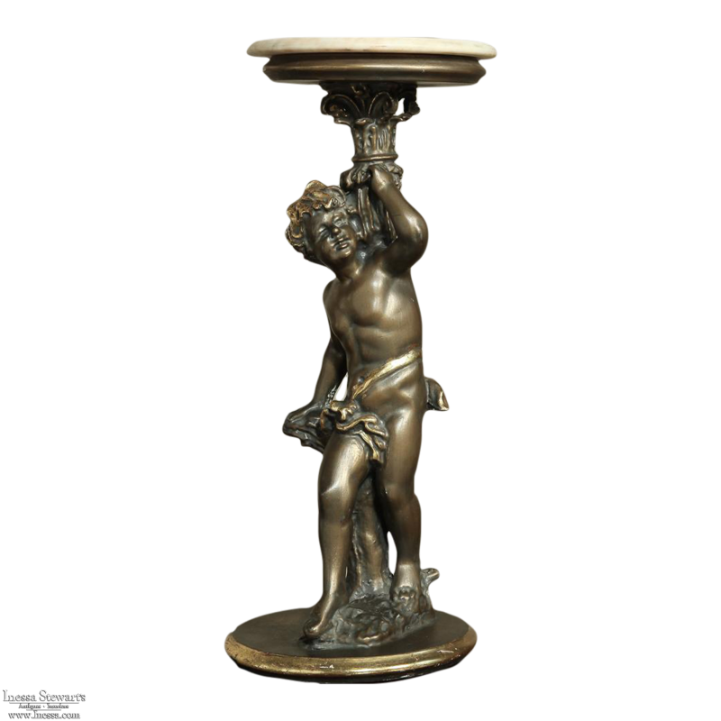 Antique Italian Giltwood Pedestal with Carved Cherub & Marble Top is an excellent way to display a favorite statue, vase of fresh flowers, or objet d'art! The statue features a two toned bronze & gold coloration with polychrome finish which accentuates the charming realism of the cherub who is carefully holding the pedestal surface above which has been topped with luxurious neutral colored marble.
