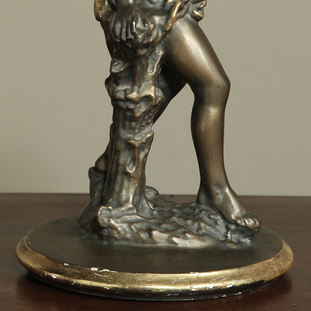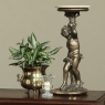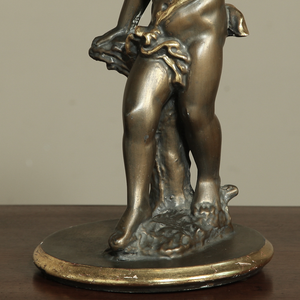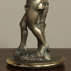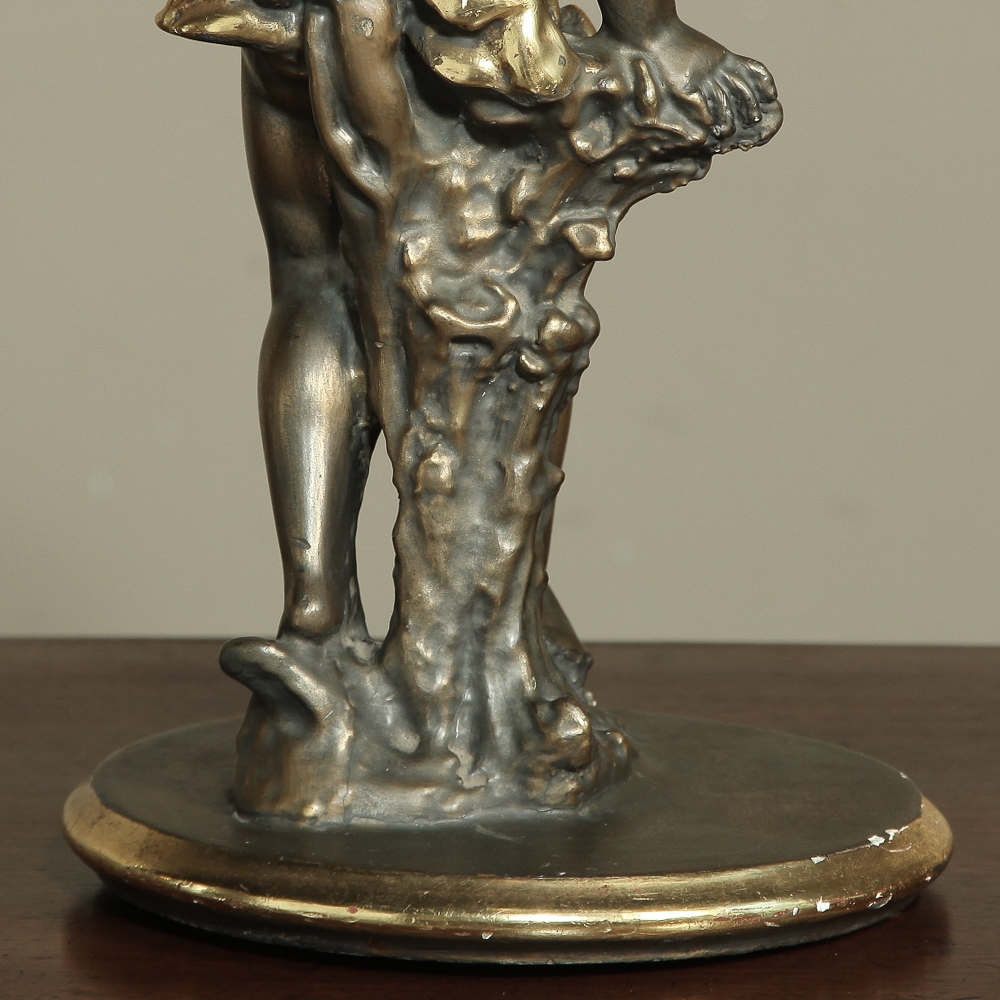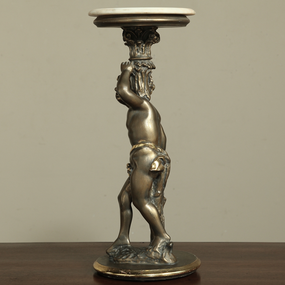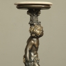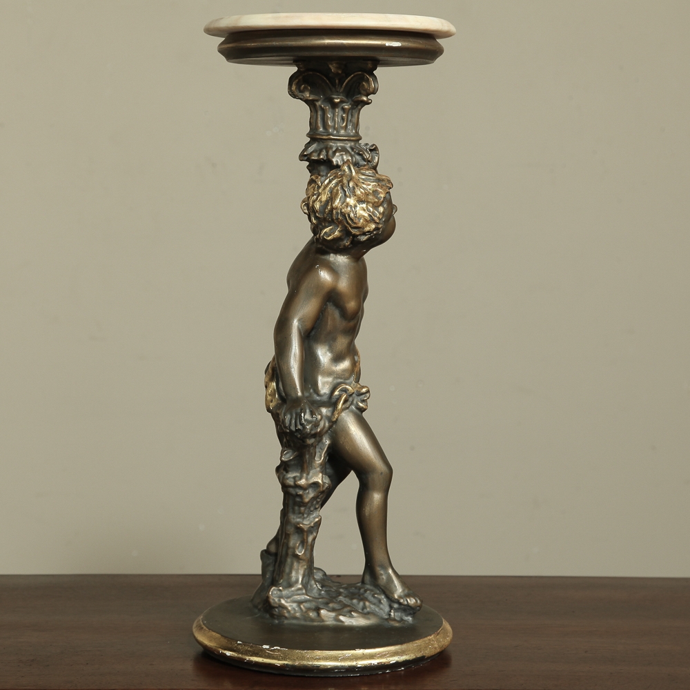 Antique Italian Giltwood Pedestal with Carved Cherub & Marble Top is an excellent way to display a favorite statue, vase of fresh flowers, or objet d'art! The statue features a two toned bronze & gold coloration with polychrome finish which accentuates the charming realism of the cherub who is carefully holding the pedestal surface above which has been topped with luxurious neutral colored marble.