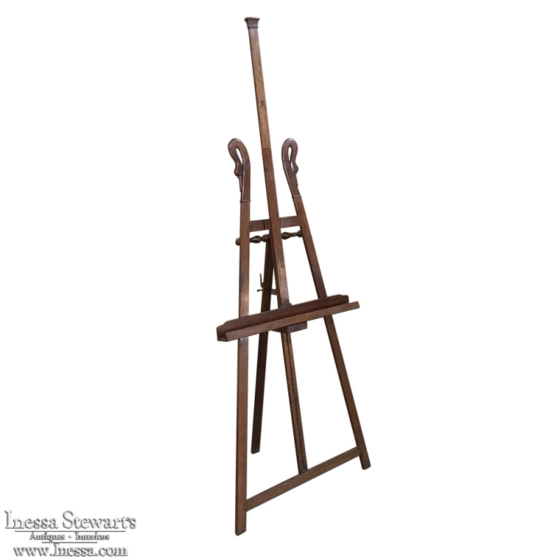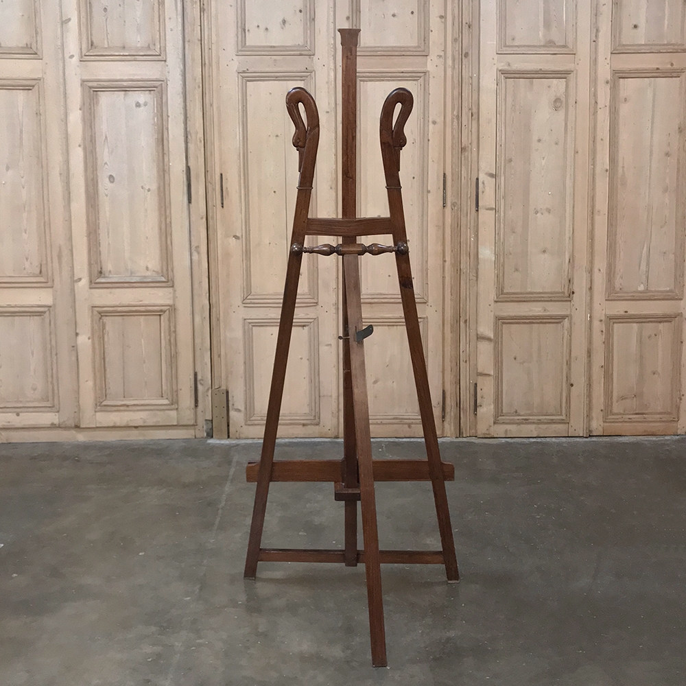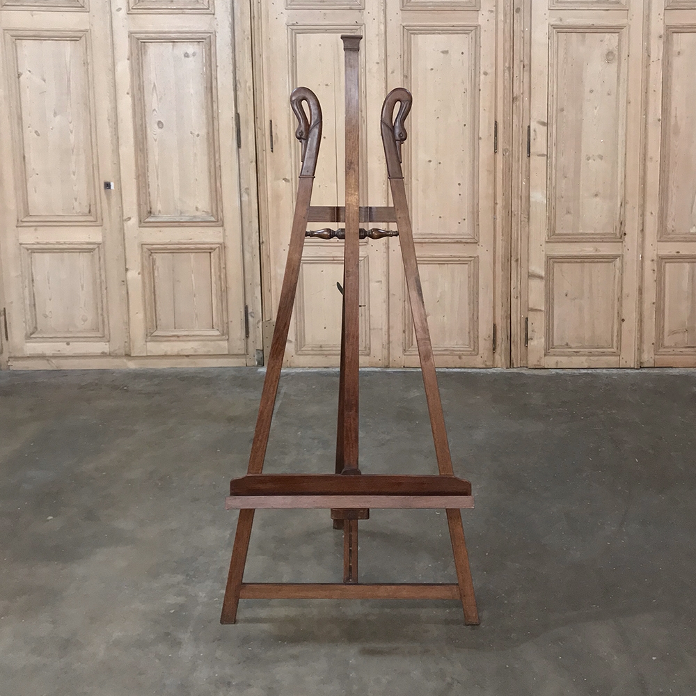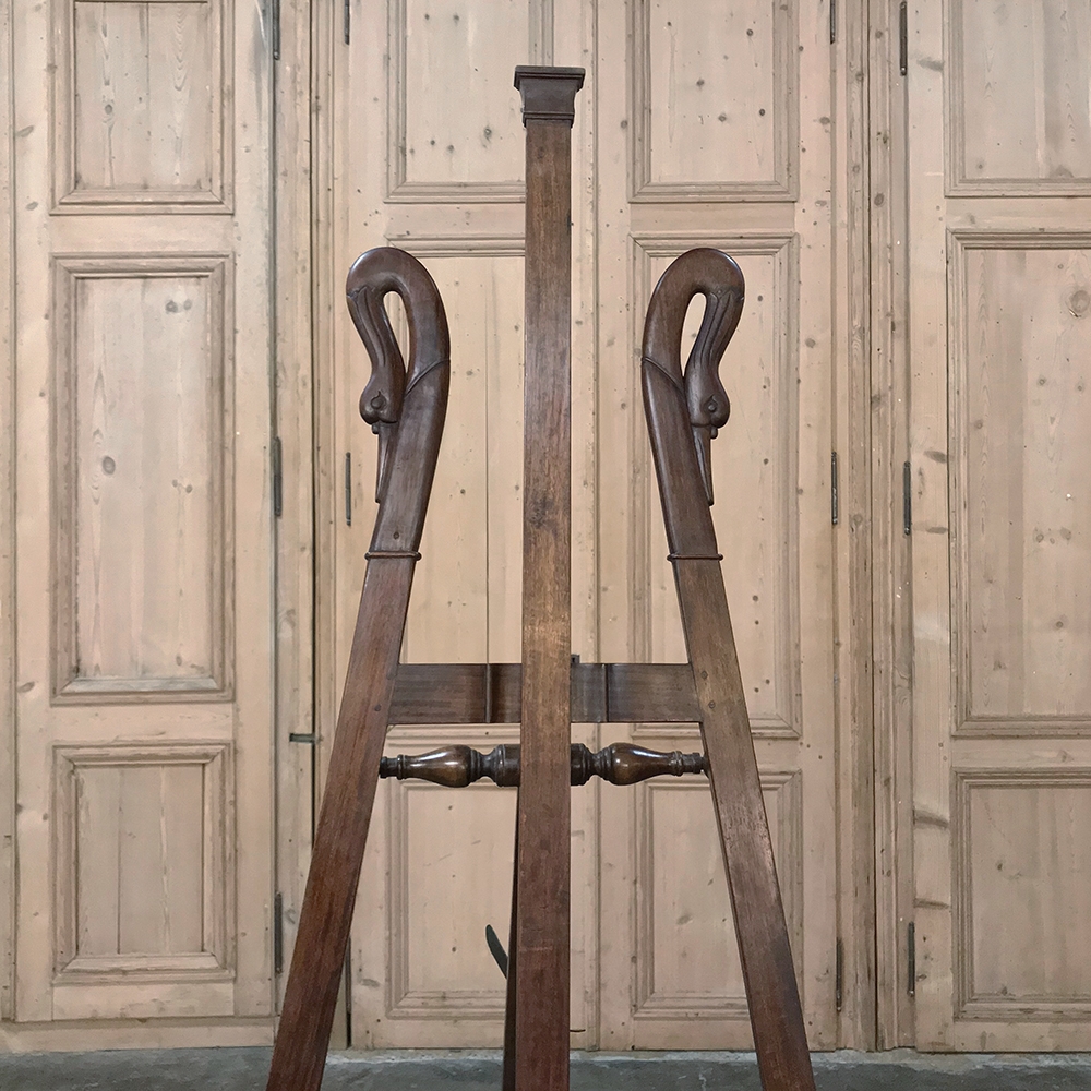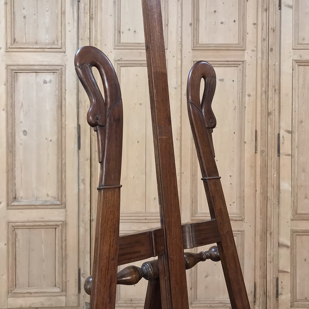 Antique Mahogany Empire Style Display Easel is ideal for open floor plans allowing one to display a piece of art anywhere in the room when wall space is at a premium! Hand-crafted from imported mahogany, it features swans' heads as detailing, and the platform is adjustable to accommodate a range of painting sizes.