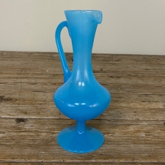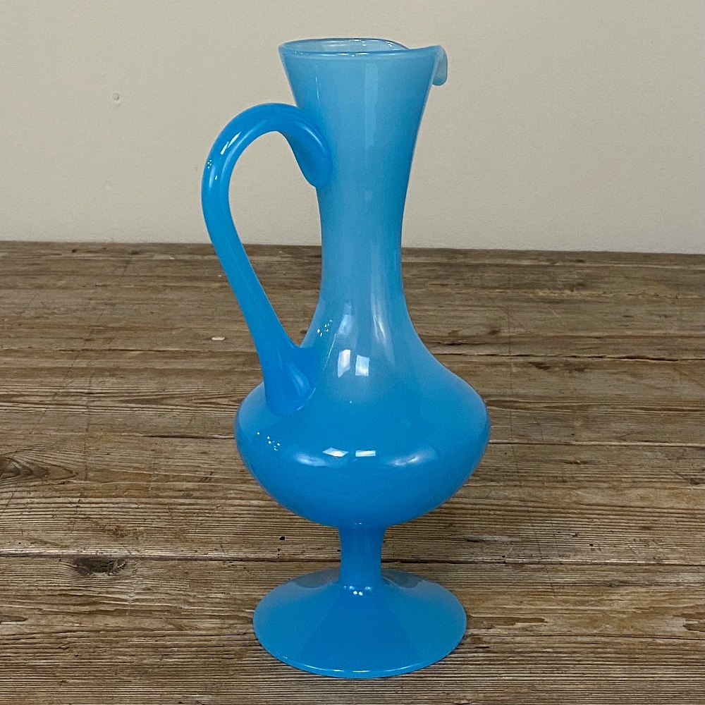 Mid-Century Hand-Blown French Blue Opaline Glass Ewer is an elegant and charming accent piece that collectors adore, and such items are also popular for adding a splash of color to any table top.