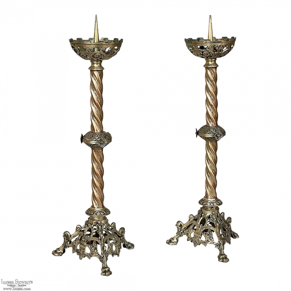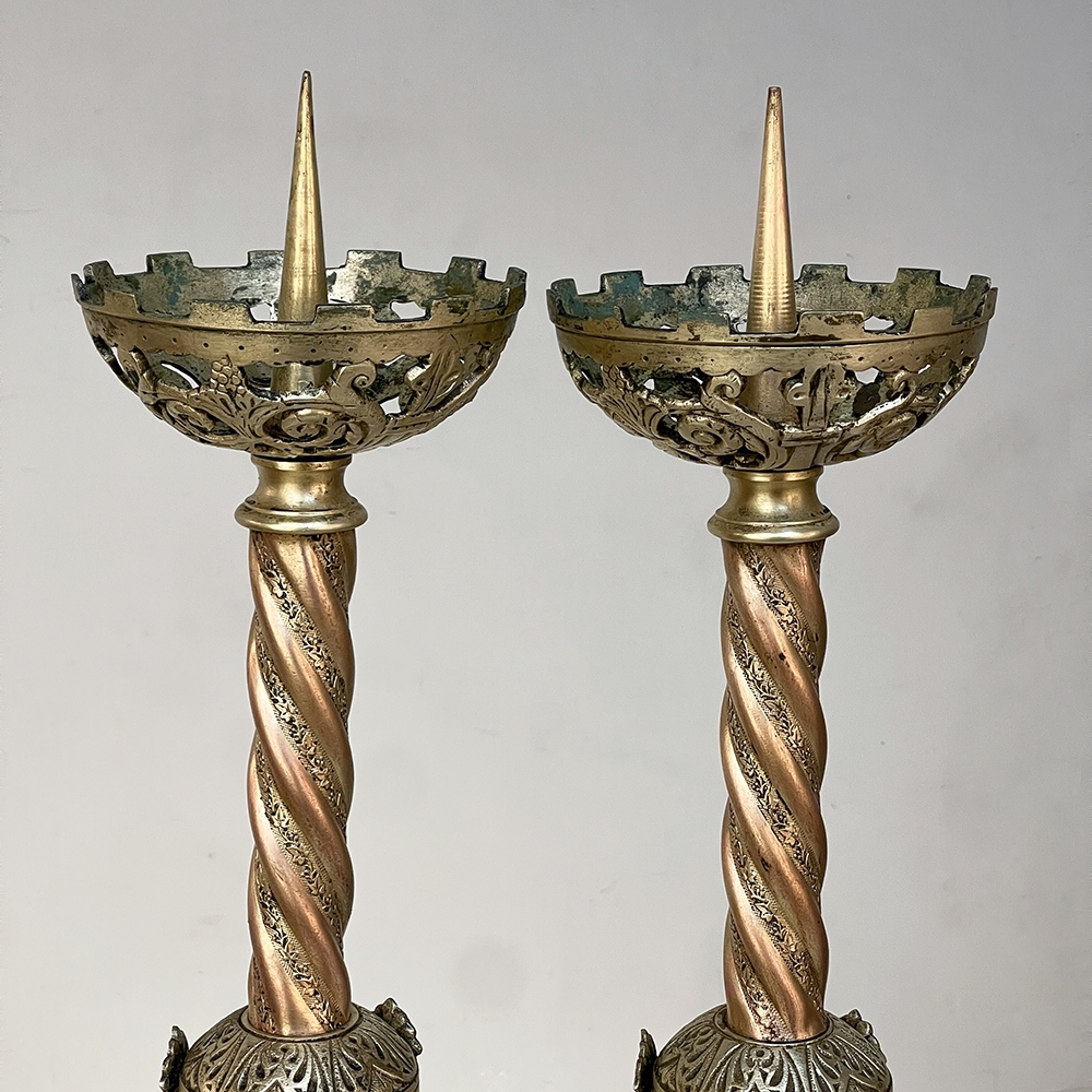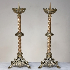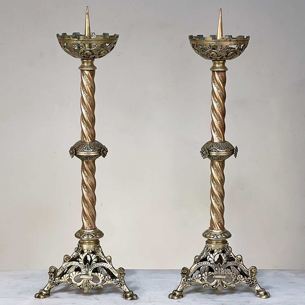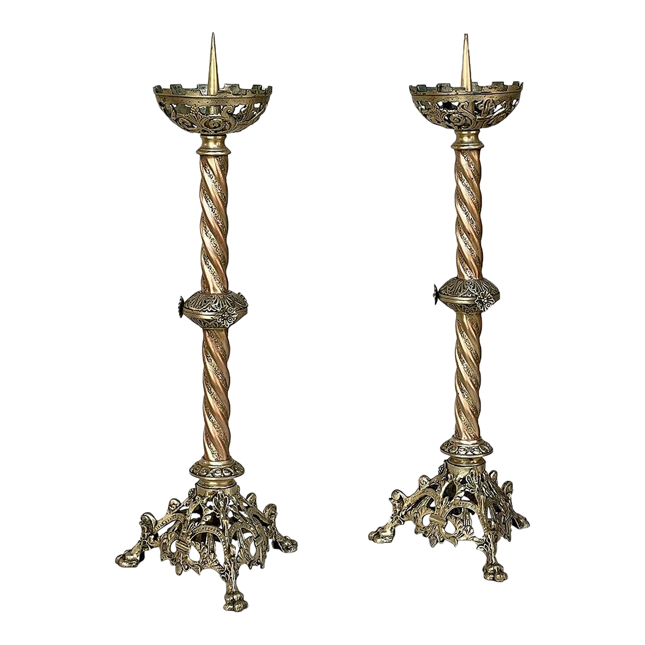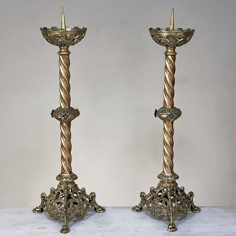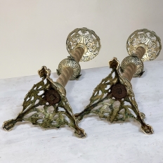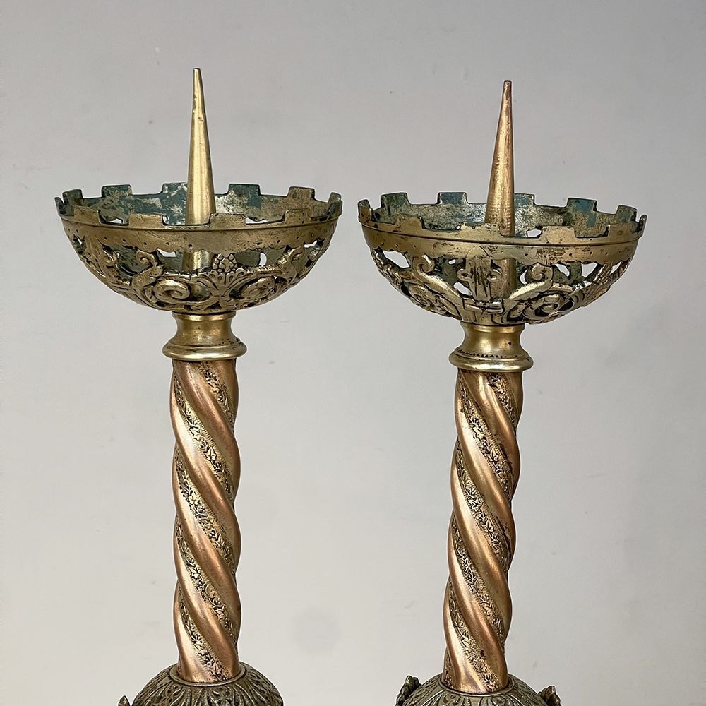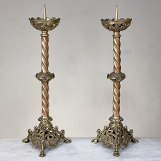 Pair 19th Century Renaissance Revival Bronze Candlesticks are a wonderful example of the transition from the ancient Gothic style to the blossoming Renaissance with its celebration of life and all creation, as well as mankind's artistic ascendancy. Created on a sectional design, it features a solid cast pierced bobeche on top to hold the pillar candle, with spiral column leading halfway down to a finely detailed segment ring, then another spiral column connected to the elaborately and artfully cast tripod base. Such very decorative candlesticks recall a time prior to electric lighting, when candles were indispensable sources of light for all households, yet only those most affluent ones would be able to afford such fine examples. In many cases, such exquisitely artistic candlesticks would be donated to local churches for all the parishioners to appreciate and enjoy!