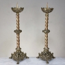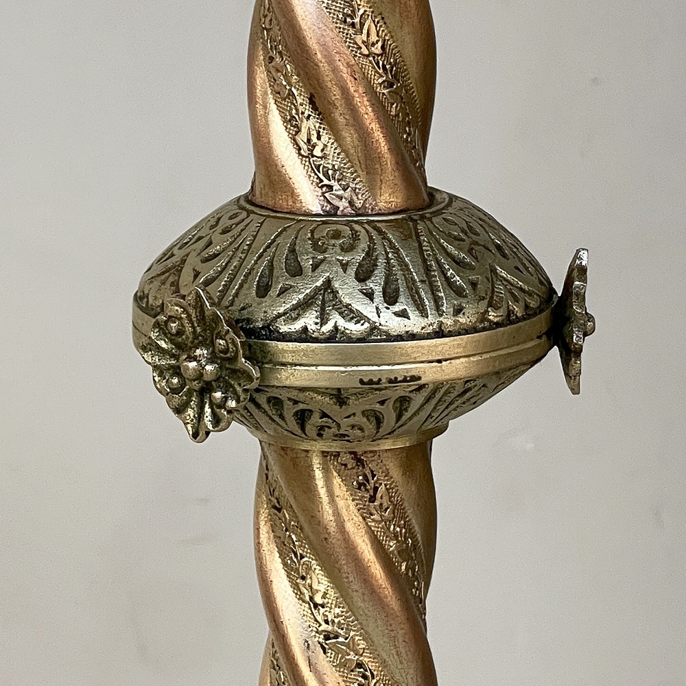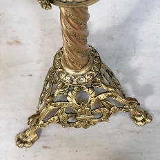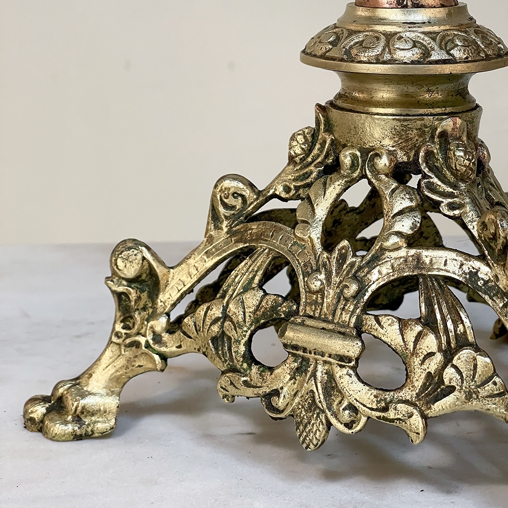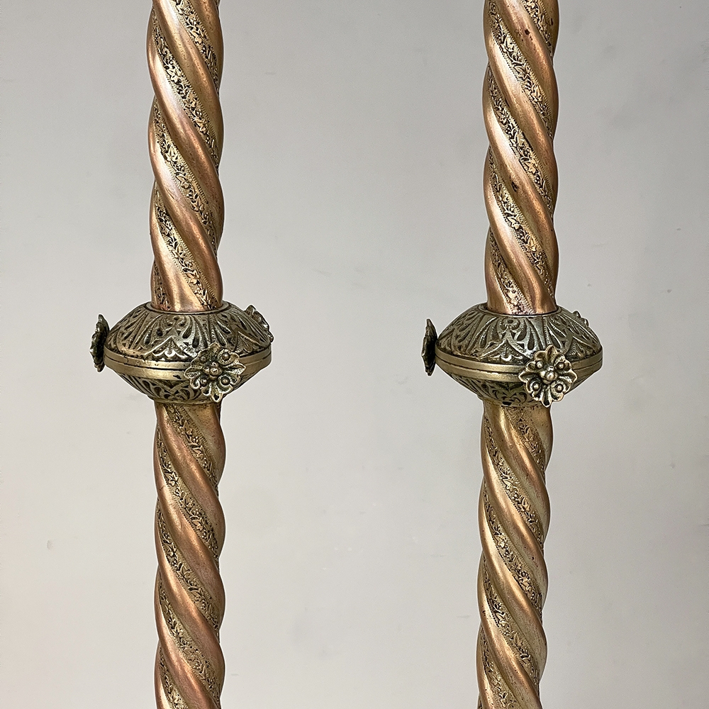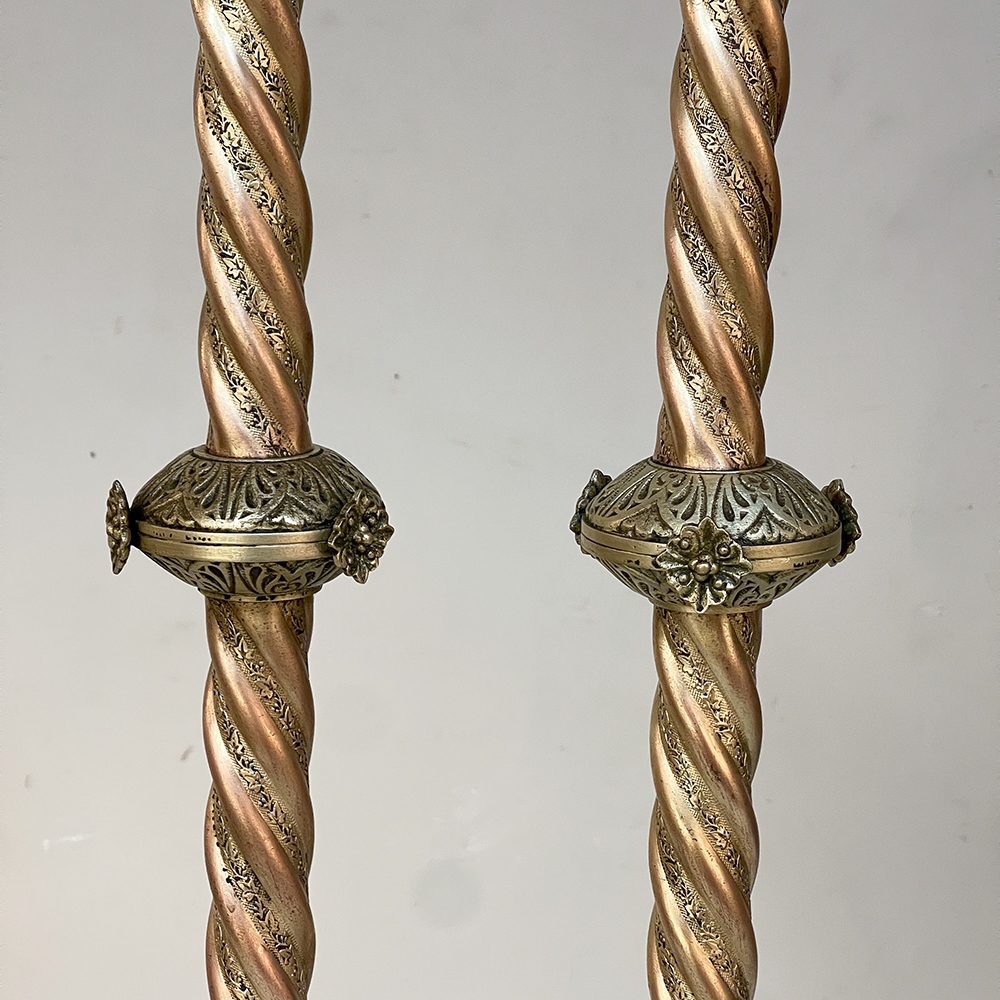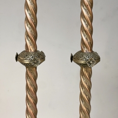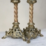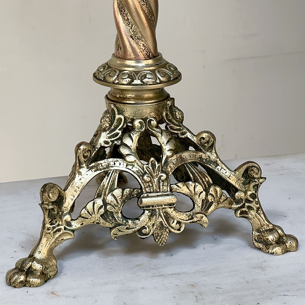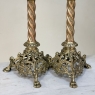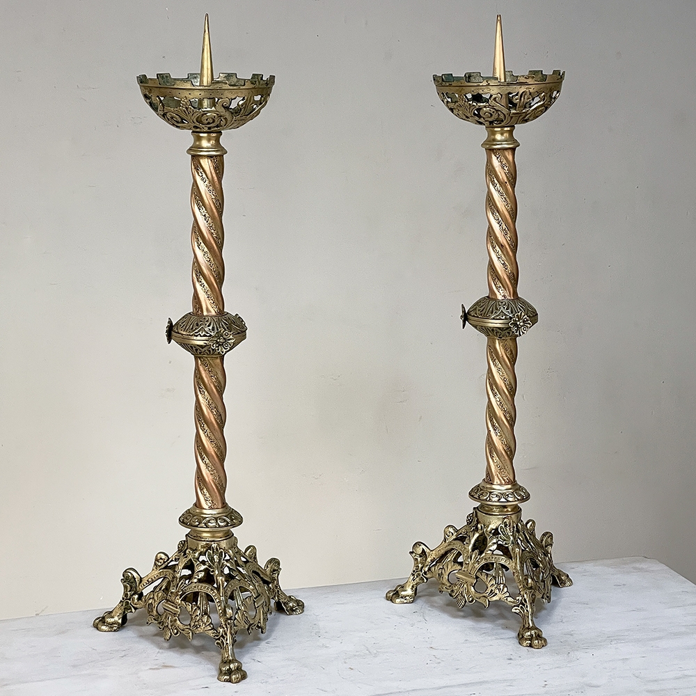 Pair 19th Century Renaissance Revival Bronze Candlesticks are a wonderful example of the transition from the ancient Gothic style to the blossoming Renaissance with its celebration of life and all creation, as well as mankind's artistic ascendancy. Created on a sectional design, it features a solid cast pierced bobeche on top to hold the pillar candle, with spiral column leading halfway down to a finely detailed segment ring, then another spiral column connected to the elaborately and artfully cast tripod base. Such very decorative candlesticks recall a time prior to electric lighting, when candles were indispensable sources of light for all households, yet only those most affluent ones would be able to afford such fine examples. In many cases, such exquisitely artistic candlesticks would be donated to local churches for all the parishioners to appreciate and enjoy!