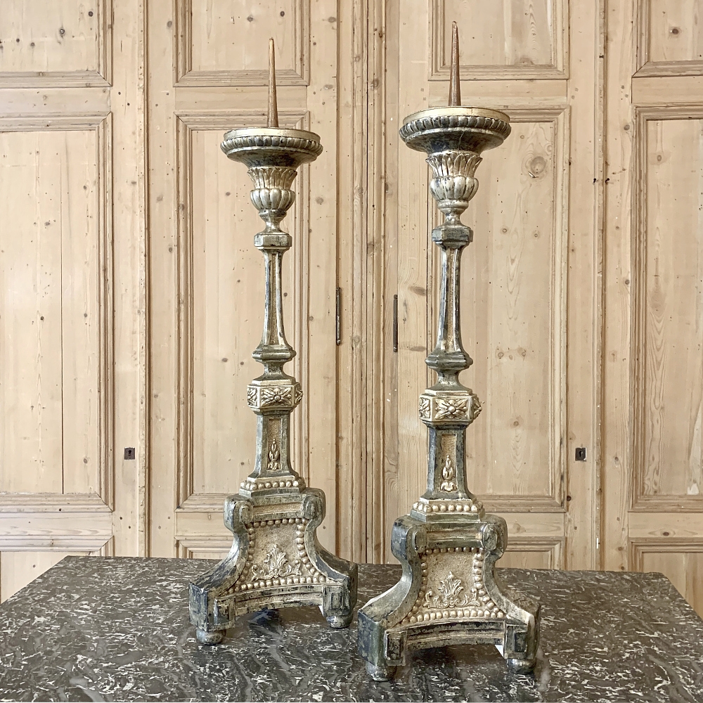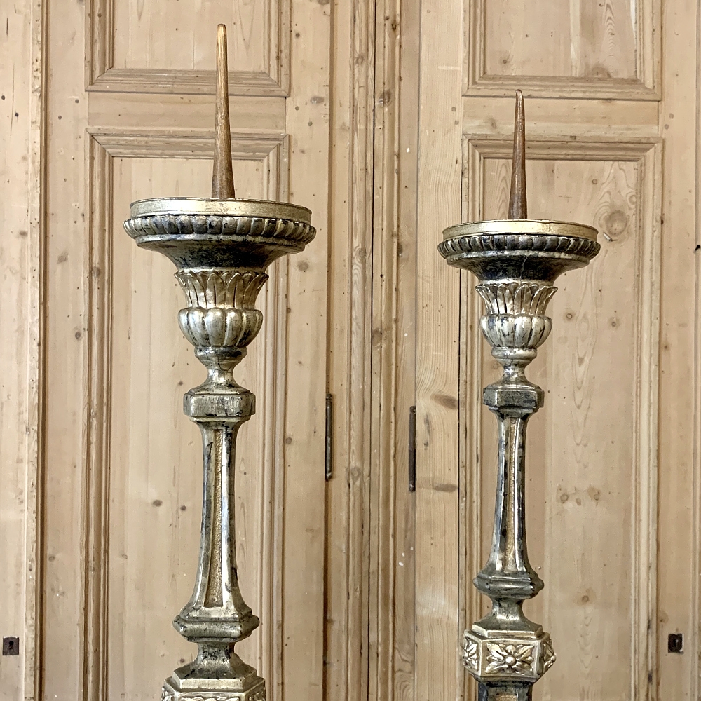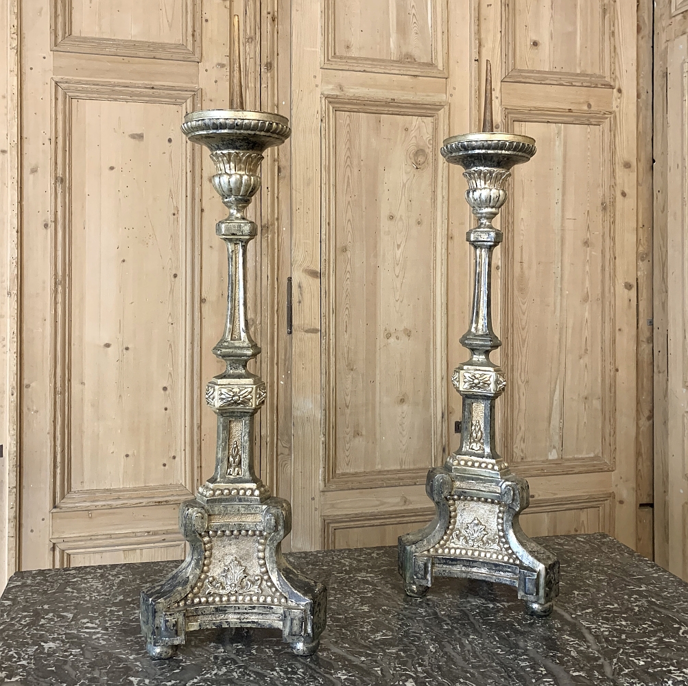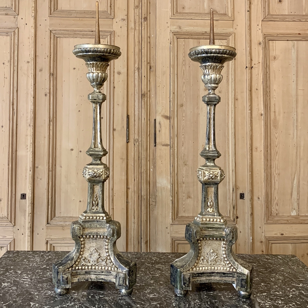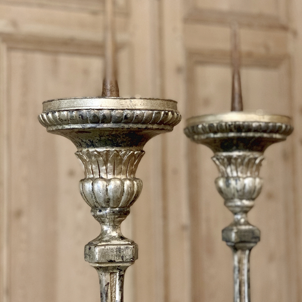 Pair of Amazing 18th Century Italian Neoclassical Silver Gilt Church Altar Candlesticks crafted with acanthus leaf motifs and silver rosettes. Created in Italy during the 18th century, each of these exquisite silver gilt candlesticks features a hand carved stem adorned with a graceful design that creates a subtle yet elegant accentuation, attracting and leading the eye throughout the piece. Each piece is raised on a tripod base whose concave neoclassical lines contrast beautifully with the curvature of the top. With their tall proportions, lovely silver finish, incredible patina and classical décor, these 18th century Italian candlesticks will be lovely additions to any home, perhaps placed atop a commode or buffet.