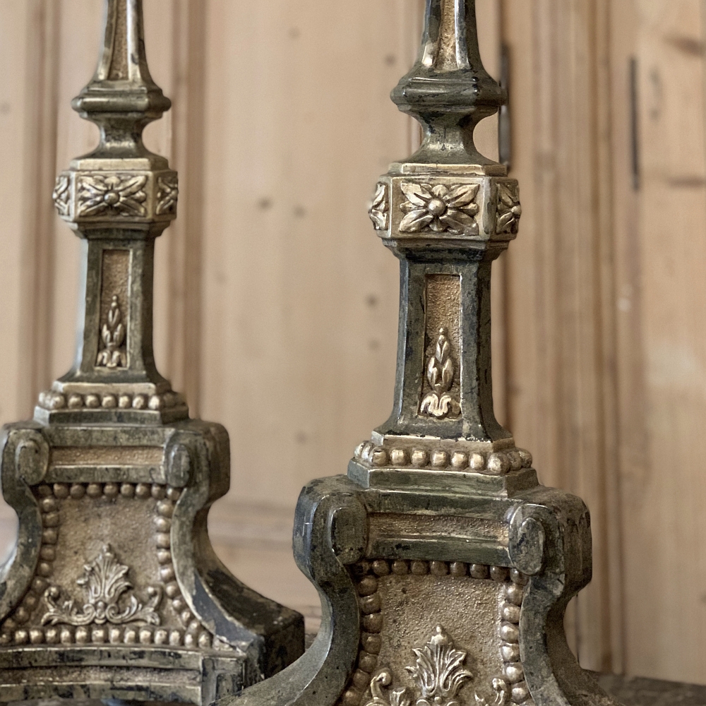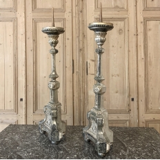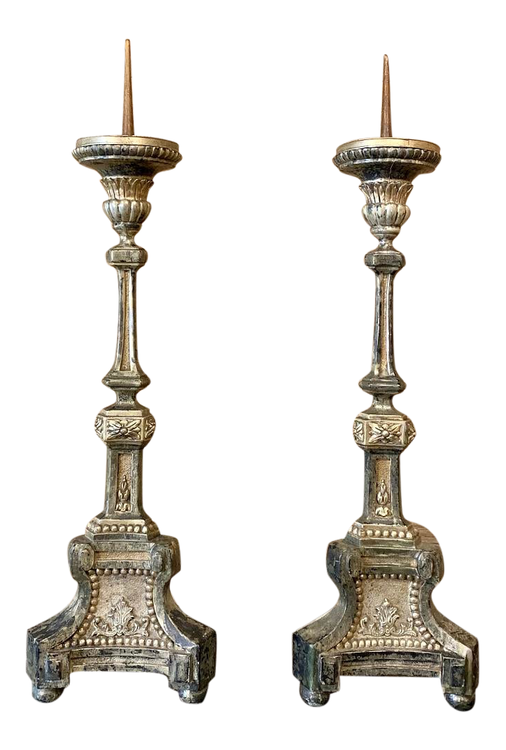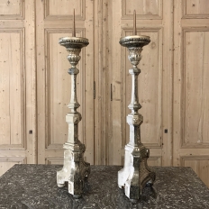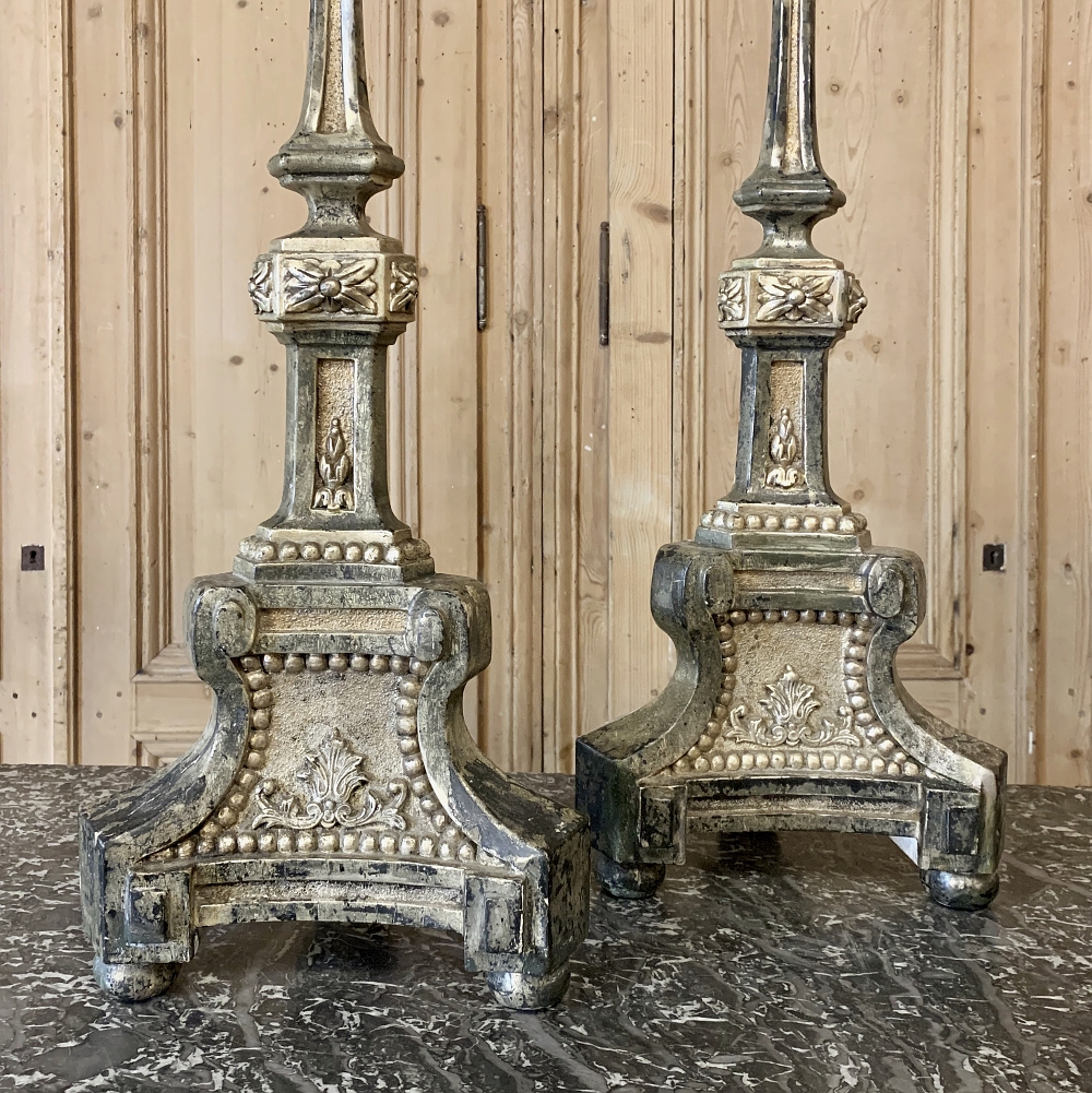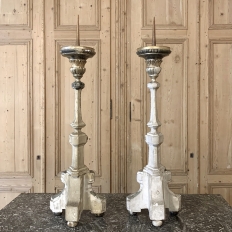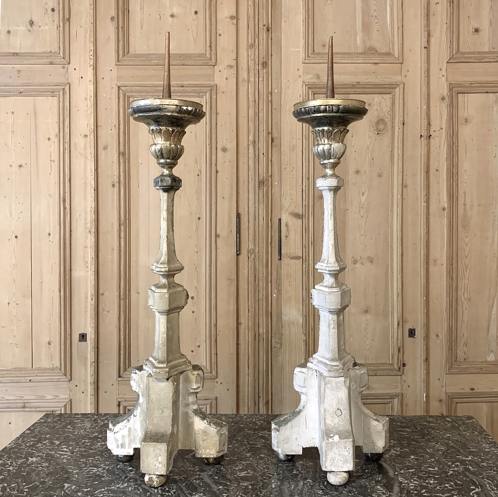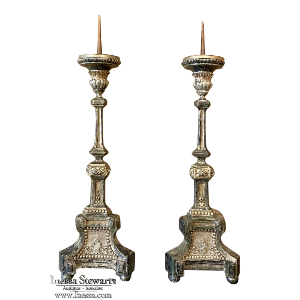 Pair of Amazing 18th Century Italian Neoclassical Silver Gilt Church Altar Candlesticks crafted with acanthus leaf motifs and silver rosettes. Created in Italy during the 18th century, each of these exquisite silver gilt candlesticks features a hand carved stem adorned with a graceful design that creates a subtle yet elegant accentuation, attracting and leading the eye throughout the piece. Each piece is raised on a tripod base whose concave neoclassical lines contrast beautifully with the curvature of the top. With their tall proportions, lovely silver finish, incredible patina and classical décor, these 18th century Italian candlesticks will be lovely additions to any home, perhaps placed atop a commode or buffet.