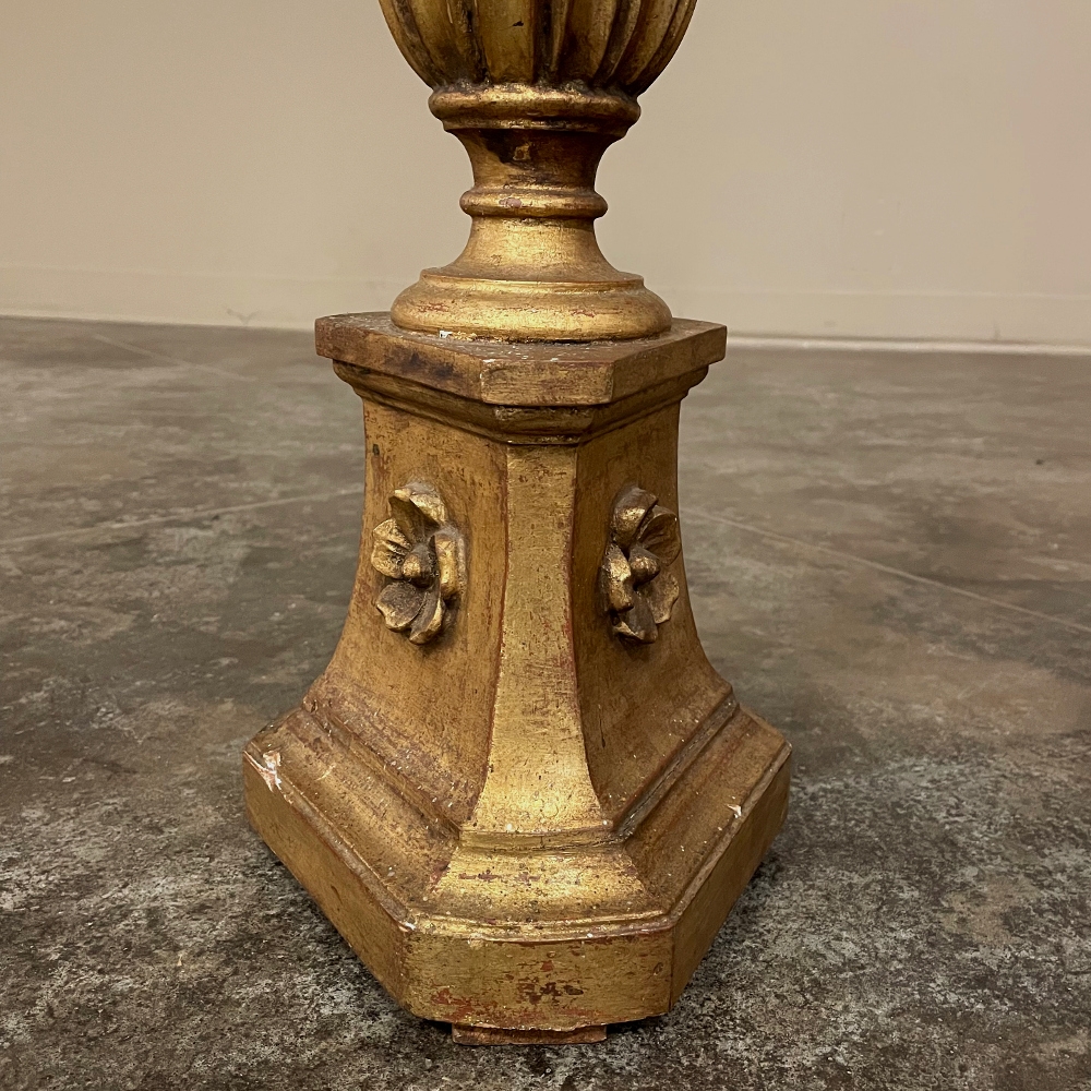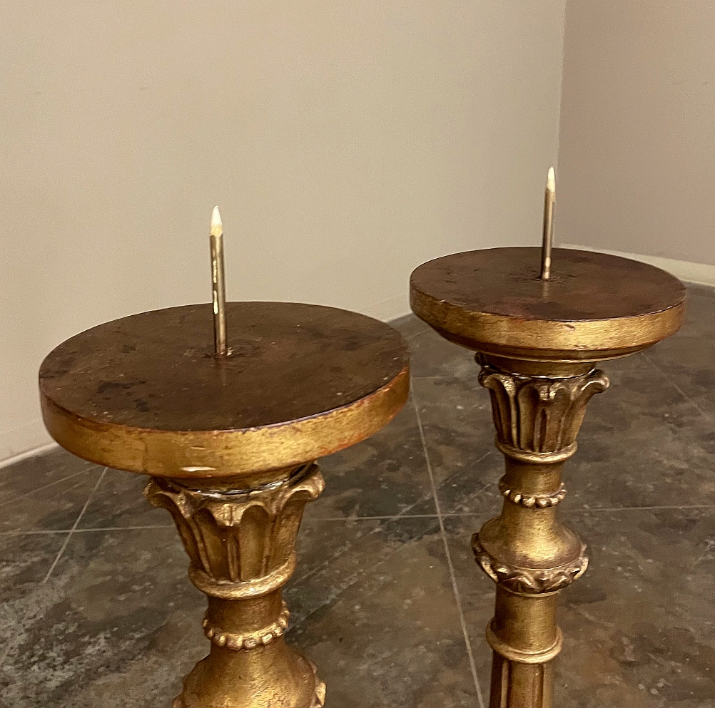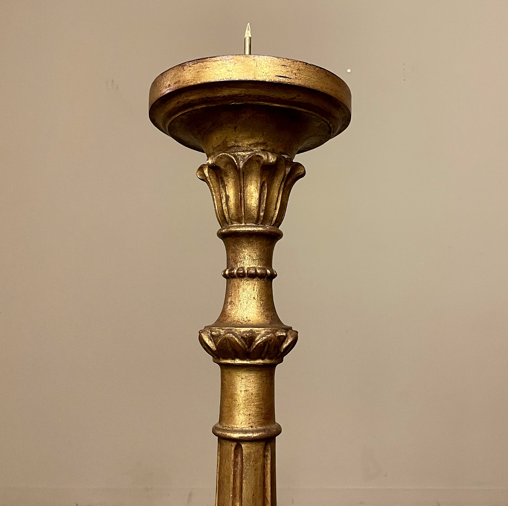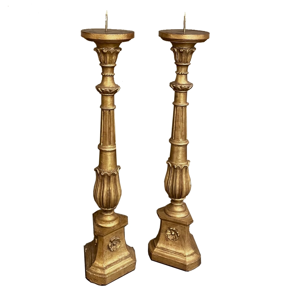 Pair Mid-Century Giltwood Candlesticks feature a timeless, classical design, with lotus volutes upraised to support the bobeche which is designed for 4" pillar candles. The shaft consists of multiple tiers of different motifs, ending with an urn-shaped rendition of the same lotus volutes immediately positioned above the tripod base, with graceful lines and raised rosettes on each facet.