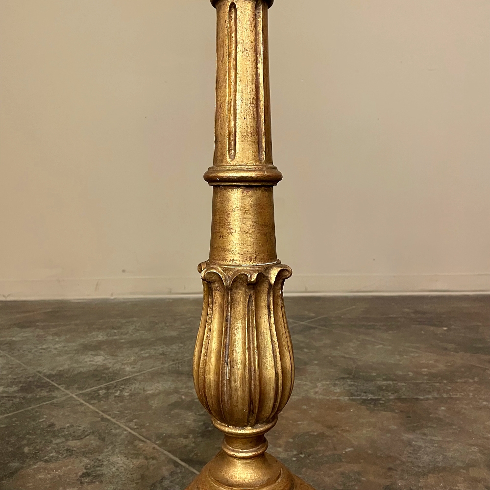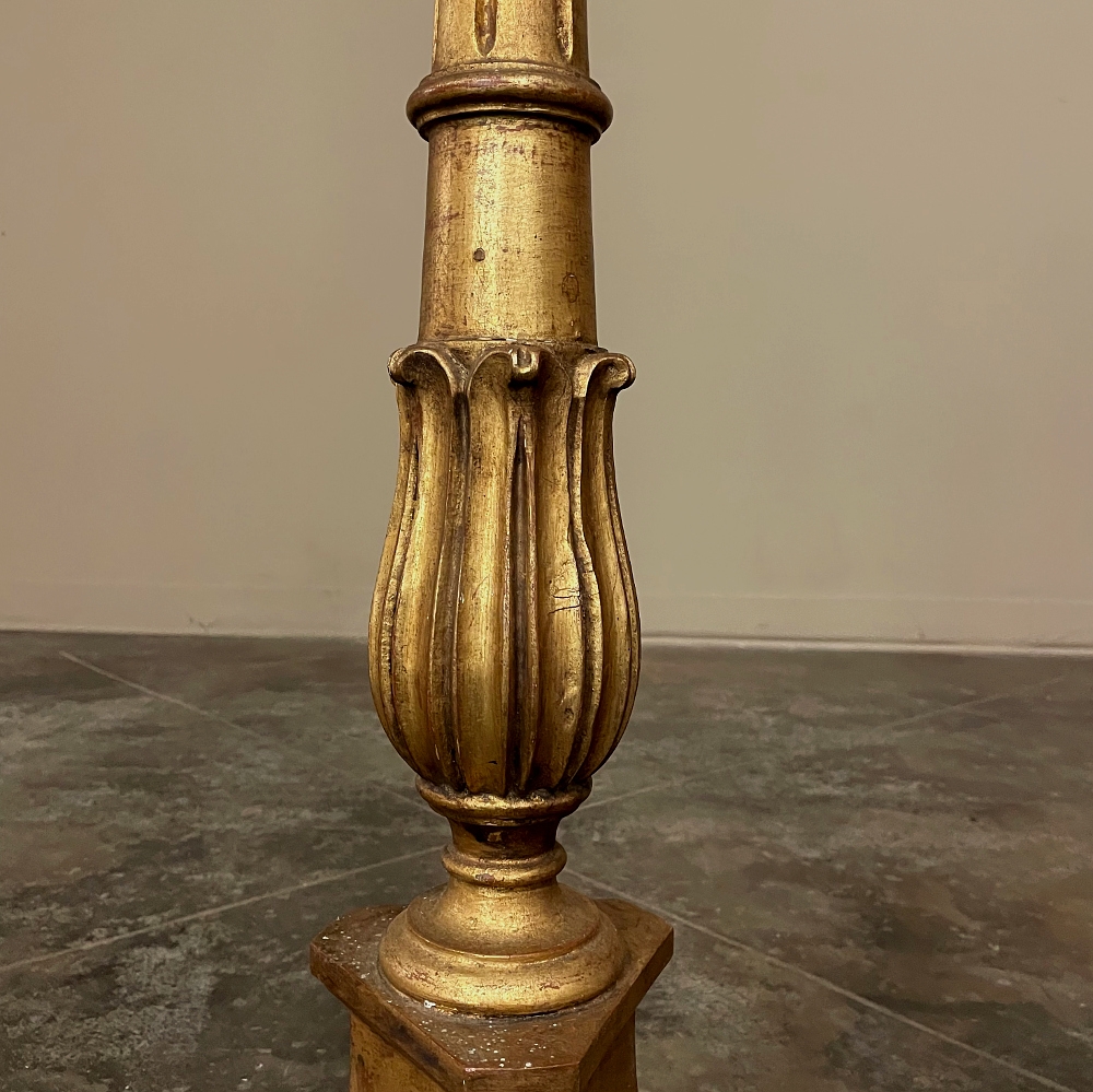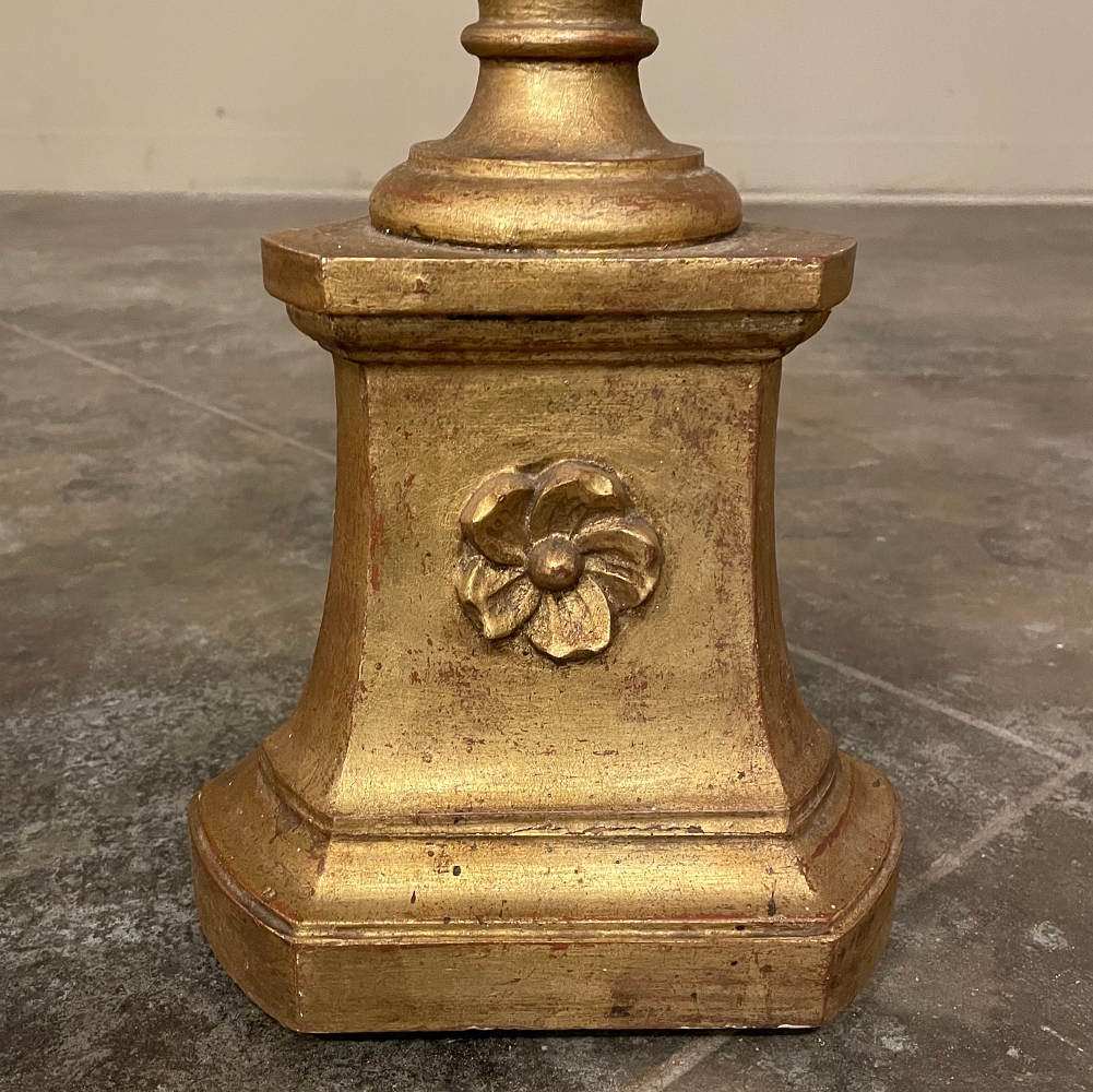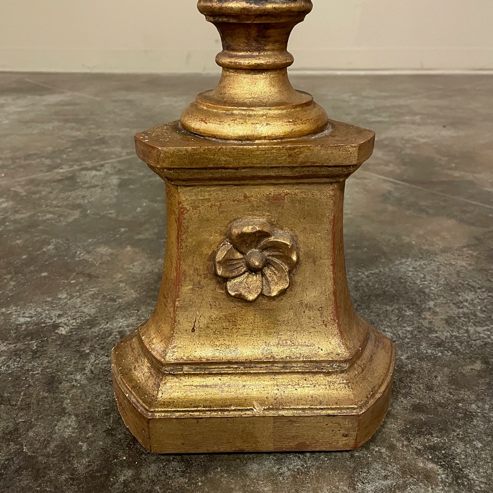 Pair Mid-Century Giltwood Candlesticks feature a timeless, classical design, with lotus volutes upraised to support the bobeche which is designed for 4" pillar candles. The shaft consists of multiple tiers of different motifs, ending with an urn-shaped rendition of the same lotus volutes immediately positioned above the tripod base, with graceful lines and raised rosettes on each facet.