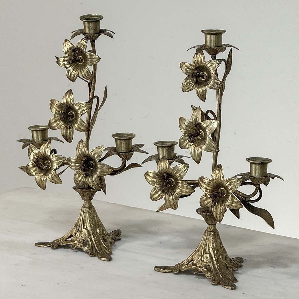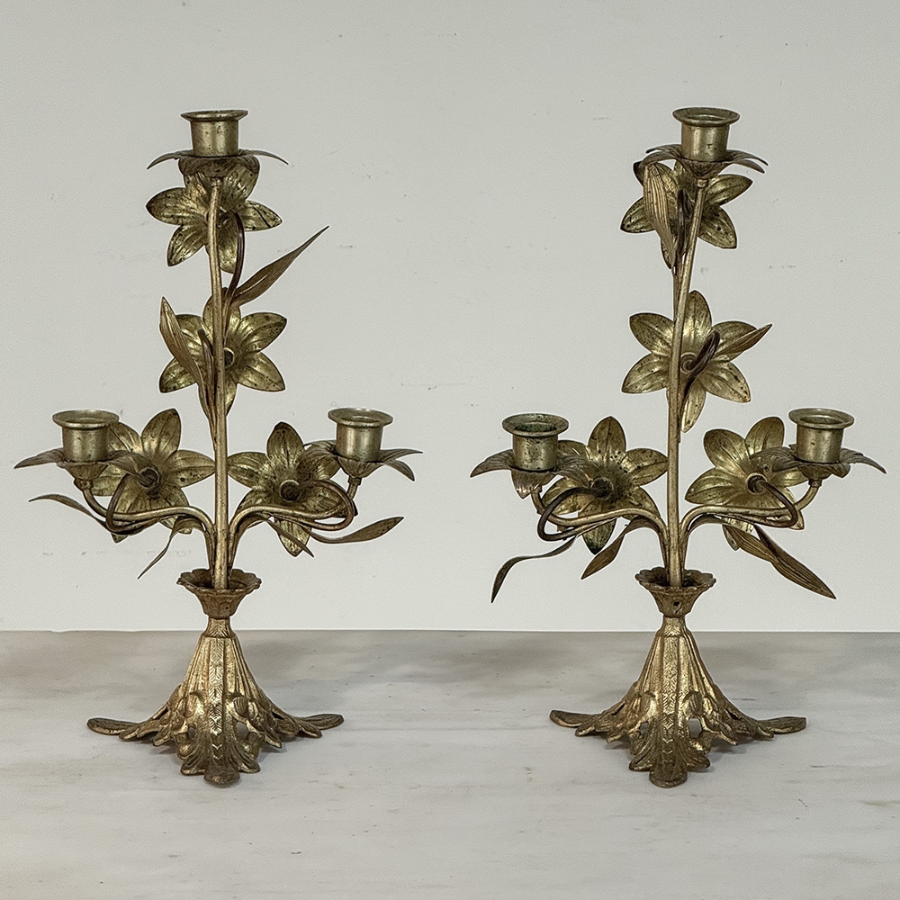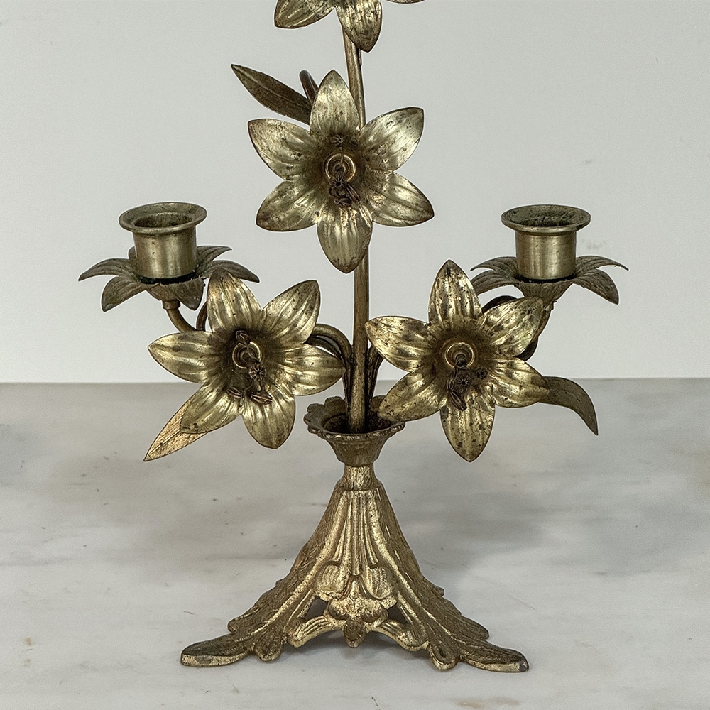 Pair Napoleon III Period Bronze Floral Candelabra are the perfect choice to provide a finishing touch on a mantel, buffet, window sill or any other surface! Designed to be less than 6" in depth, they'll fit even on shallow surfaces. Cast in solid bronze to last for centuries, each of the pair features an intricately detailed embossed foliate pedestal base with a flower that face upwards surrounding the stem that protrudes upwards to hold the bobeches for candles as well as decorative six-petal flowers with stamen. Each is hand made so upon close inspection they're slightly different yet obviously designed as a pair.