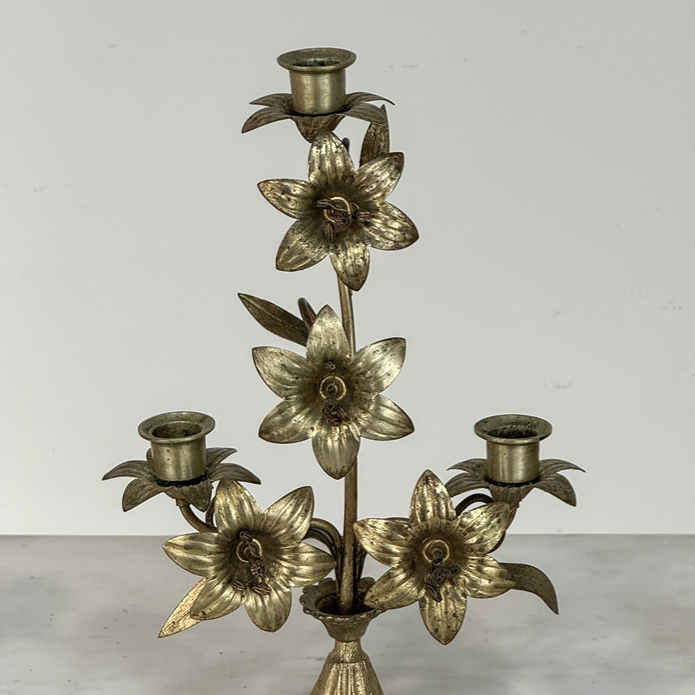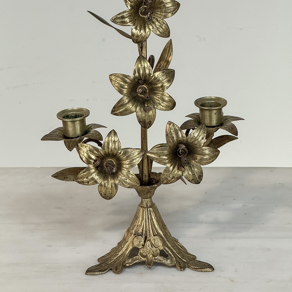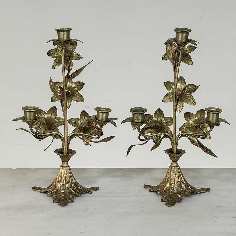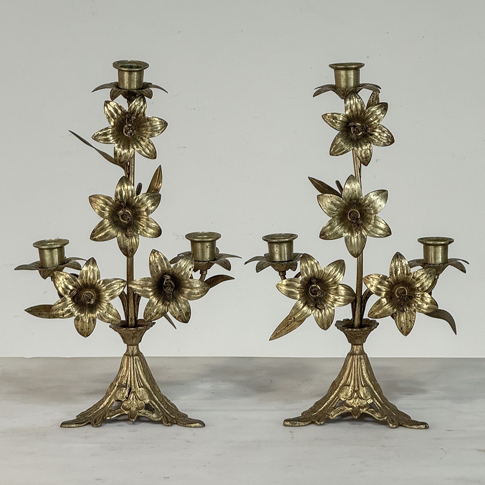Pair Napoleon III Period Bronze Floral Candelabra are the perfect choice to provide a finishing touch on a mantel, buffet, window sill or any other surface! Designed to be less than 6" in depth, they'll fit even on shallow surfaces. Cast in solid bronze to last for centuries, each of the pair features an intricately detailed embossed foliate pedestal base with a flower that face upwards surrounding the stem that protrudes upwards to hold the bobeches for candles as well as decorative six-petal flowers with stamen. Each is hand made so upon close inspection they're slightly different yet obviously designed as a pair.