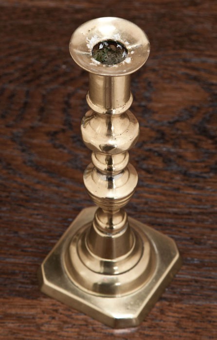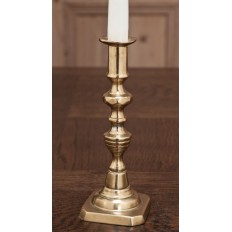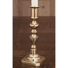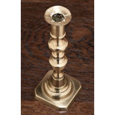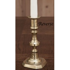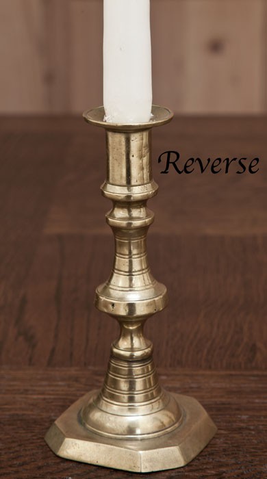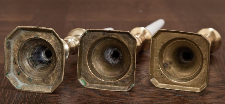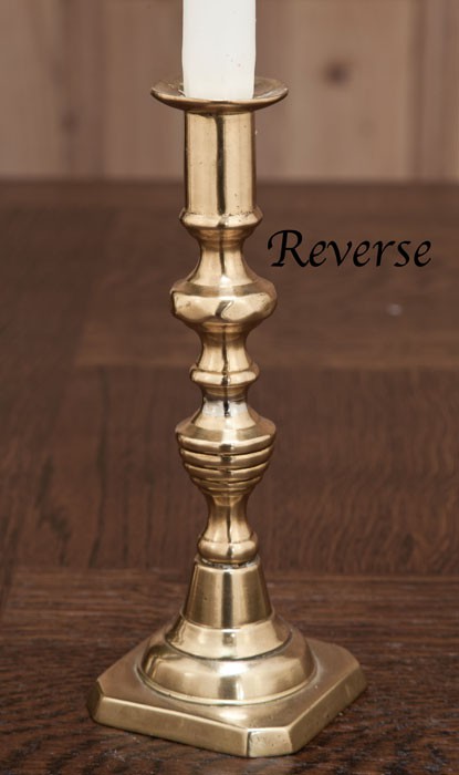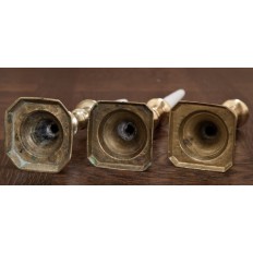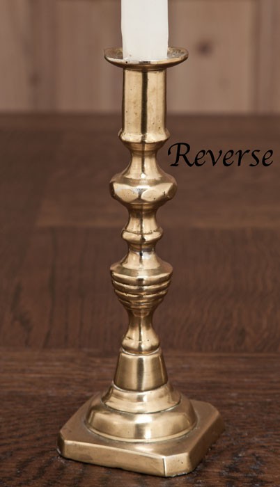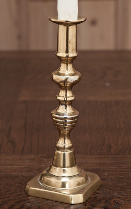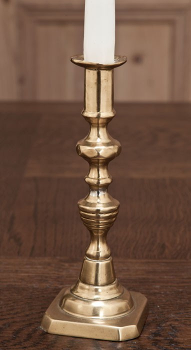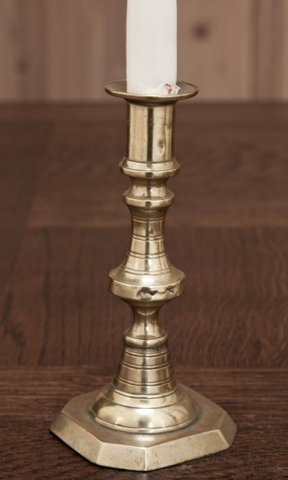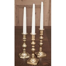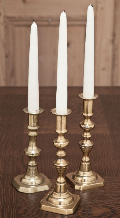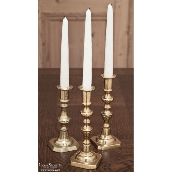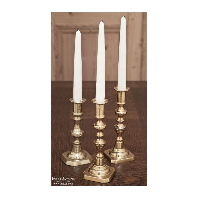 Sale18th Century English Set of 3 Antique Brass Candlesticks. This set of three antique hand cast brass English candlesticks are perfect for adding ambiance of English Country style to any room.