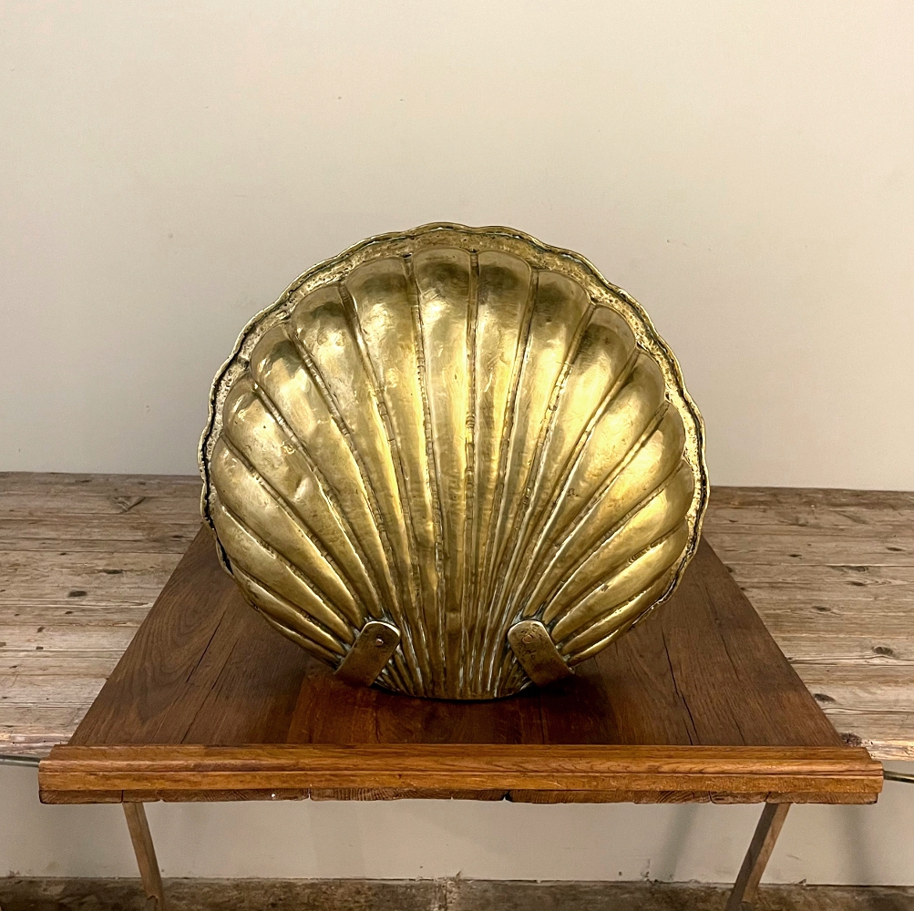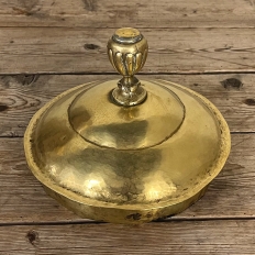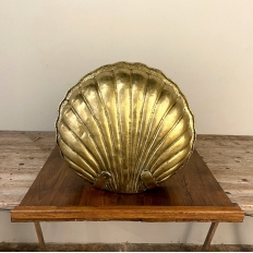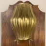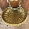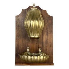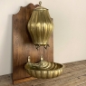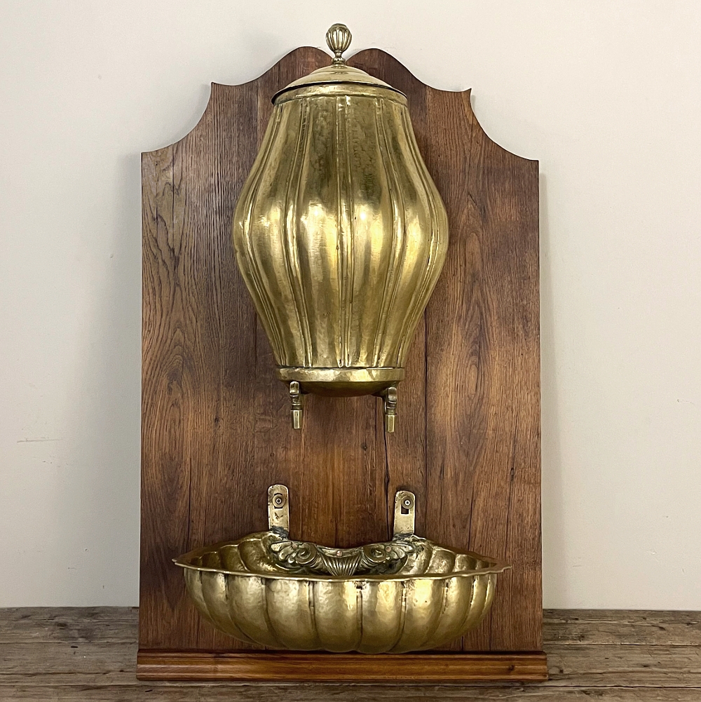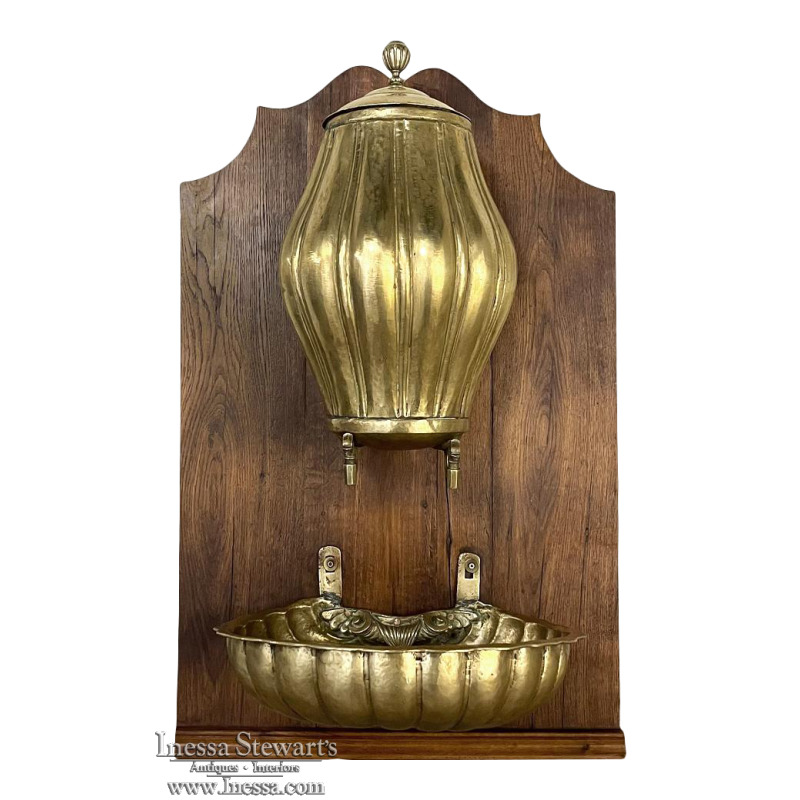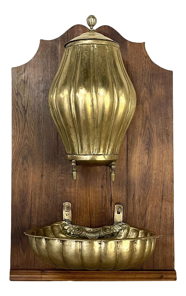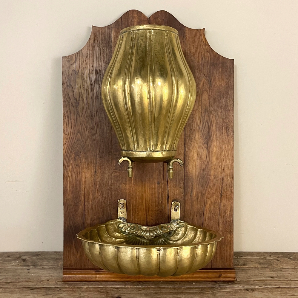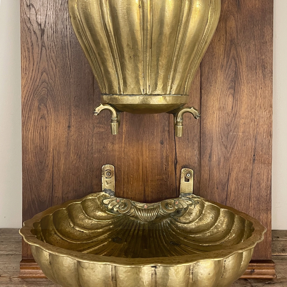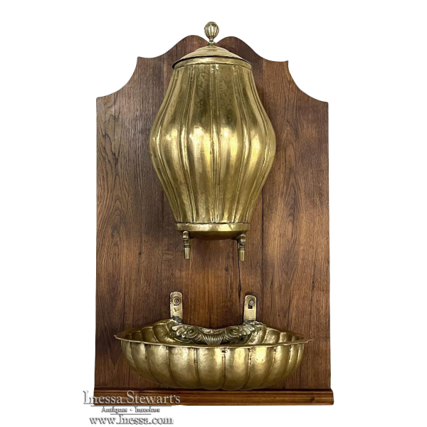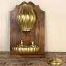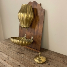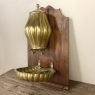 19th Century French Brass Wall Fountain ~ Lavabo is a charming relic from a bygone era! Back before the days of ubiquitous running water in every room of the house, folks were obliged to create ingenious solutions like this wall fountain. Such a piece would be placed just outside or inside the back door, so that when it was time to come inside from working in the fields, one could wash hands and face before entering the home. The reservoir above held sufficient water for the task, and the basin below captured the waste water for dumping later via an easily removable hanging system. The cast brass valves operated on a similar basis as modern plumbing ~ when rotated 90 degrees they allowed water to flow through, then 90 degrees back to shut off the flow. Even the reservoir could be easily removed off the decorative wooden mounting plaque for cleaning and rinsing. Hand-crafted with care and artistry from solid brass, the upper urn shape features bowed flutes for visual appeal as well as design strength, while the lower basin was crafted to resemble a large scallop shell.