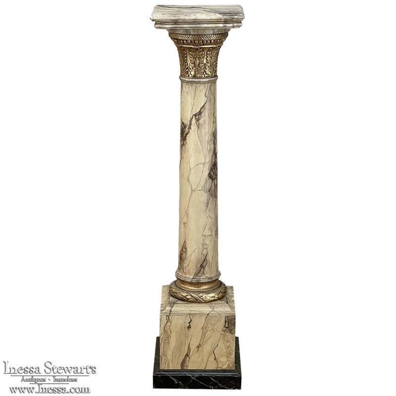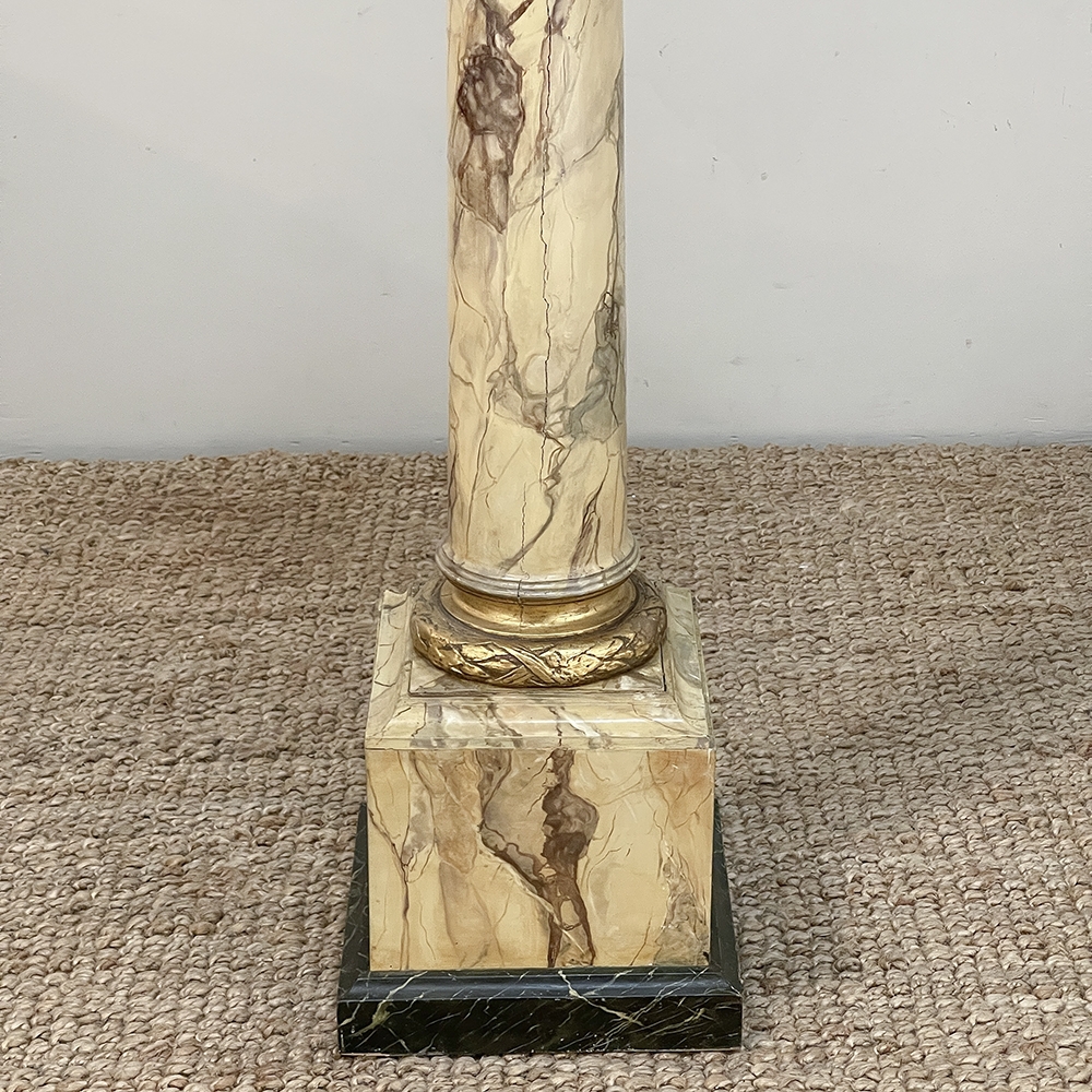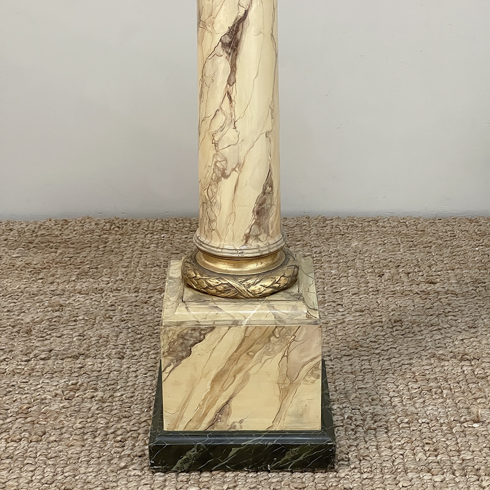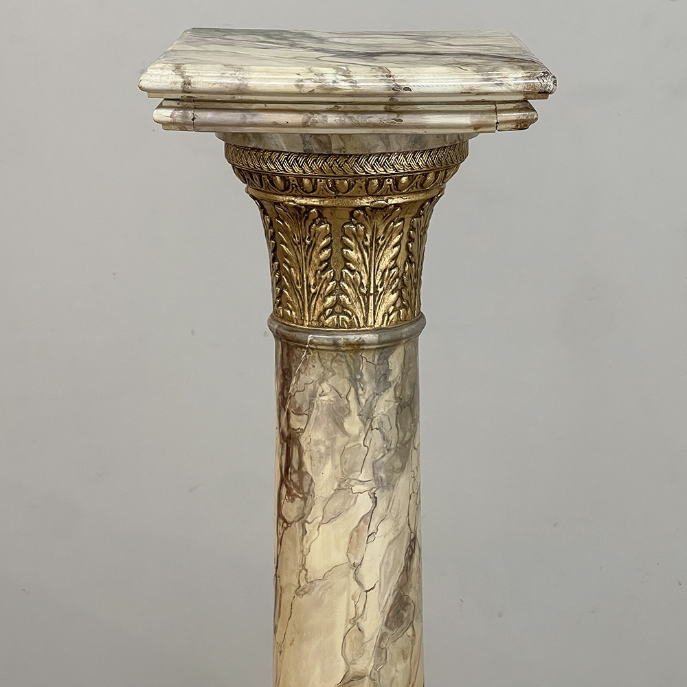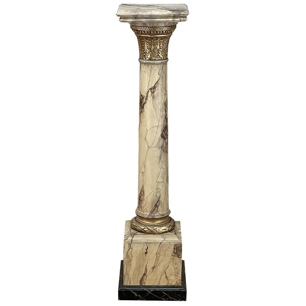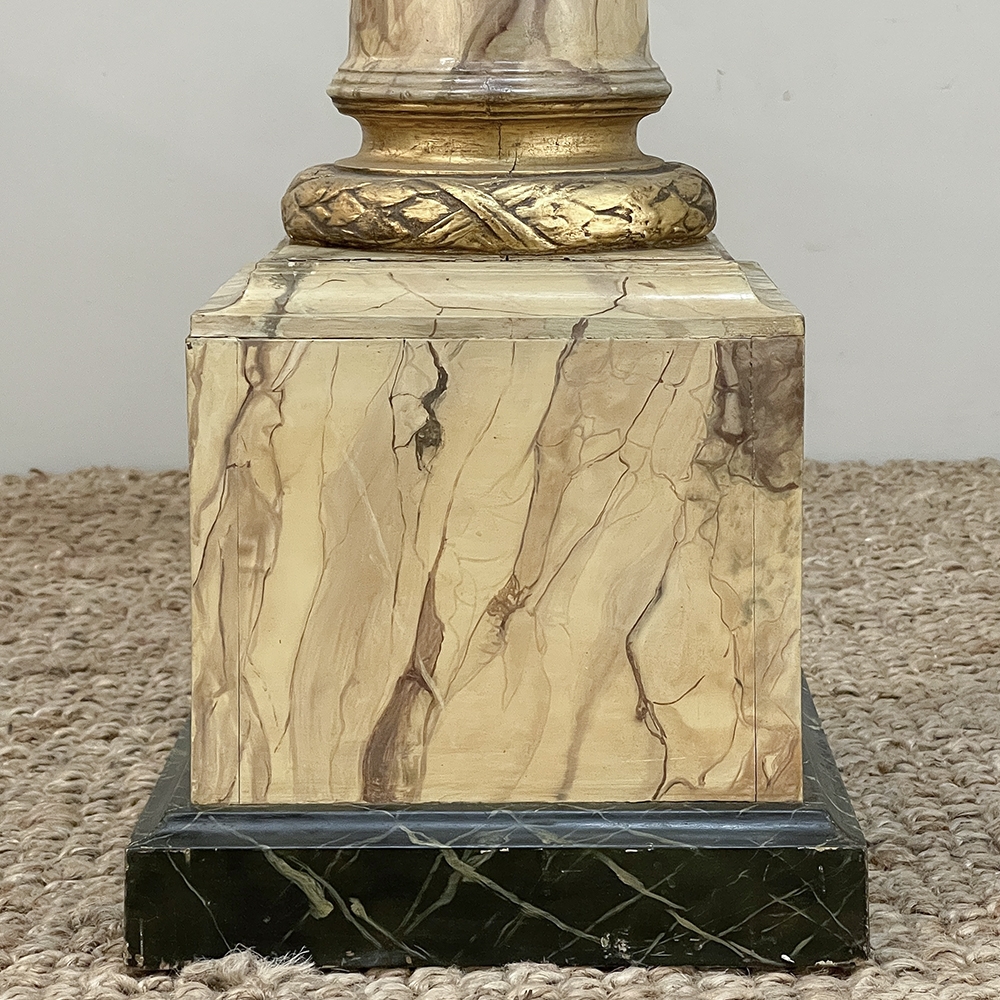 19th Century French Louis XVI Faux Marble Pedestal is a gem of the classical style! Designed in a style that has existed for over 3,000 years! Solid wood painted to look exactly like richly veined marble comprises the pediment base, the subtly tapered central shaft, and the top which is removable and able to swivel. Gold highlighted laurel wreath encircles the central shaft at its base, with an ancient Egyptian-inspired capital atop the shaft just under the aforementioned swiveling top. Perfect for displaying your statuary, vases, urns or objets d'art!