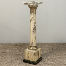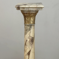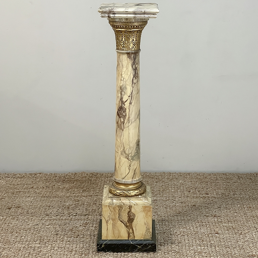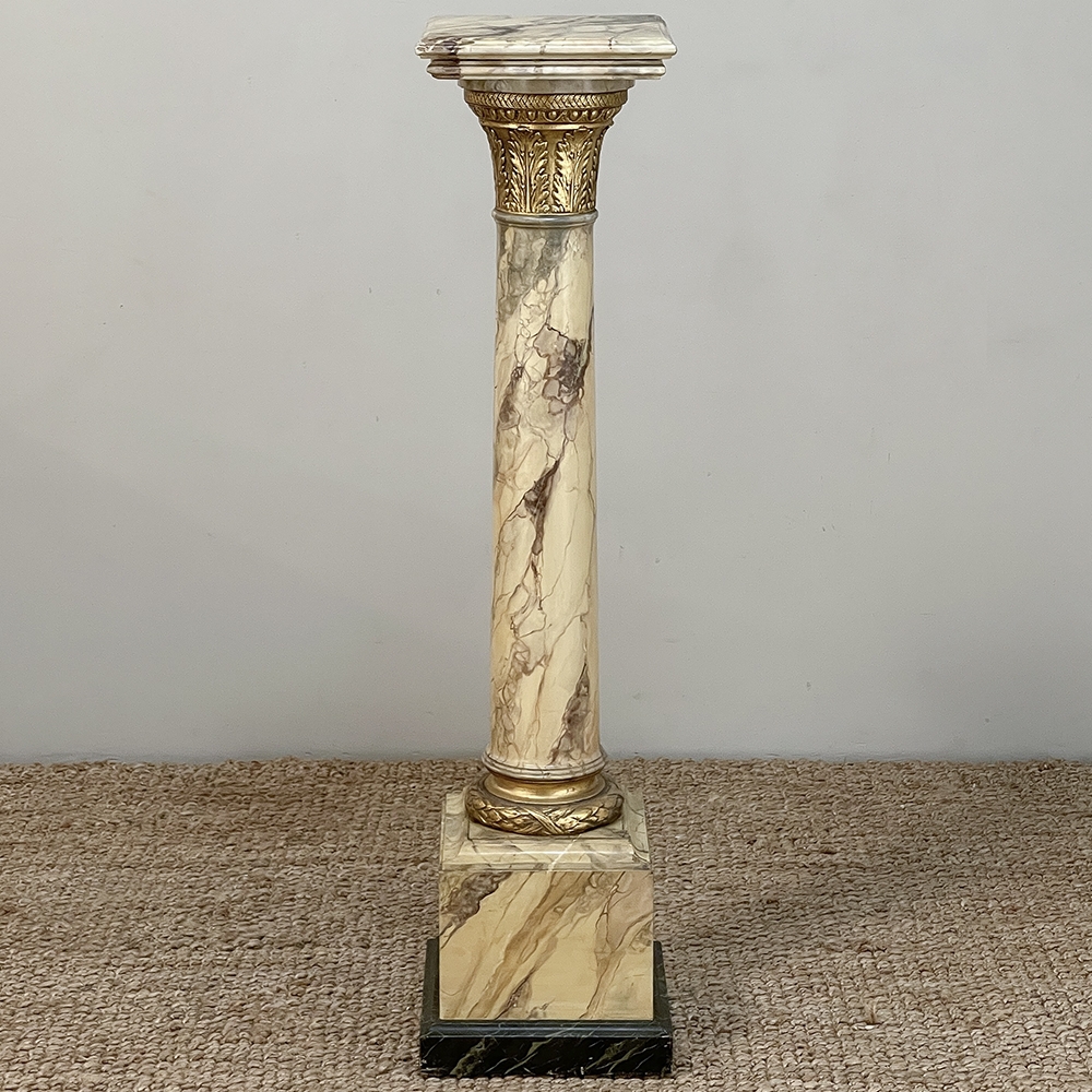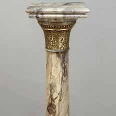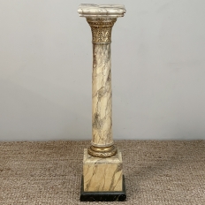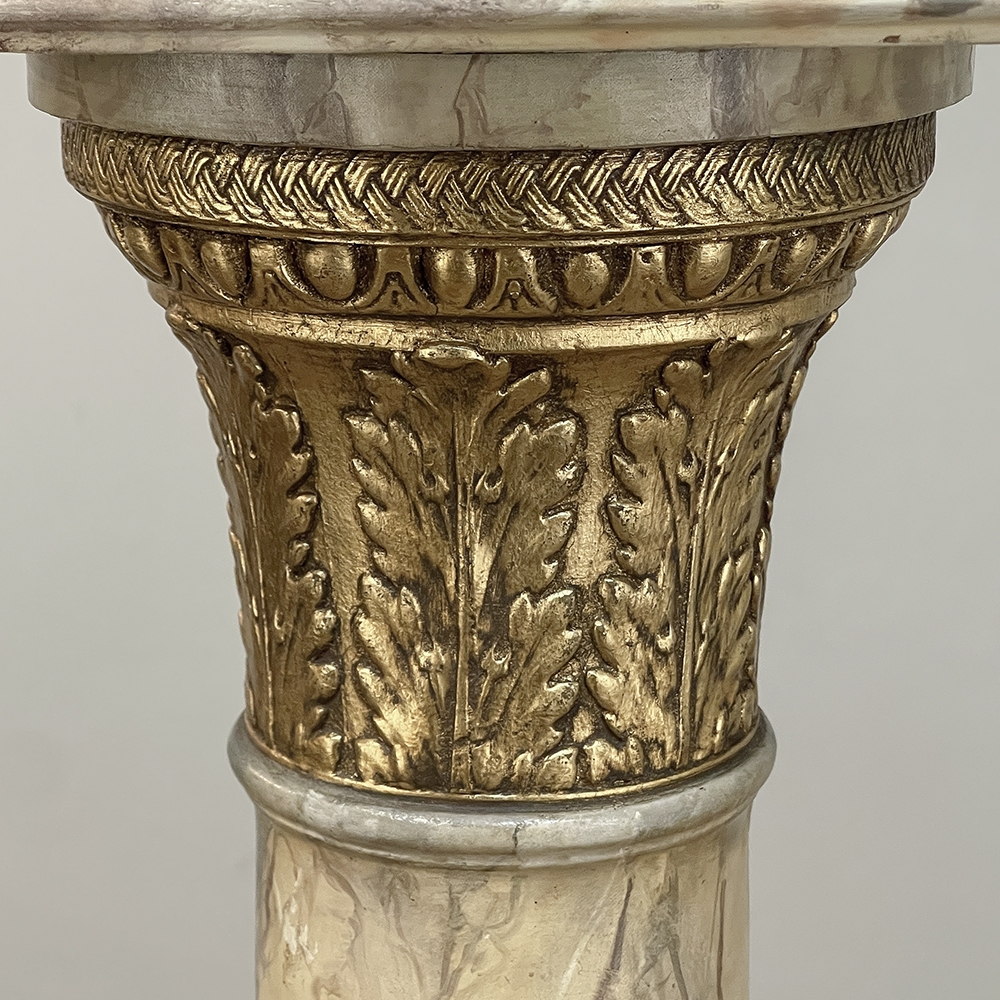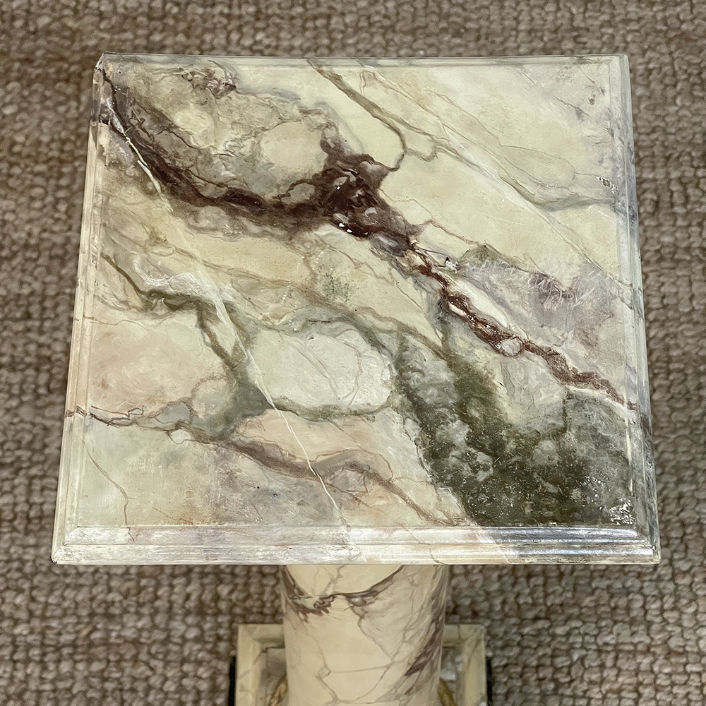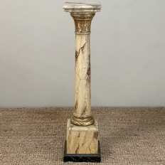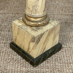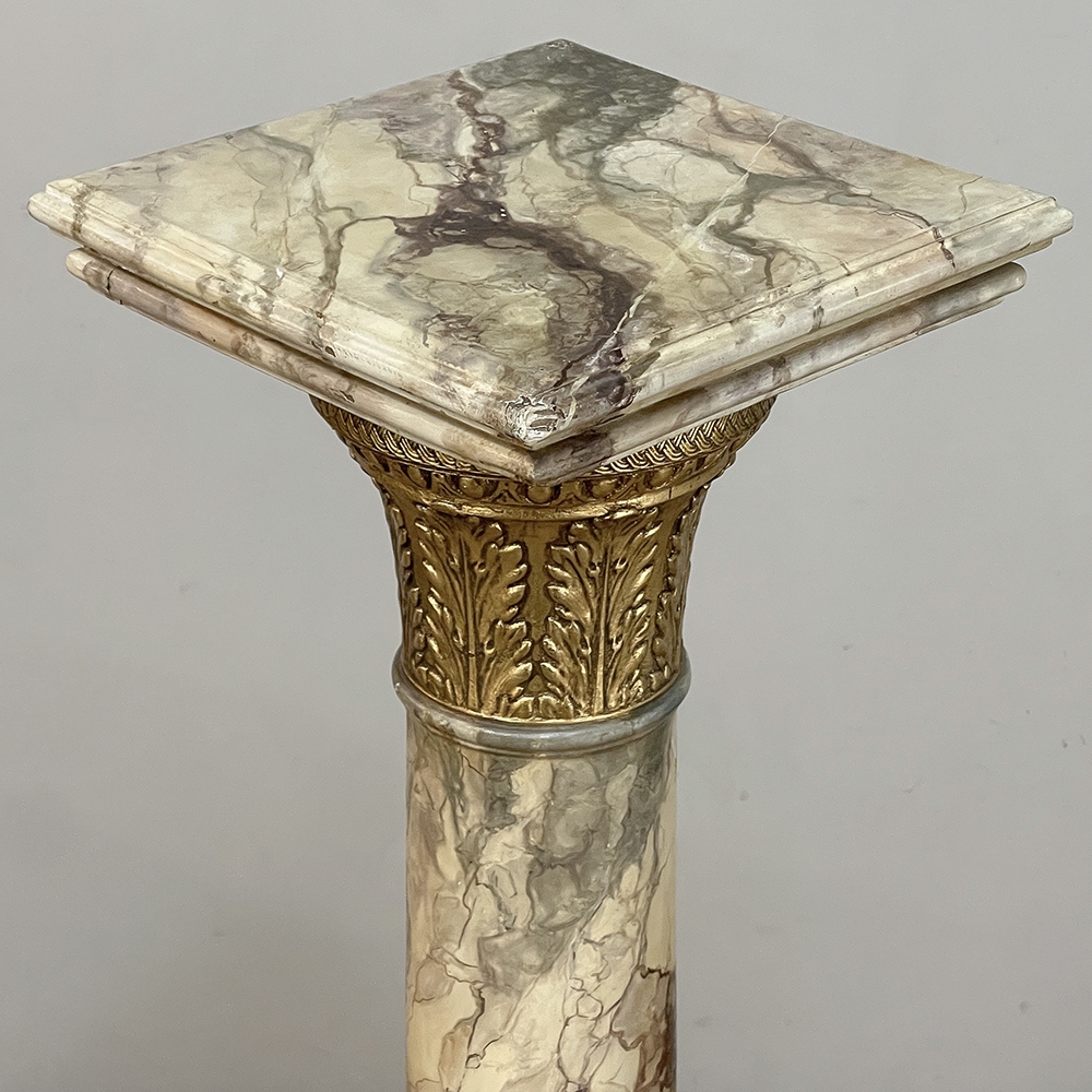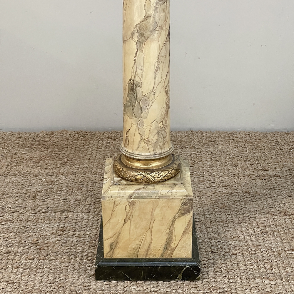 19th Century French Louis XVI Faux Marble Pedestal is a gem of the classical style! Designed in a style that has existed for over 3,000 years! Solid wood painted to look exactly like richly veined marble comprises the pediment base, the subtly tapered central shaft, and the top which is removable and able to swivel. Gold highlighted laurel wreath encircles the central shaft at its base, with an ancient Egyptian-inspired capital atop the shaft just under the aforementioned swiveling top. Perfect for displaying your statuary, vases, urns or objets d'art!