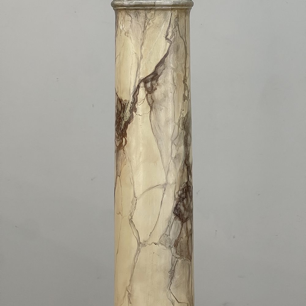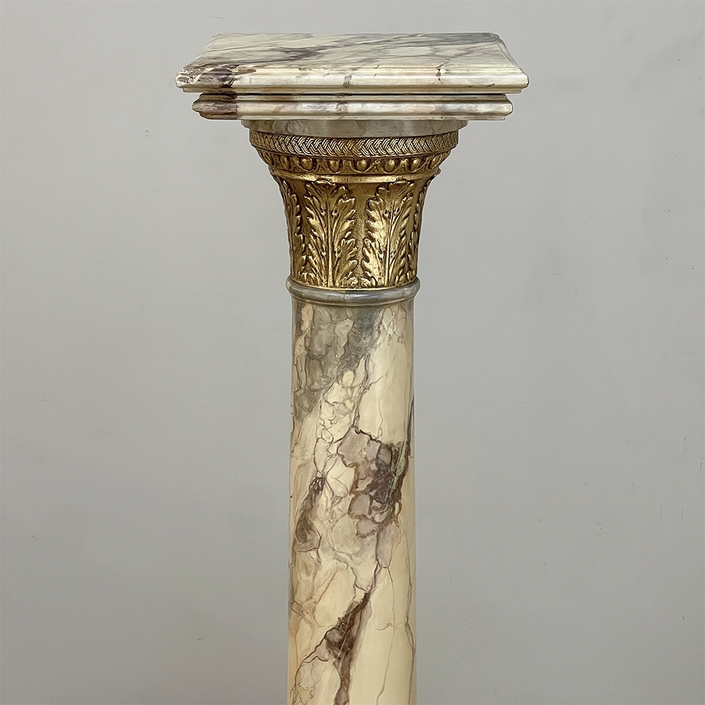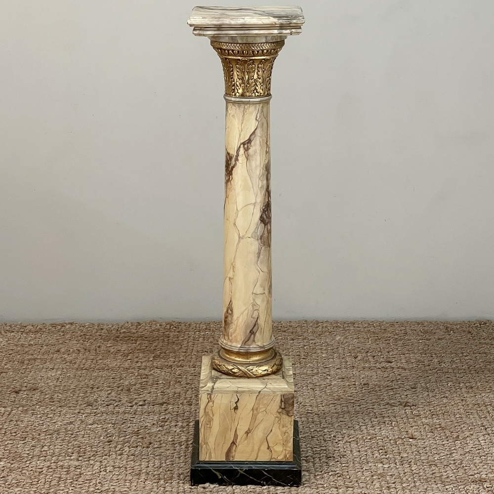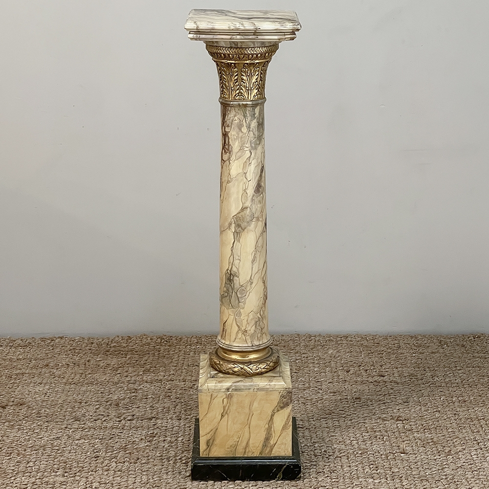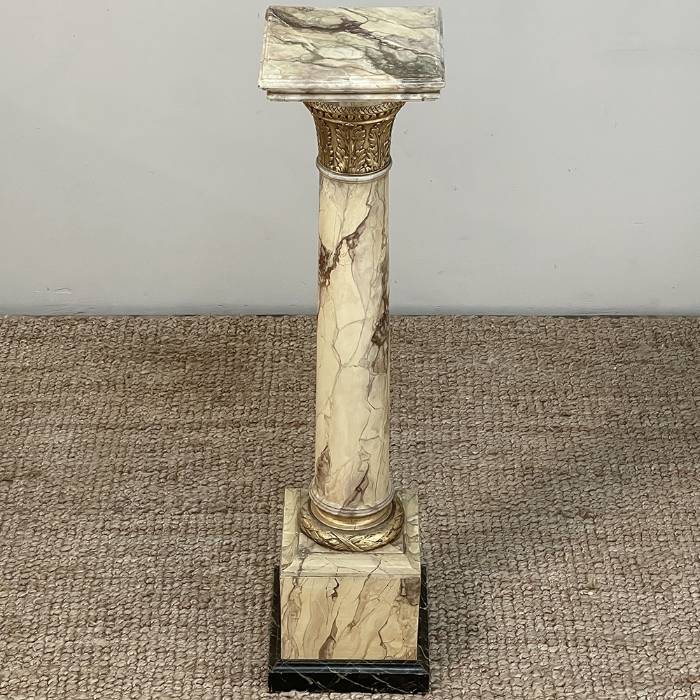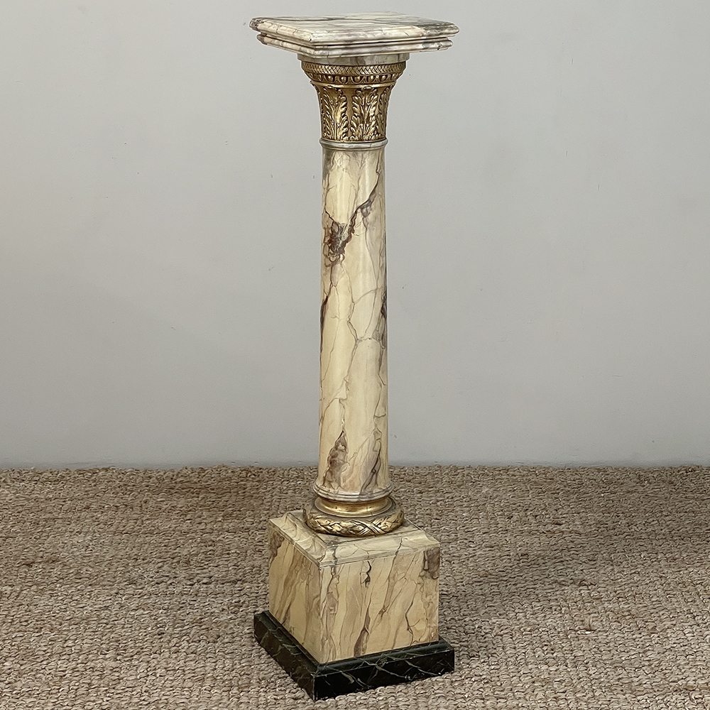 19th Century French Louis XVI Faux Marble Pedestal is a gem of the classical style! Designed in a style that has existed for over 3,000 years! Solid wood painted to look exactly like richly veined marble comprises the pediment base, the subtly tapered central shaft, and the top which is removable and able to swivel. Gold highlighted laurel wreath encircles the central shaft at its base, with an ancient Egyptian-inspired capital atop the shaft just under the aforementioned swiveling top. Perfect for displaying your statuary, vases, urns or objets d'art!
