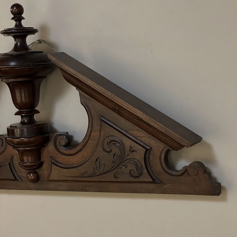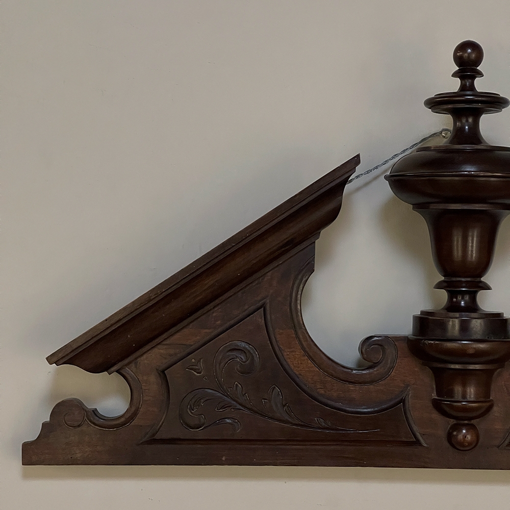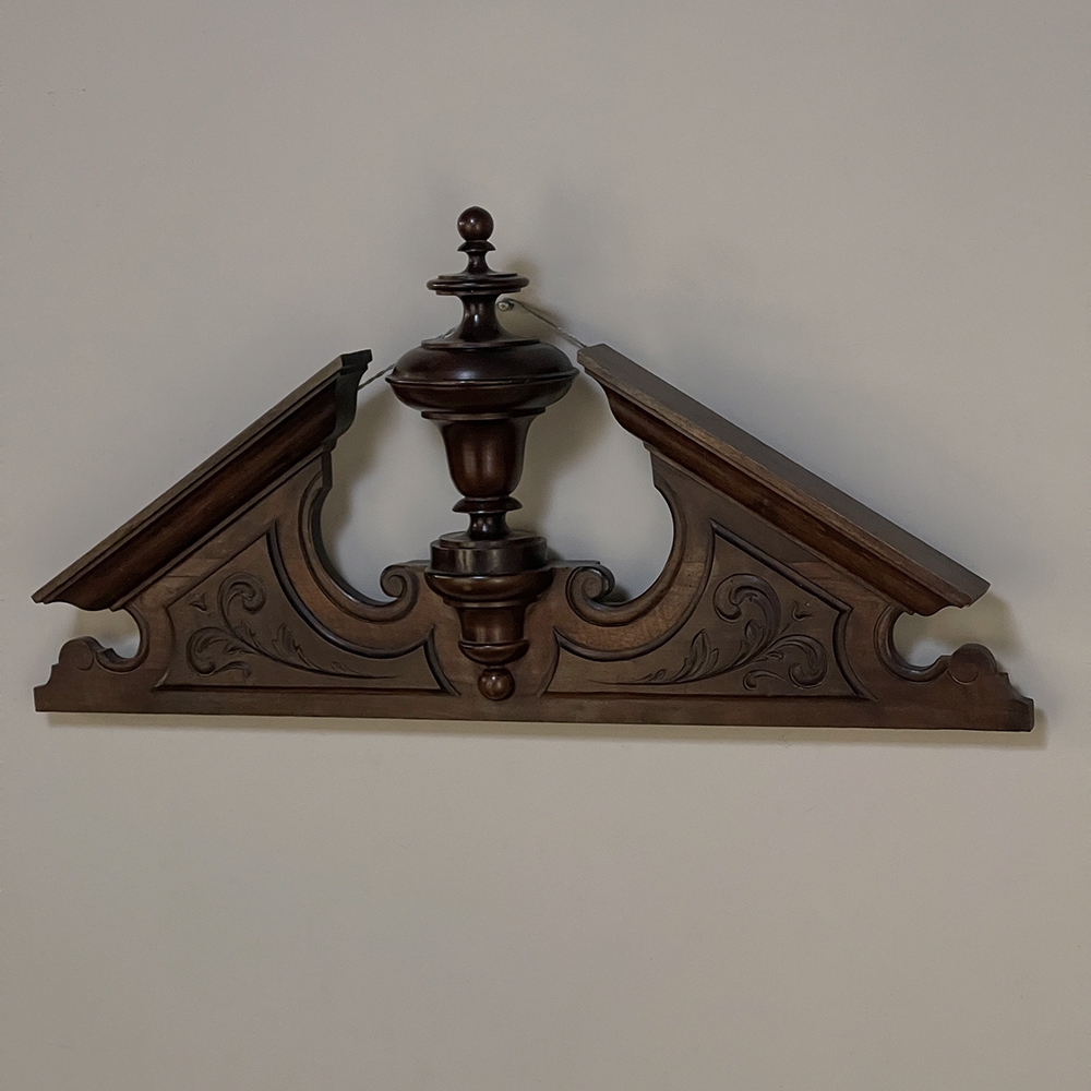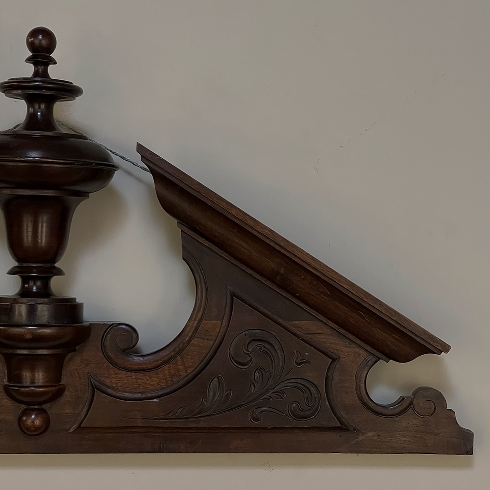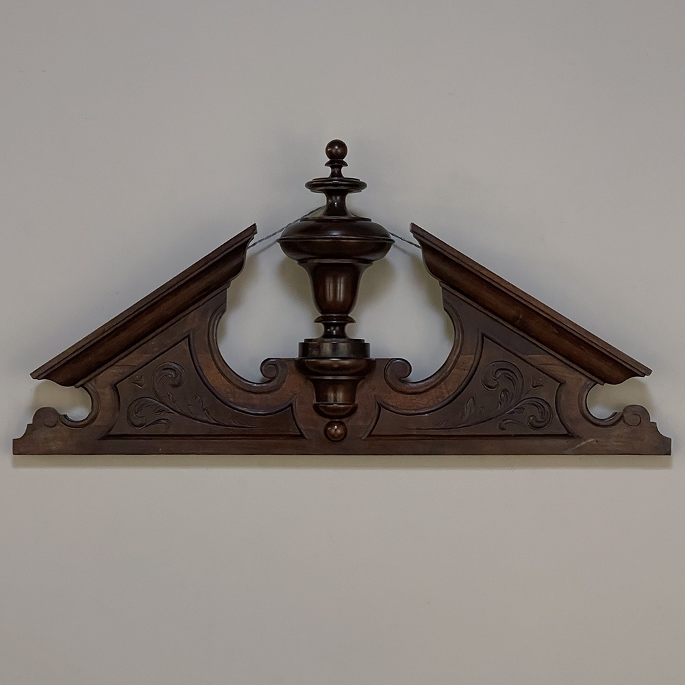 19th Century French Walnut Neoclassical Decorative Crown was inspired by ancient Greek and Roman architecture. The pitched molding design provides a framework for the magnificent solid walnut turned finial at the center, with floral embellishments carved into the facade for added visual appeal. Ideal over cased openings or windows!