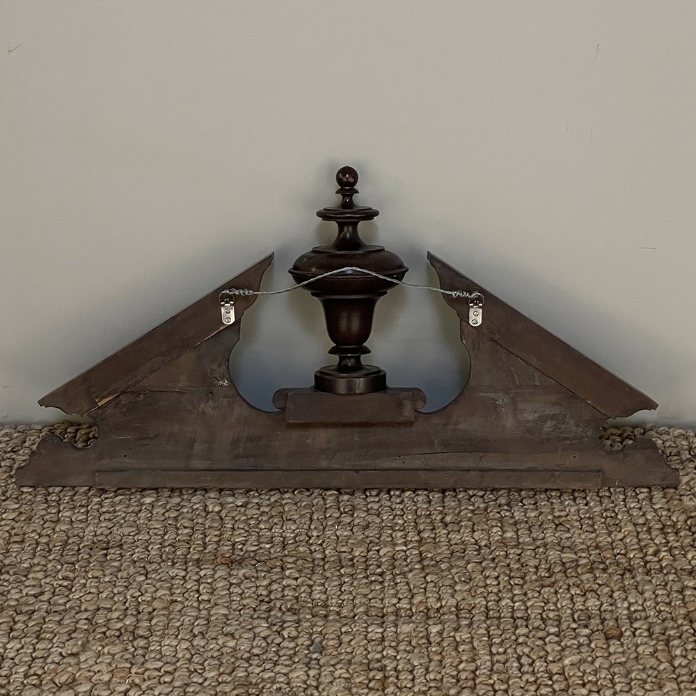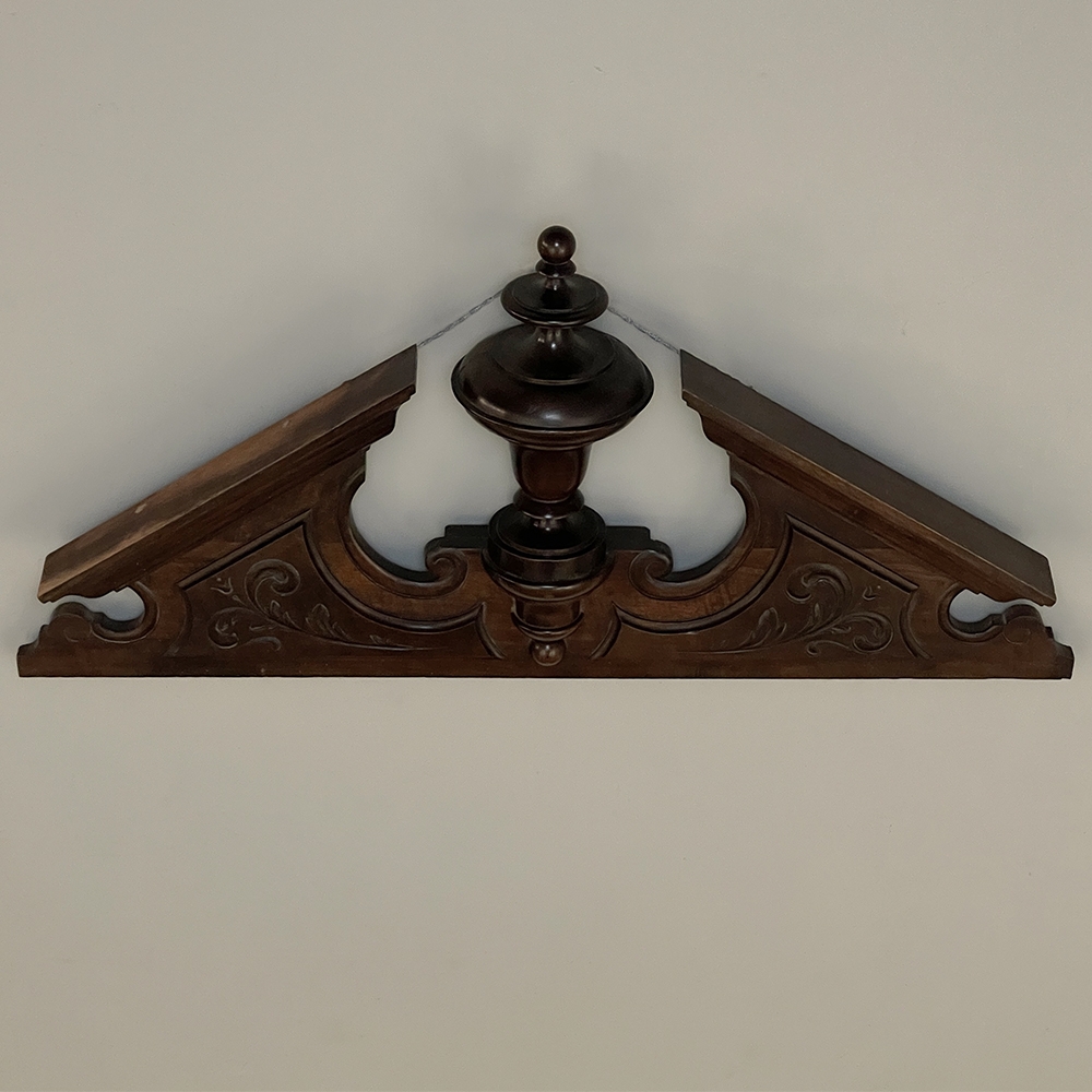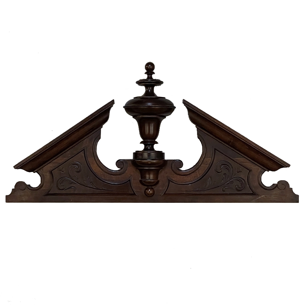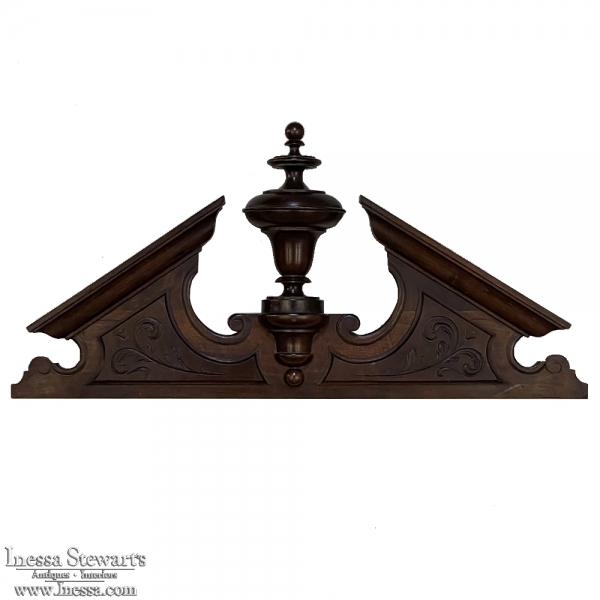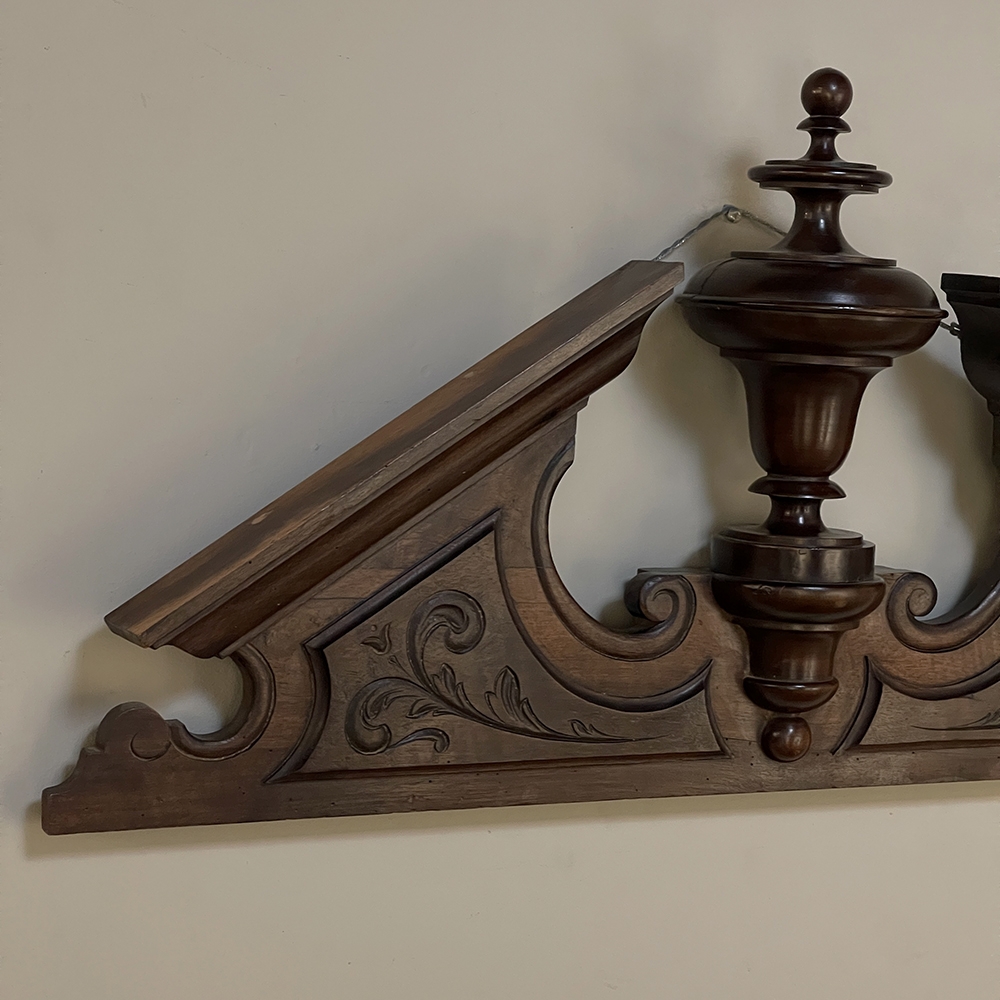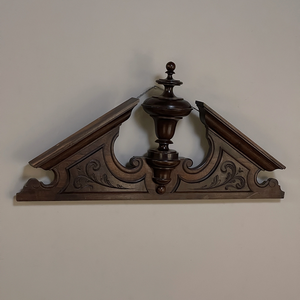 19th Century French Walnut Neoclassical Decorative Crown was inspired by ancient Greek and Roman architecture. The pitched molding design provides a framework for the magnificent solid walnut turned finial at the center, with floral embellishments carved into the facade for added visual appeal. Ideal over cased openings or windows!