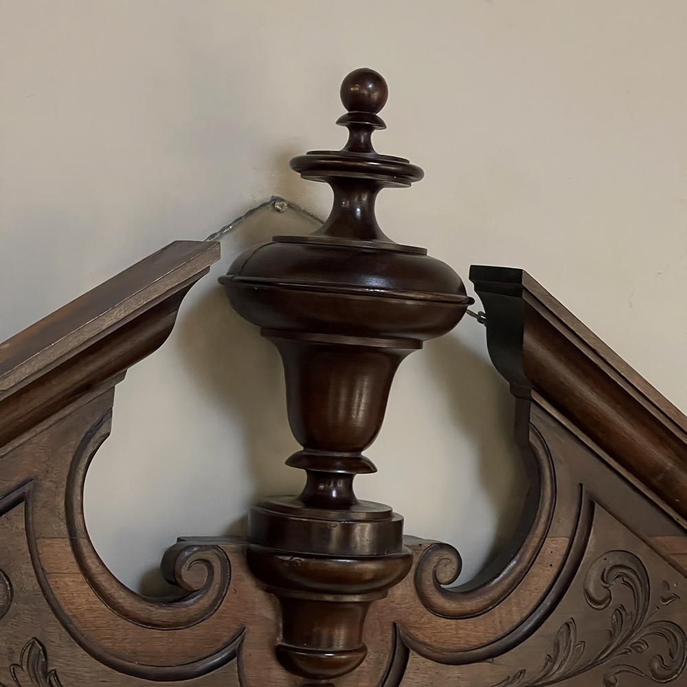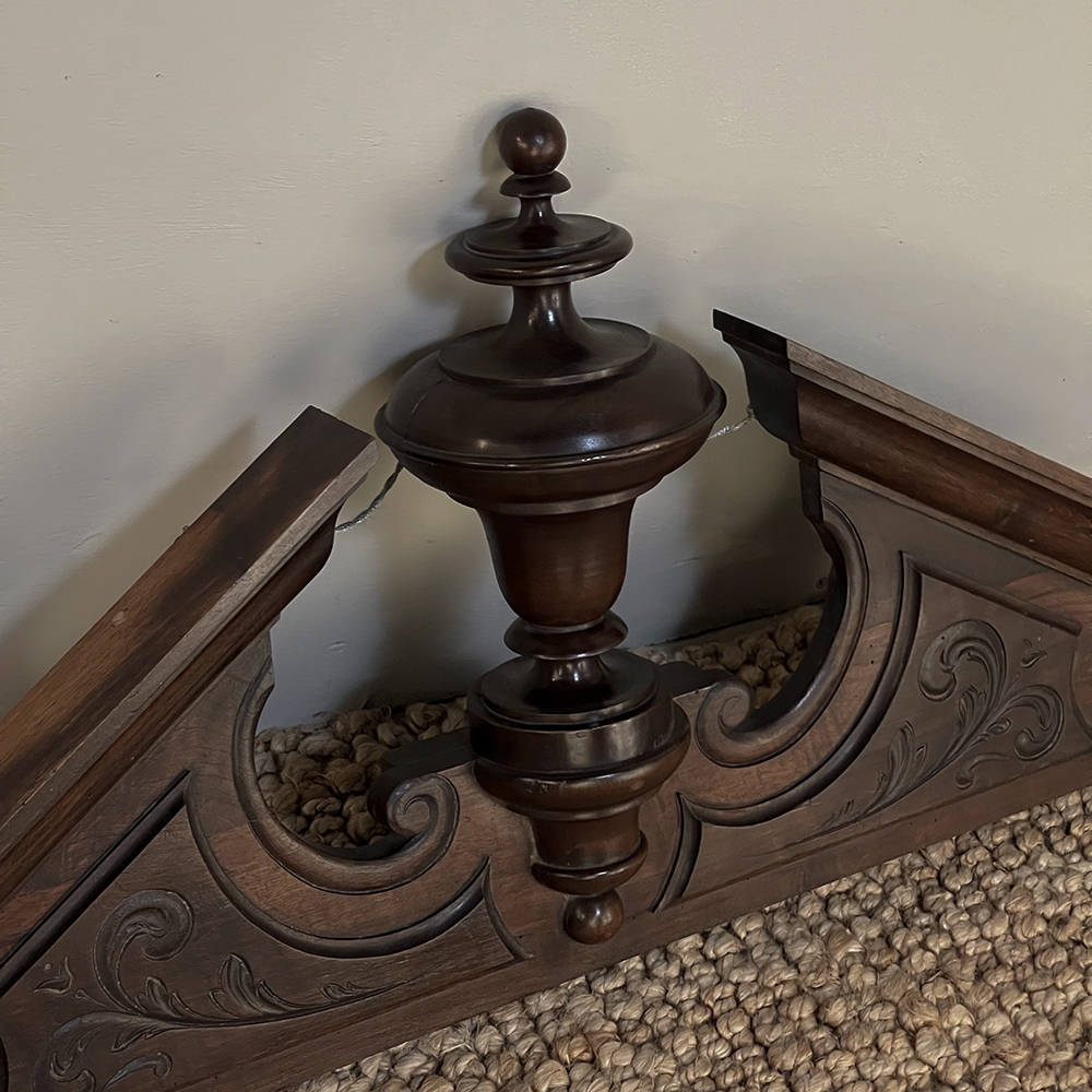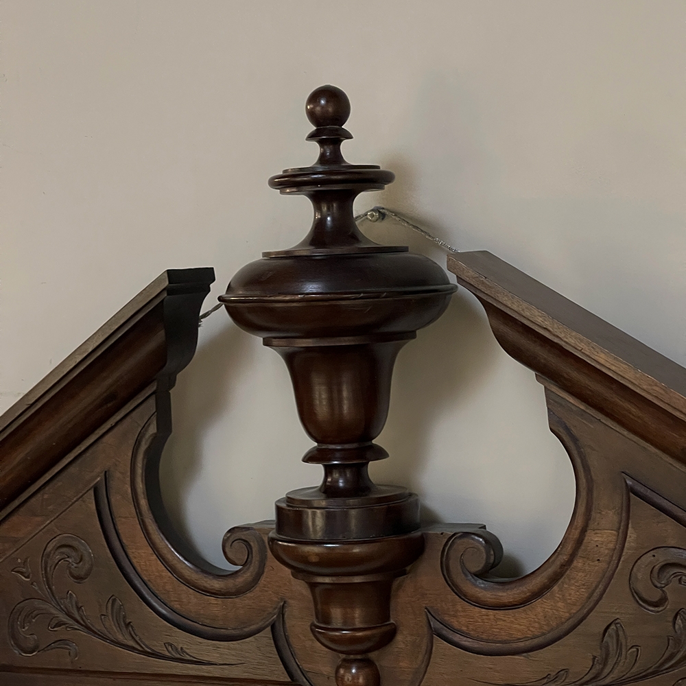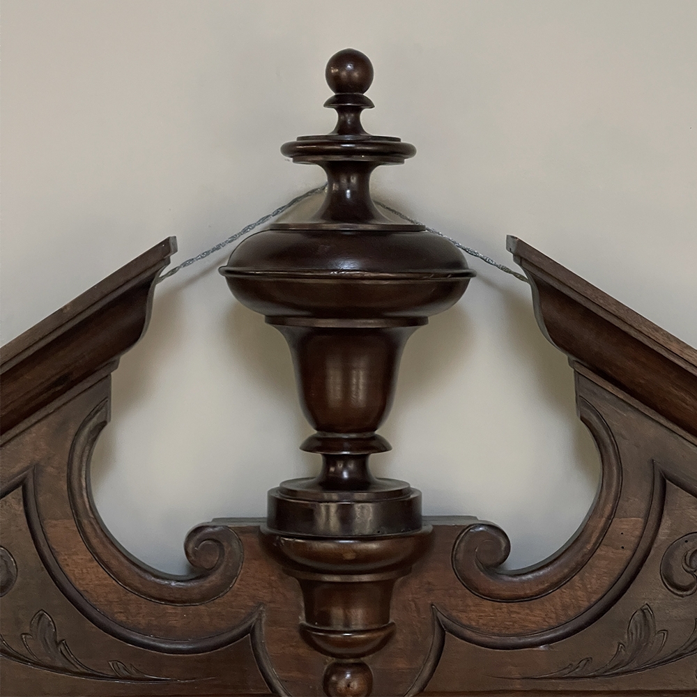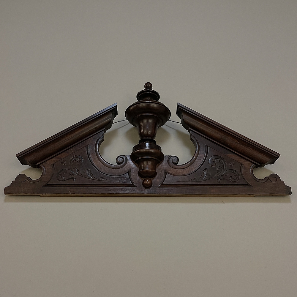 19th Century French Walnut Neoclassical Decorative Crown was inspired by ancient Greek and Roman architecture. The pitched molding design provides a framework for the magnificent solid walnut turned finial at the center, with floral embellishments carved into the facade for added visual appeal. Ideal over cased openings or windows!