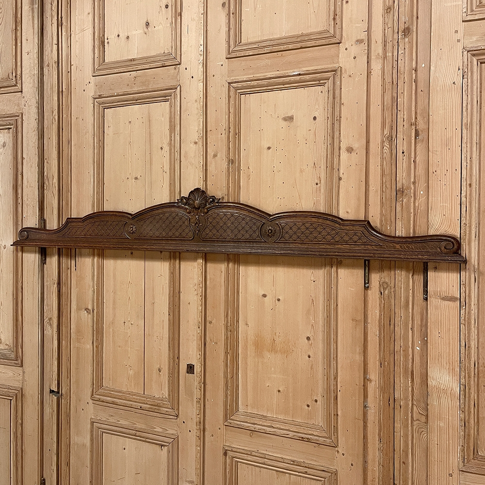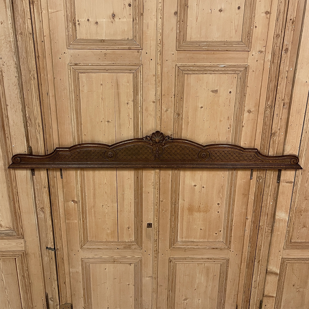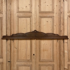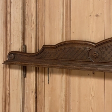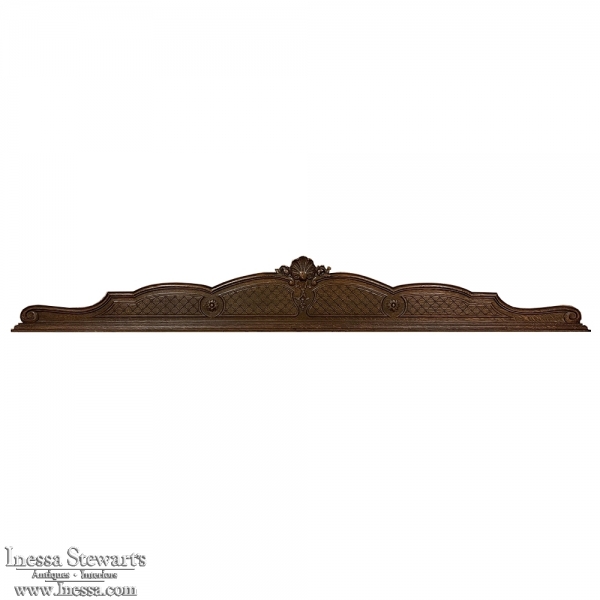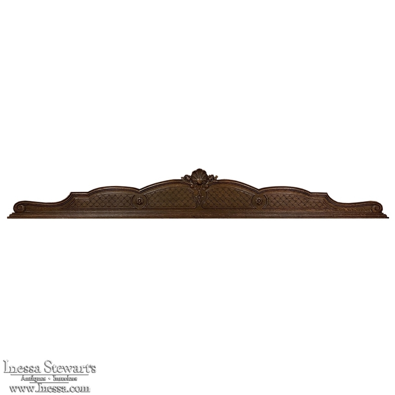 Antique Country French Decorative Trim Panel is a great piece for adding a special accent to a cased opening, over a doorway or window, or even to use as a valence! Carved from a single plank of solid oak, it features stylized shell, floral and foliate motifs and a cross-hatched pattern to provide Old World elegance. Otherwise plain or common openings between room spaces can be enhanced just by attaching it above. One clever designer turned it upside down, mounted it on the ceiling over a window and used it to cover the curtain rod!