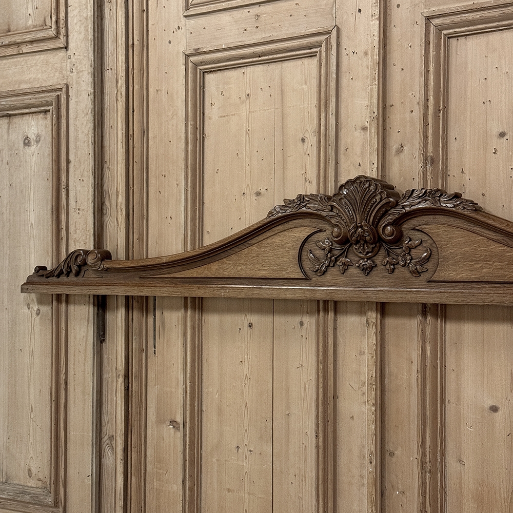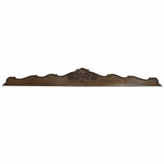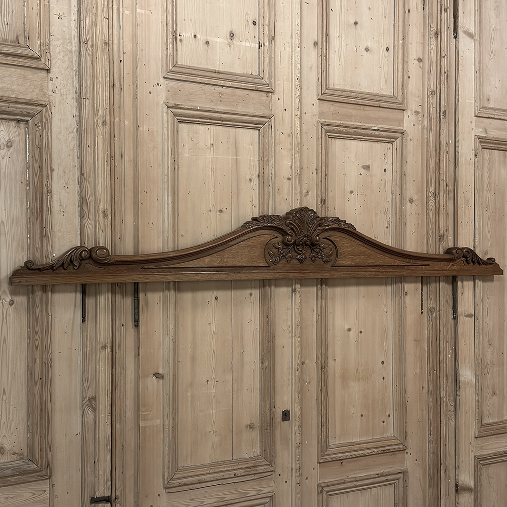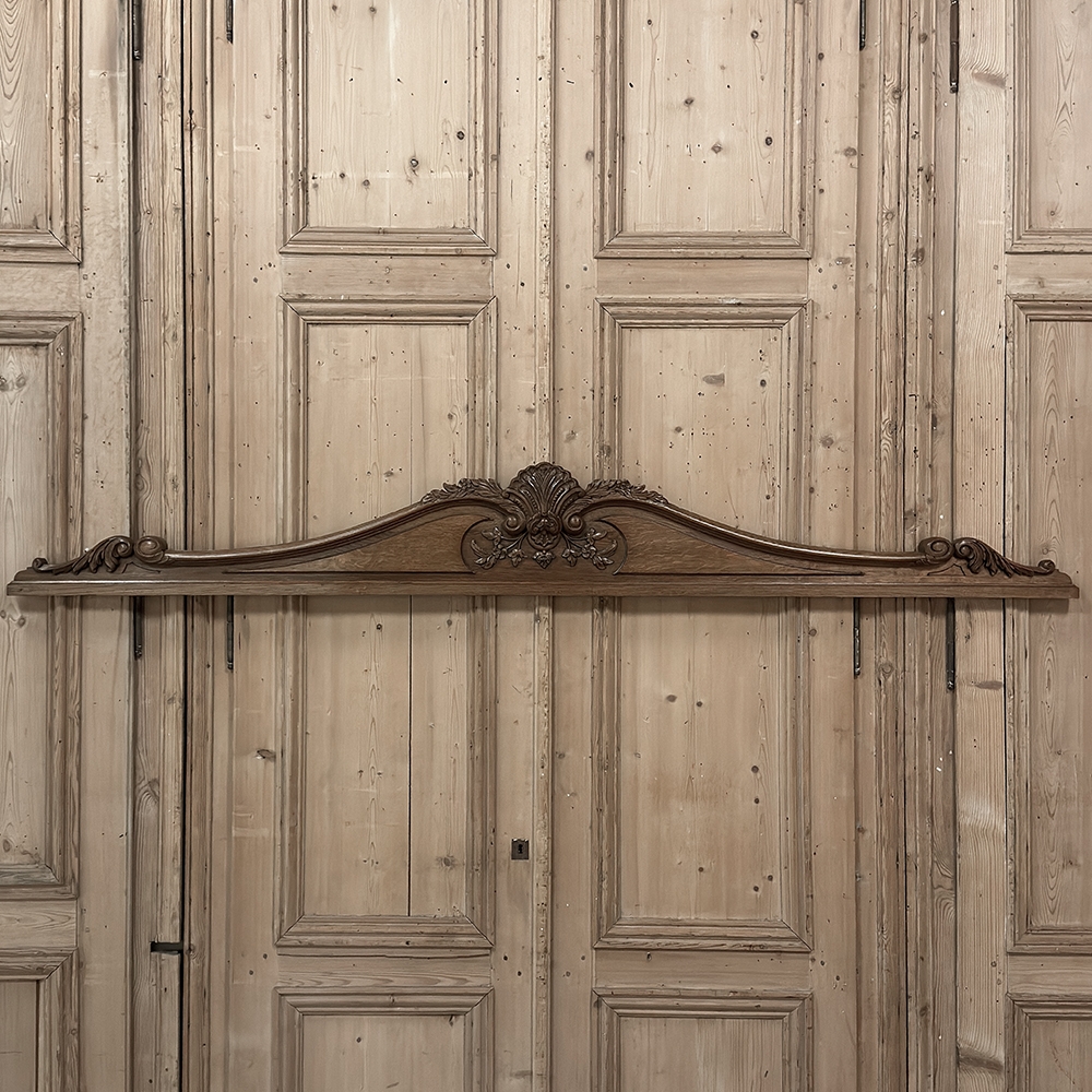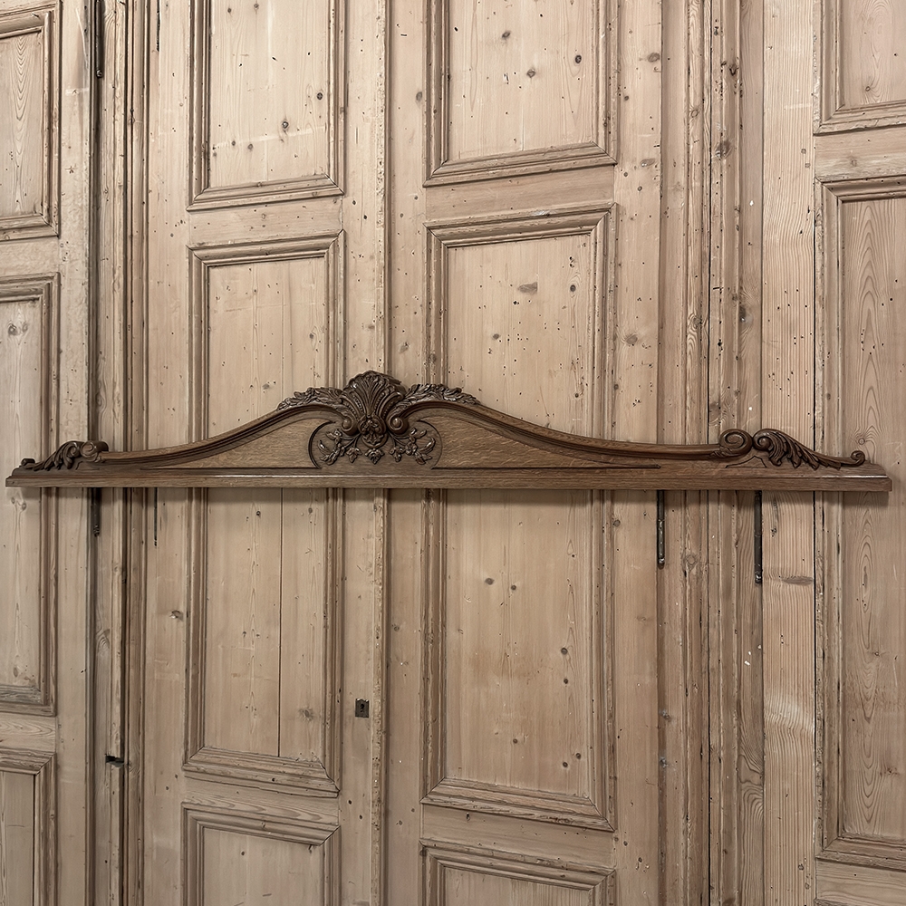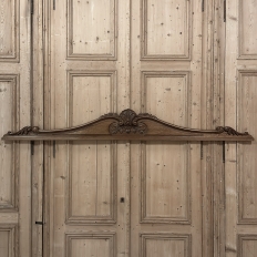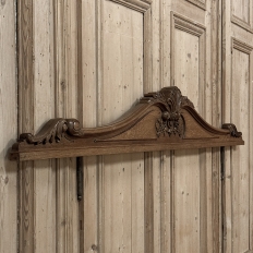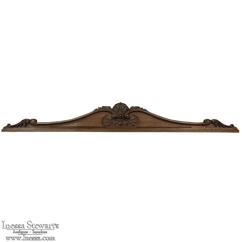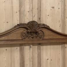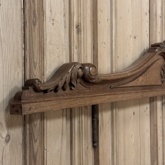 Antique Country French Decorative Trim Panel is a great piece for adding a special accent to a cased opening, over a doorway or window, or even to use as a valence! Carved from a single plank of solid oak, it features stylized shell and foliate motifs on an elegantly scrolled framework to provide Old World elegance. Otherwise plain or common openings between room spaces can be enhanced just by attaching it above. One clever designer turned it upside down, mounted it on the ceiling over a window and used it to cover the curtain rod!