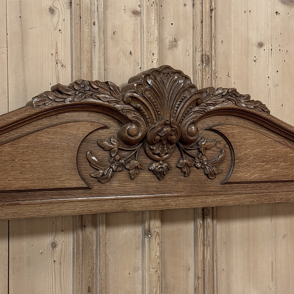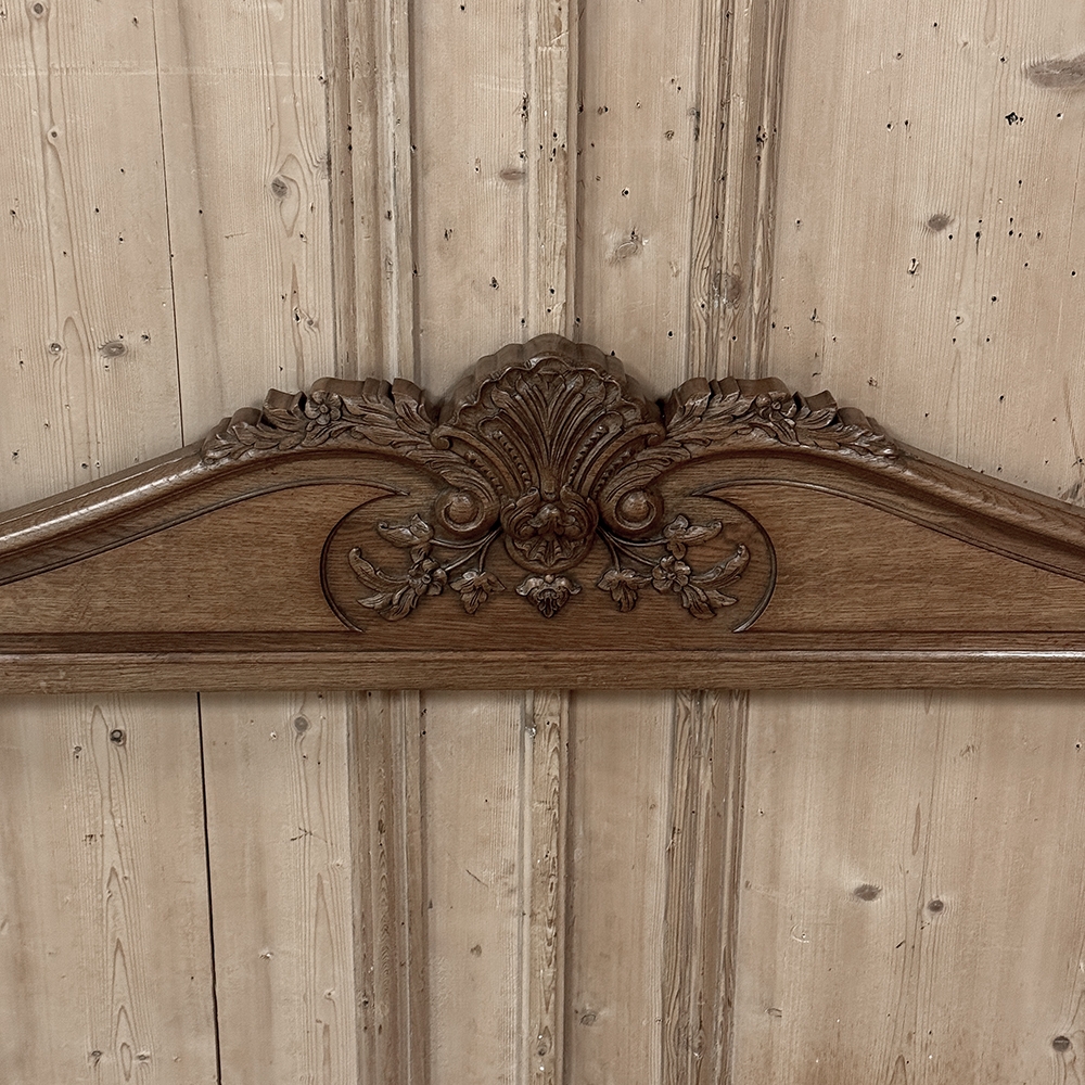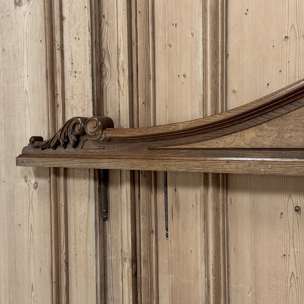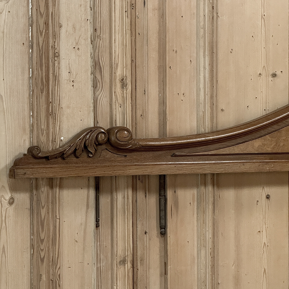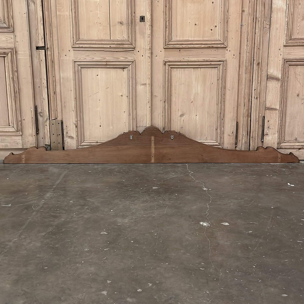 Antique Country French Decorative Trim Panel is a great piece for adding a special accent to a cased opening, over a doorway or window, or even to use as a valence! Carved from a single plank of solid oak, it features stylized shell and foliate motifs on an elegantly scrolled framework to provide Old World elegance. Otherwise plain or common openings between room spaces can be enhanced just by attaching it above. One clever designer turned it upside down, mounted it on the ceiling over a window and used it to cover the curtain rod!