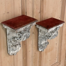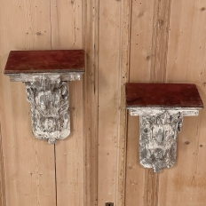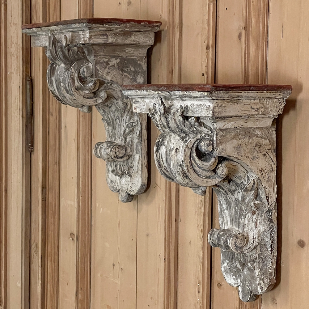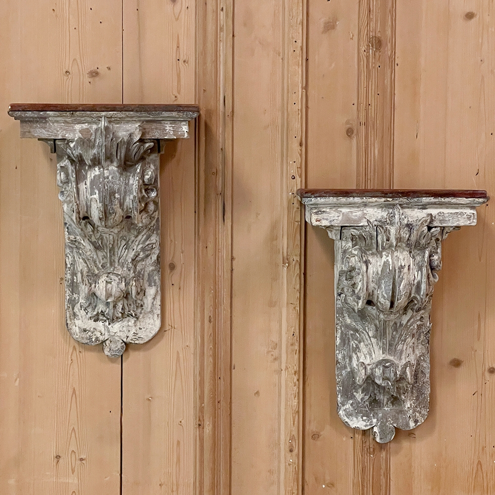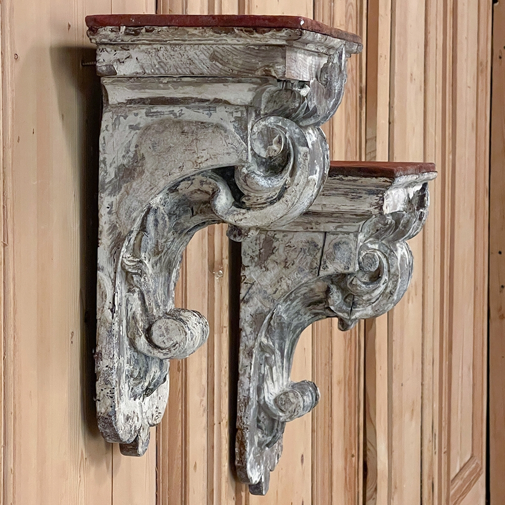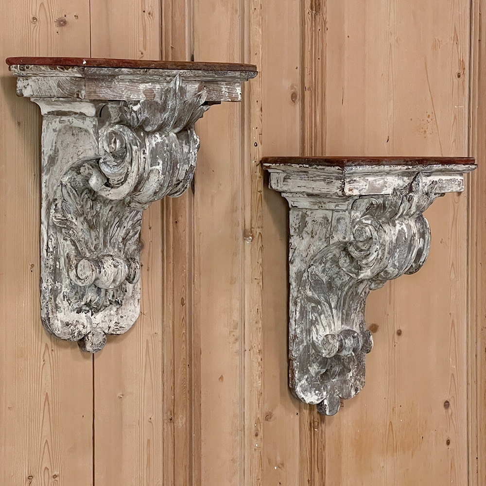 Pair 18th century French neoclassical hand-carved and painted wall sconces ~ Corbels were sculpted from solid oak and feature a timeless classical scroll festooned with acanthus flourishes above and below, rendered in full and glorious relief! The wood was then given a distressed painted finish with antiqued wine colored surfaces to help set off your objet d'art, or to just beautify the room without anything on the surface! Such a pair would have been considered essential wall accessories to any well-designed room plan, as they add both flair and surface area, with frequent use as a candlestick platform for additional illumination in the room. Today they can be used to accent an otherwise bland cased opening, or anywhere a little architectural accent would spice things up!