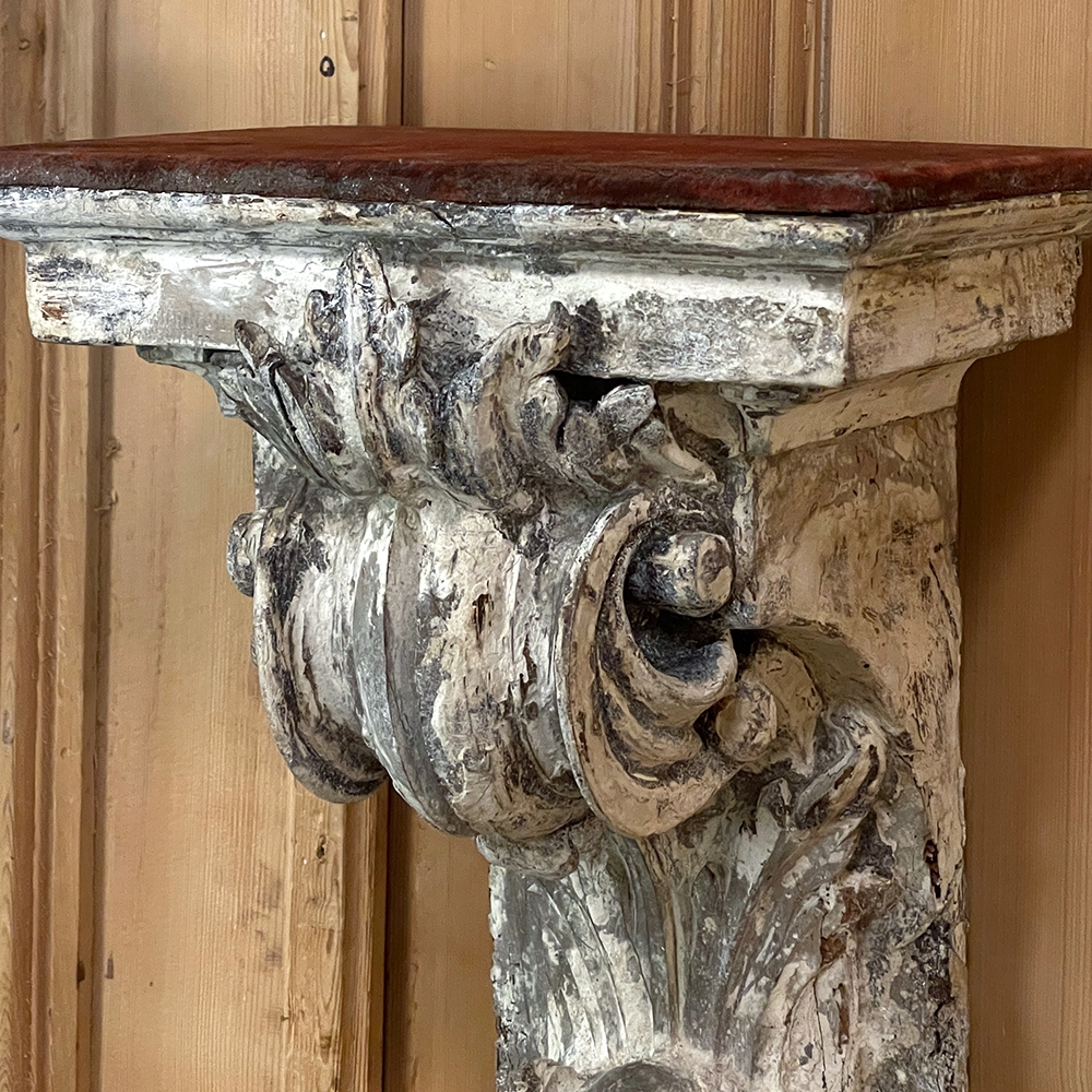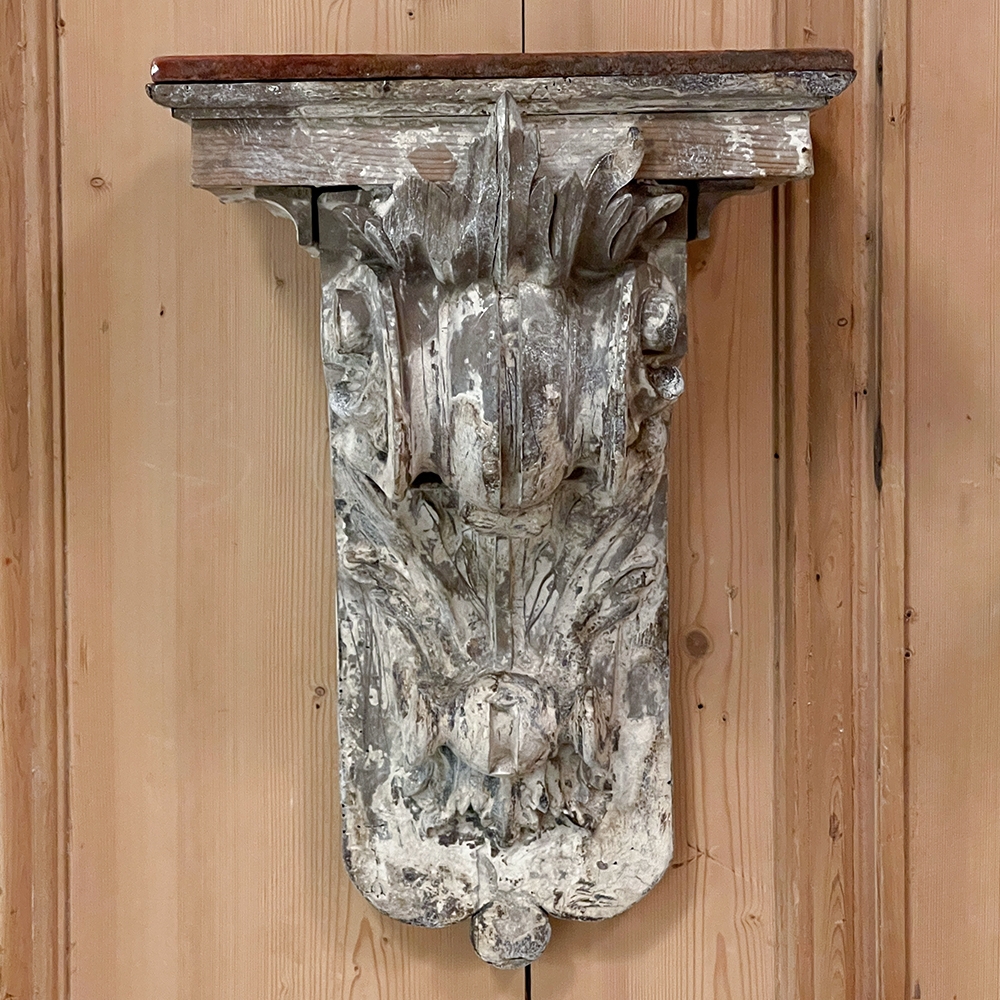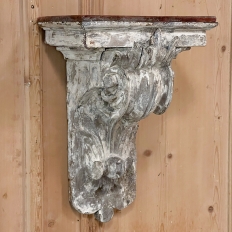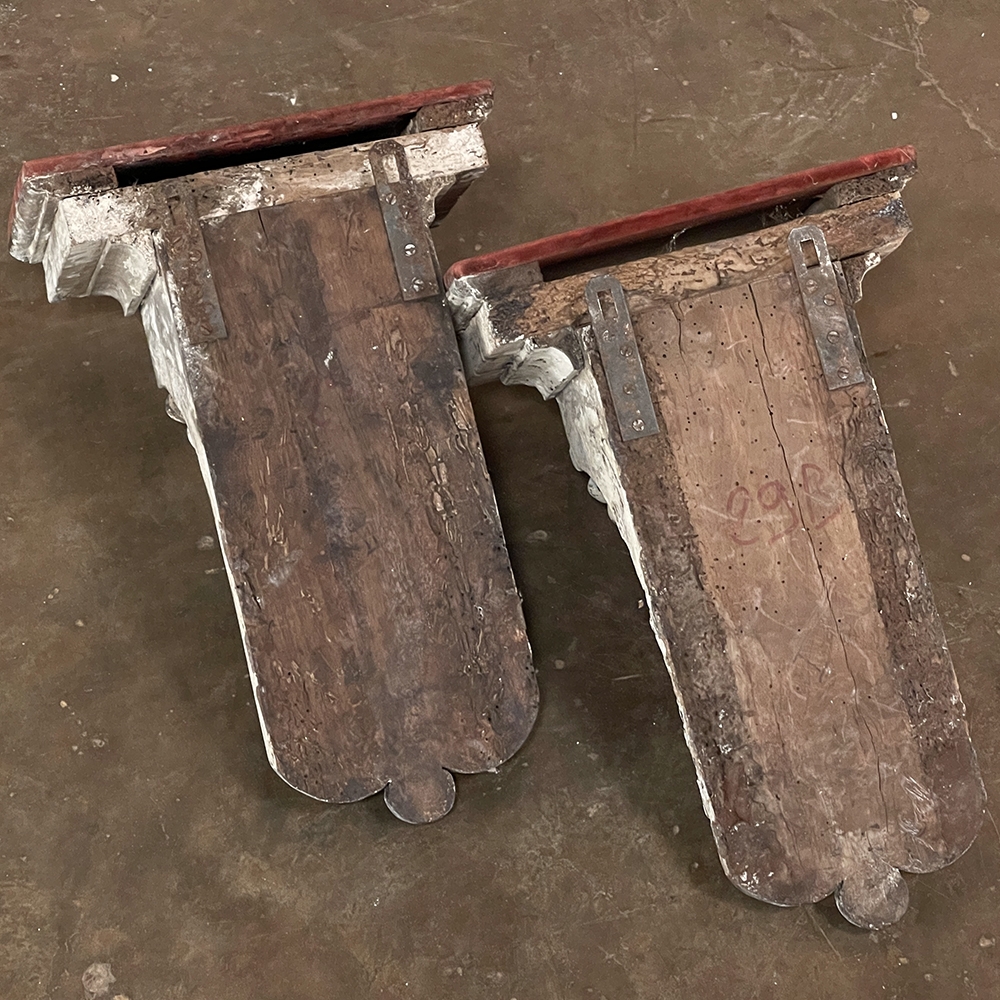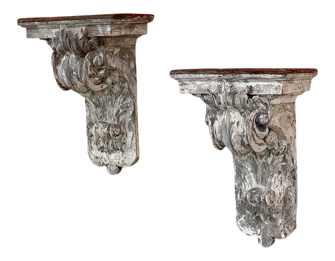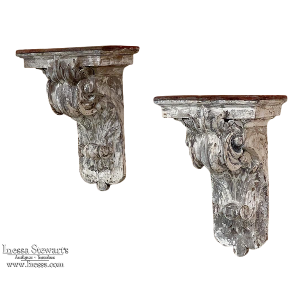 Pair 18th century French neoclassical hand-carved and painted wall sconces ~ Corbels were sculpted from solid oak and feature a timeless classical scroll festooned with acanthus flourishes above and below, rendered in full and glorious relief! The wood was then given a distressed painted finish with antiqued wine colored surfaces to help set off your objet d'art, or to just beautify the room without anything on the surface! Such a pair would have been considered essential wall accessories to any well-designed room plan, as they add both flair and surface area, with frequent use as a candlestick platform for additional illumination in the room. Today they can be used to accent an otherwise bland cased opening, or anywhere a little architectural accent would spice things up!