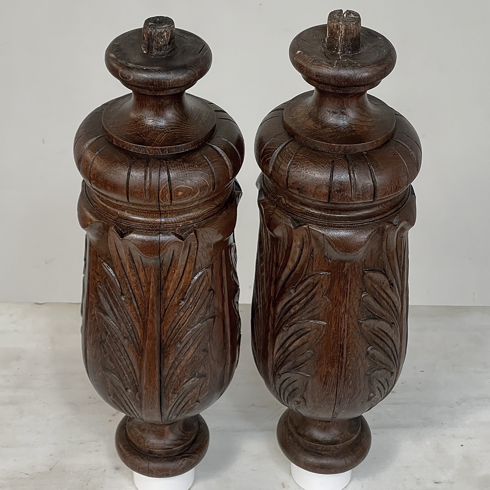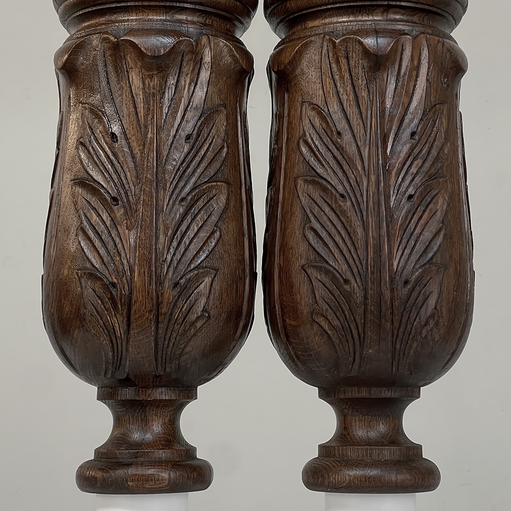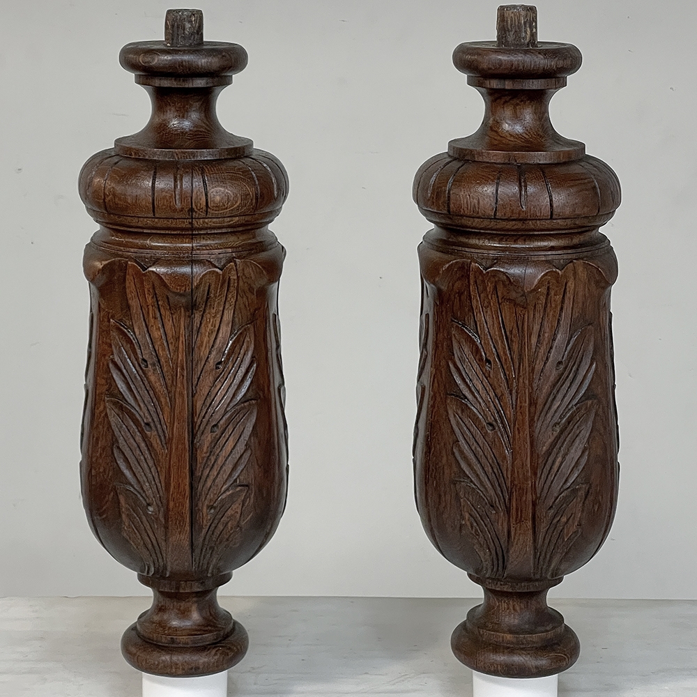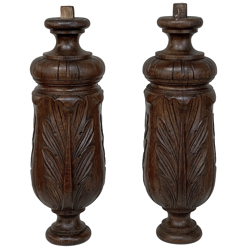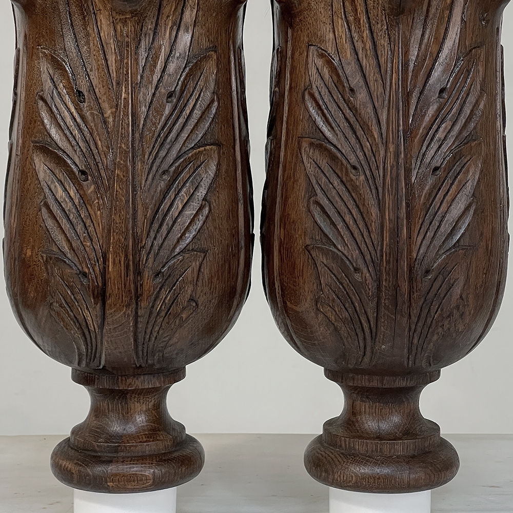 Pair Antique Neoclassical Hand-Carved Oak Pediments are ideal for decorative purposes, accents, bookcases, or to incorporate into your built-in cabinet designs. Hand-sculpted from solid oak, each features an urn form carved in relief with upturned acanthus plumes all around. Originally created to support the fronts of upper cabinets, the pair will make unique and wonderful accents to your interior decor. Note some dowels are still there, but can be removed if not needed.
