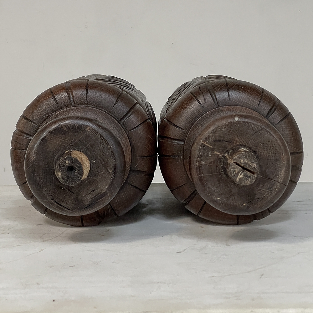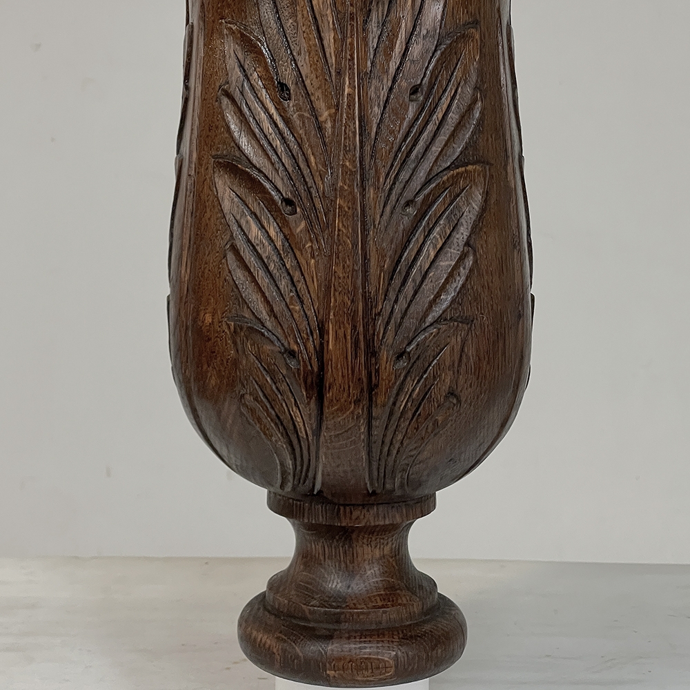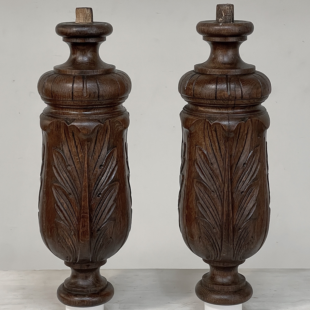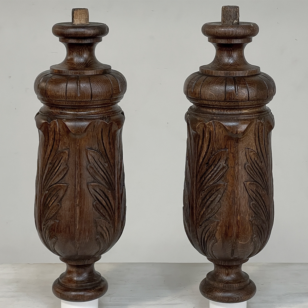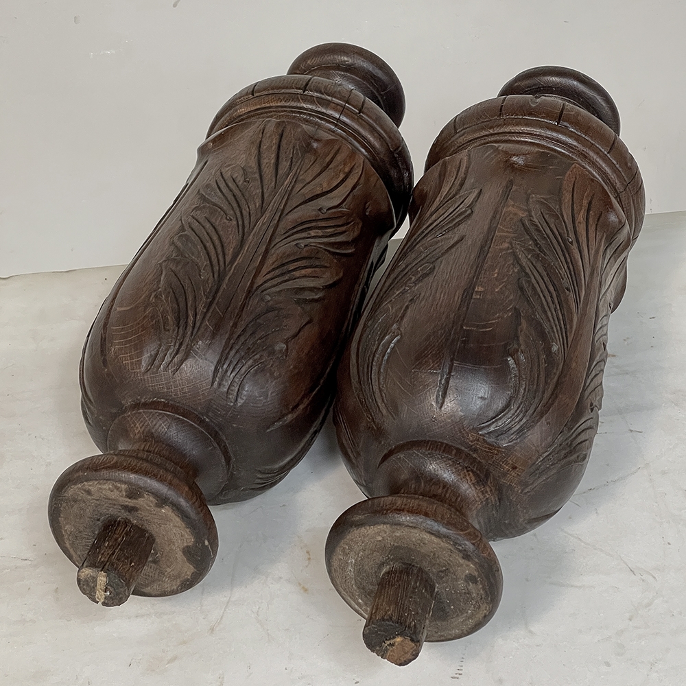 Pair Antique Neoclassical Hand-Carved Oak Pediments are ideal for decorative purposes, accents, bookcases, or to incorporate into your built-in cabinet designs. Hand-sculpted from solid oak, each features an urn form carved in relief with upturned acanthus plumes all around. Originally created to support the fronts of upper cabinets, the pair will make unique and wonderful accents to your interior decor. Note some dowels are still there, but can be removed if not needed.