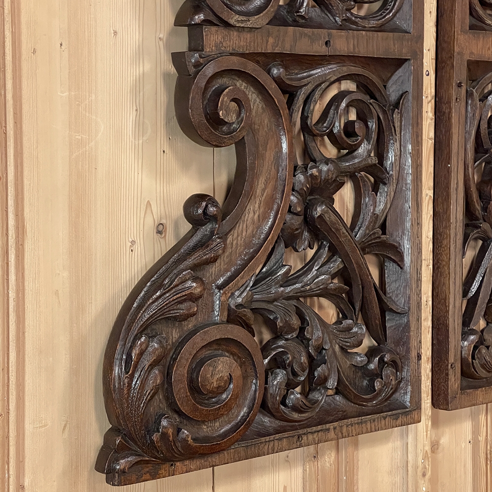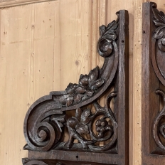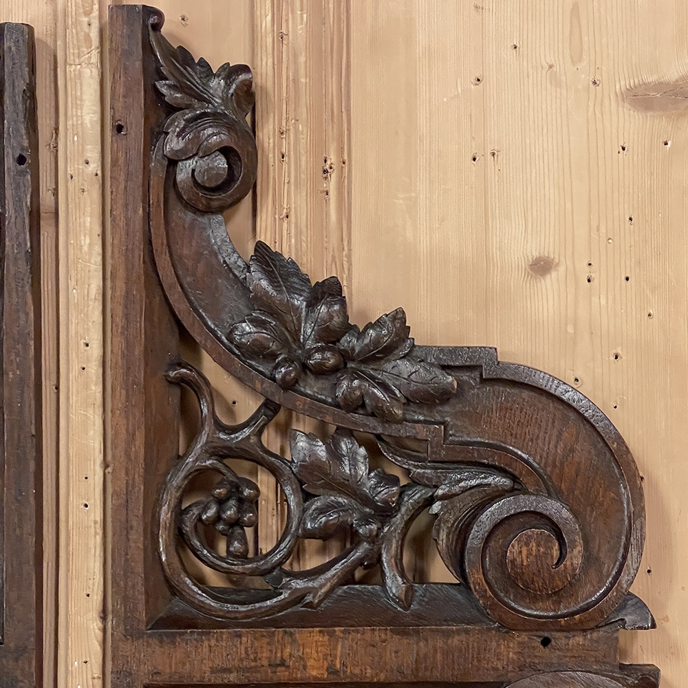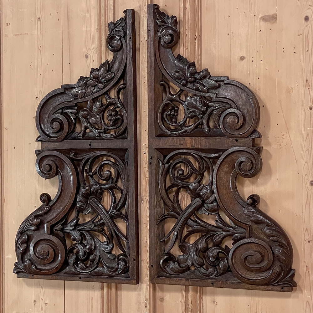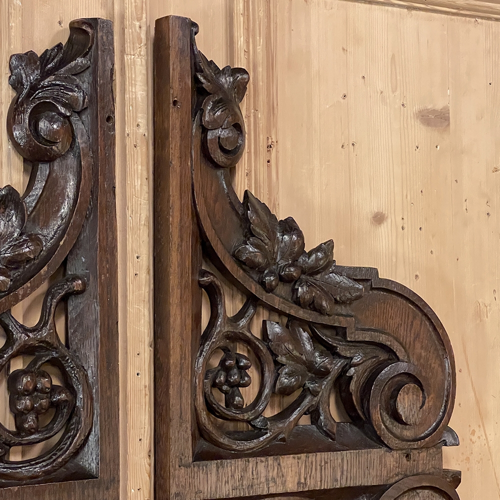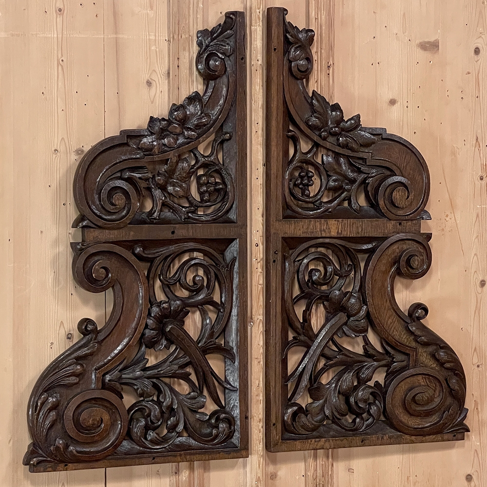 Pair Mid-19th Century French Renaissance Carved Architectural Decorations are a marvel of the sculptor's art! The intricate naturalistic form features bold scrollwork, grapevines, burgeoning flowers and glorious acanthus leaves in multiple forms. Mount them on the wall for an interesting visual effect, or use in the upper corners of a cased opening for decorative corbels. Hand-carved from dense, old-growth oak for centuries of enjoyment!