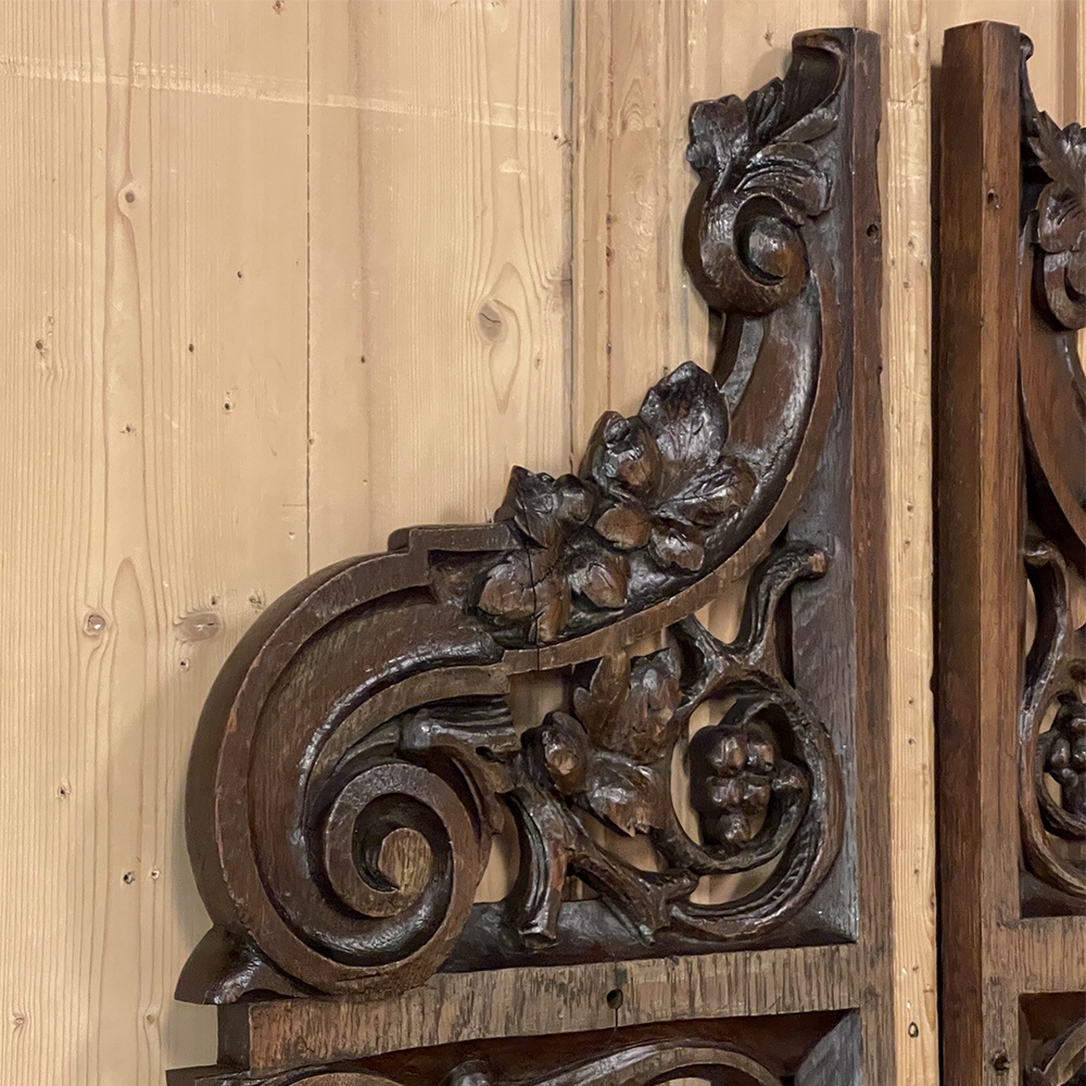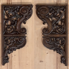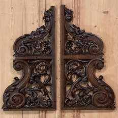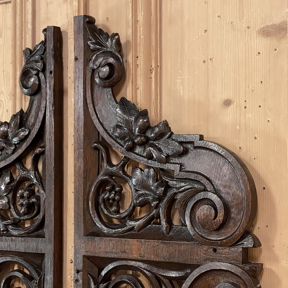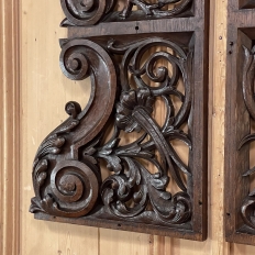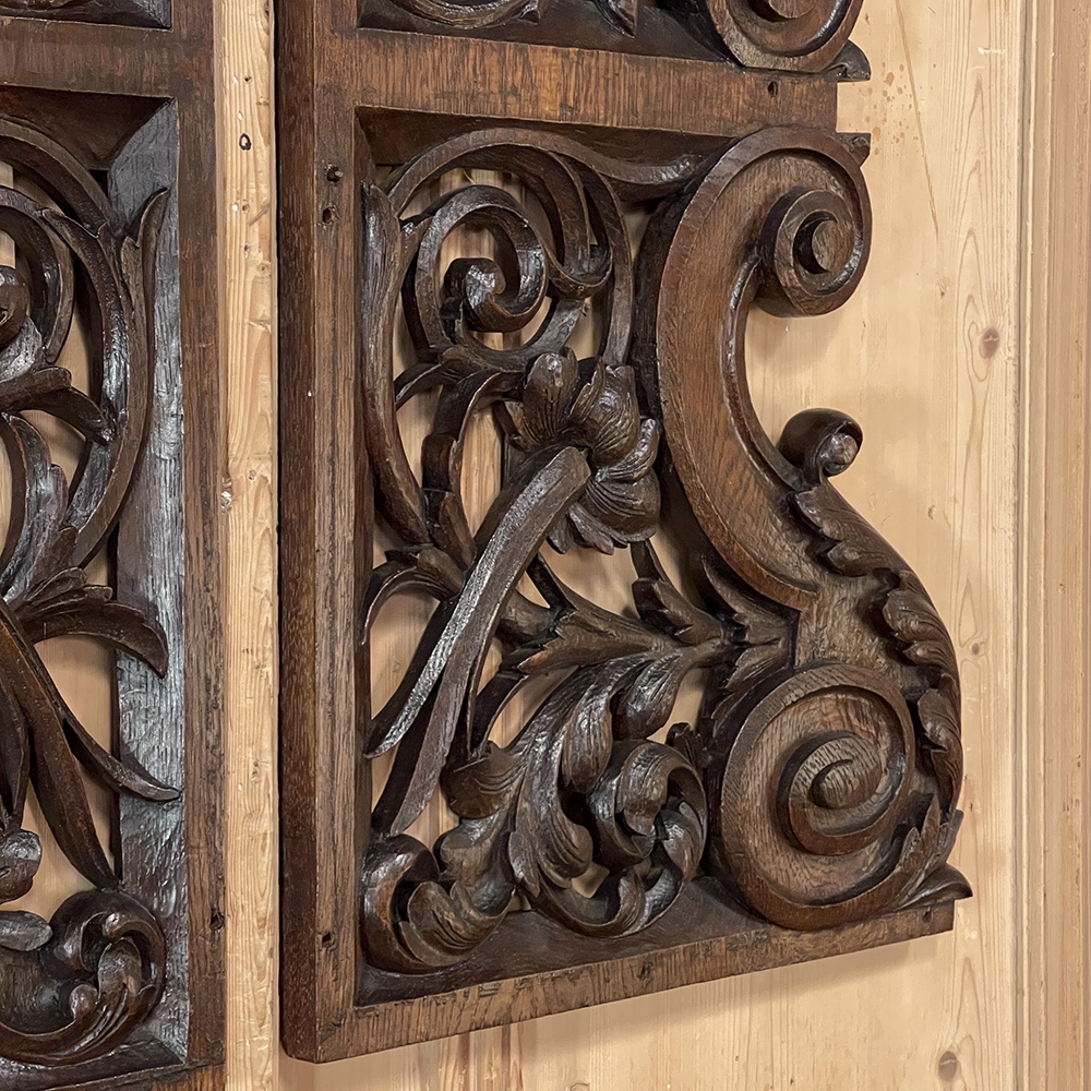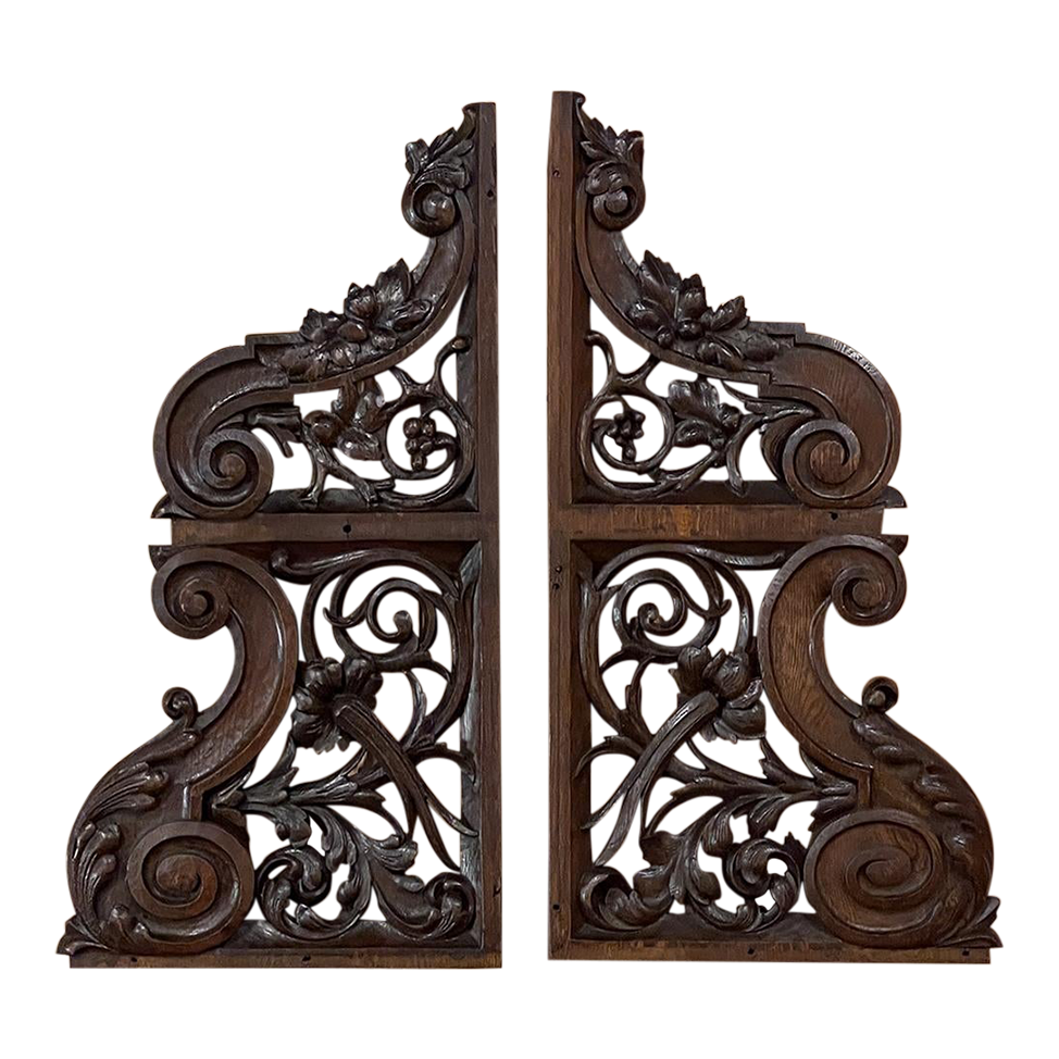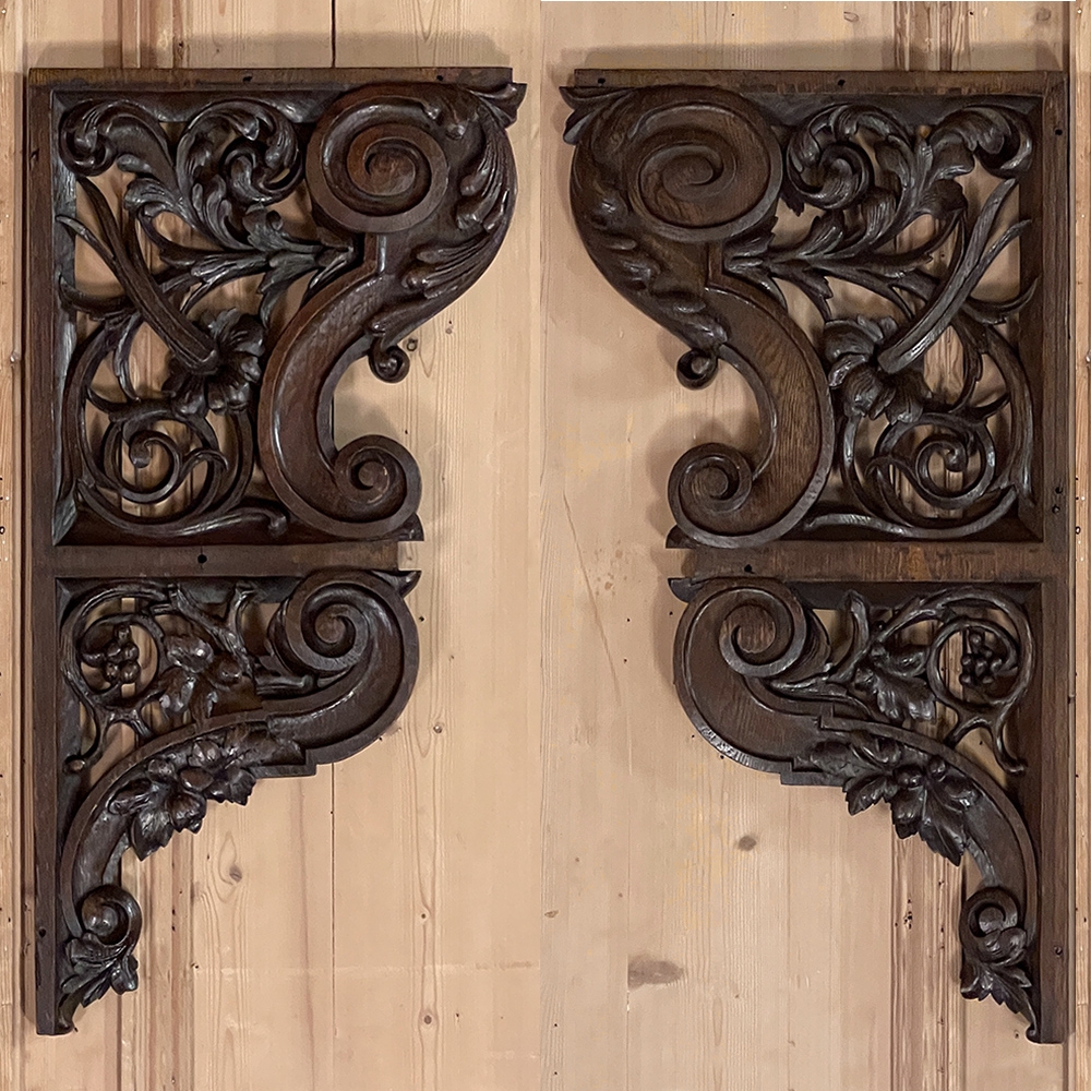 Pair Mid-19th Century French Renaissance Carved Architectural Decorations are a marvel of the sculptor's art! The intricate naturalistic form features bold scrollwork, grapevines, burgeoning flowers and glorious acanthus leaves in multiple forms. Mount them on the wall for an interesting visual effect, or use in the upper corners of a cased opening for decorative corbels. Hand-carved from dense, old-growth oak for centuries of enjoyment!