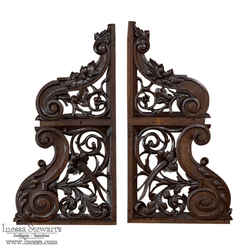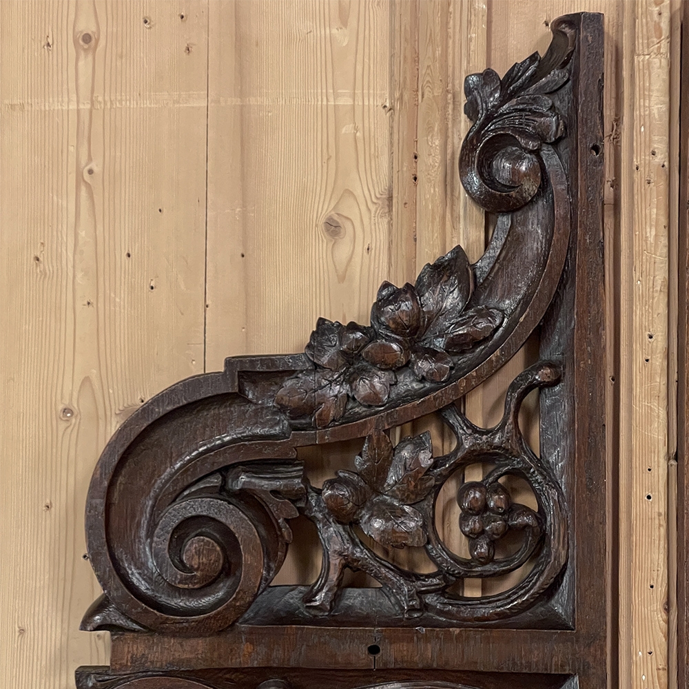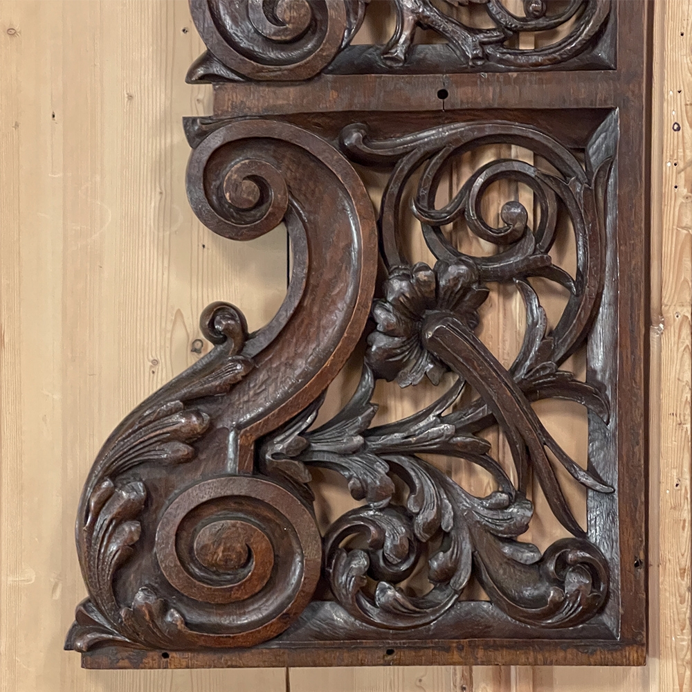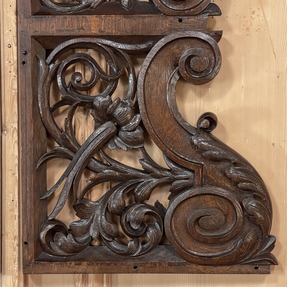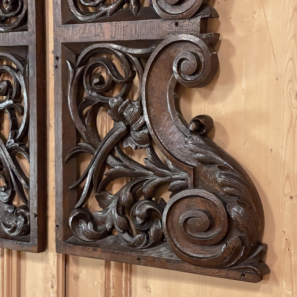 Pair Mid-19th Century French Renaissance Carved Architectural Decorations are a marvel of the sculptor's art! The intricate naturalistic form features bold scrollwork, grapevines, burgeoning flowers and glorious acanthus leaves in multiple forms. Mount them on the wall for an interesting visual effect, or use in the upper corners of a cased opening for decorative corbels. Hand-carved from dense, old-growth oak for centuries of enjoyment!