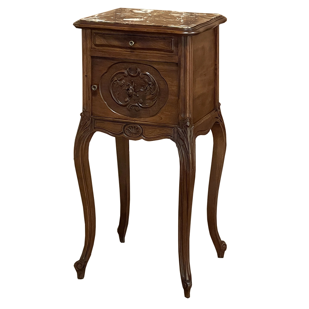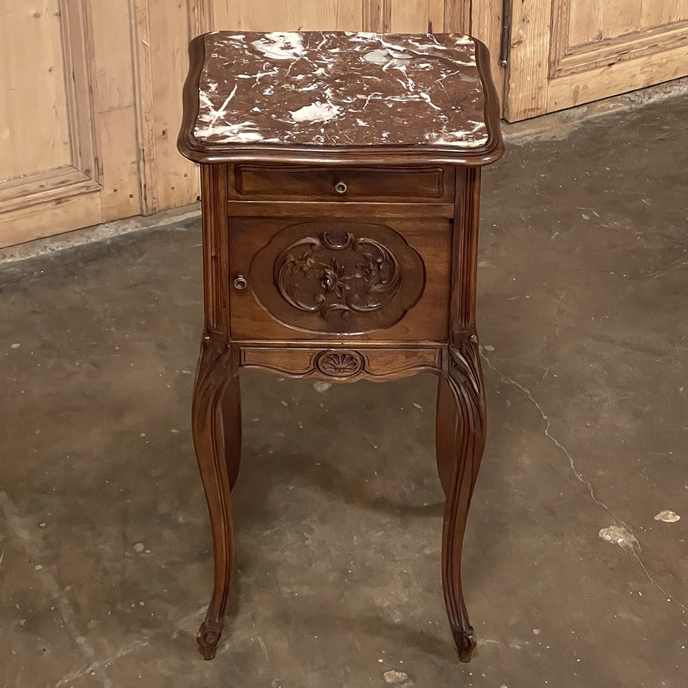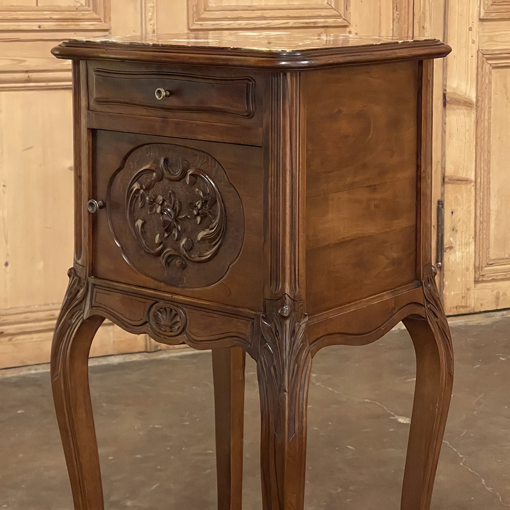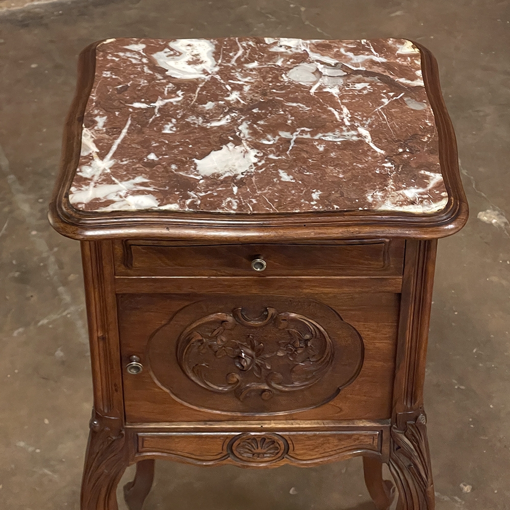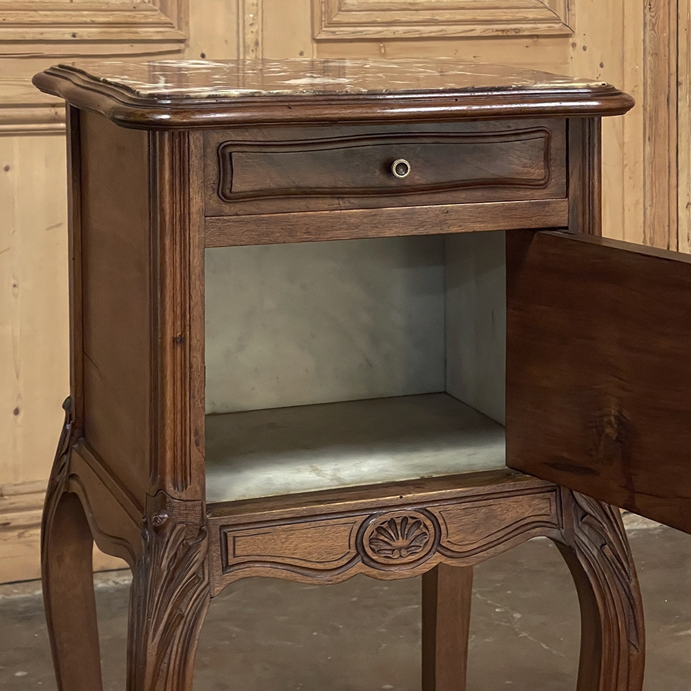 Sale19th Century French Louis XV Walnut Marble Top Nightstand is a classic example of the genre, rendered in sumptuous French walnut and topped with beautifully veined marble for a timeless effect. The front facade has been beautifully carved directly into the cabinet door with relief depictions of flowers, foliage and acanthus fronds. A shell appears on the apron below, contrasting the tailored molding of the drawer. The four cabriole legs have been graced with carved detail, adorned with bold acanthus plumes on the shoulders and escargots on the tips of the feet. Cast brass knobs add a nice accent, and the cabinet door drops open to reveal an additional marble-lined storage compartment, augmenting that of the drawer above. Finished on all sides, it is suitable not only as a bedside companion, but also in other rooms as an end table or side table in a seating group, making a great spot for a lamp with a drawer for remote controls and a cabinet for books and magazines.