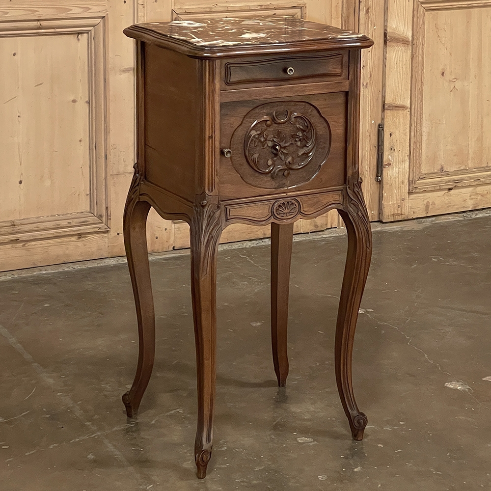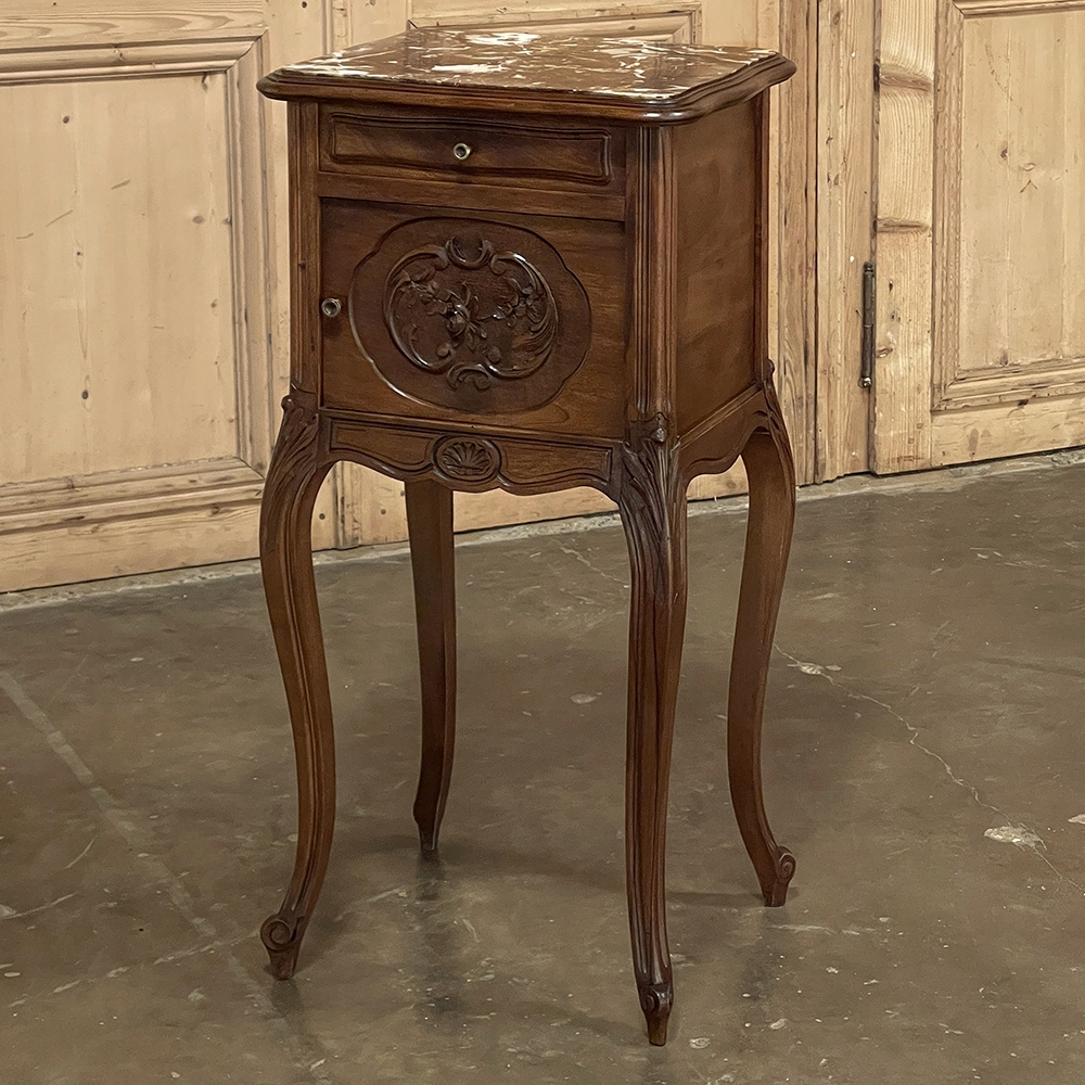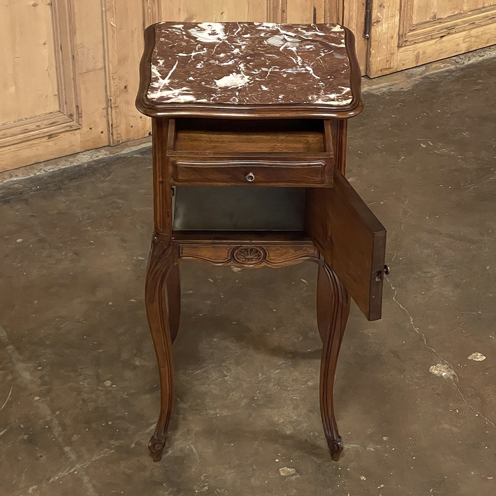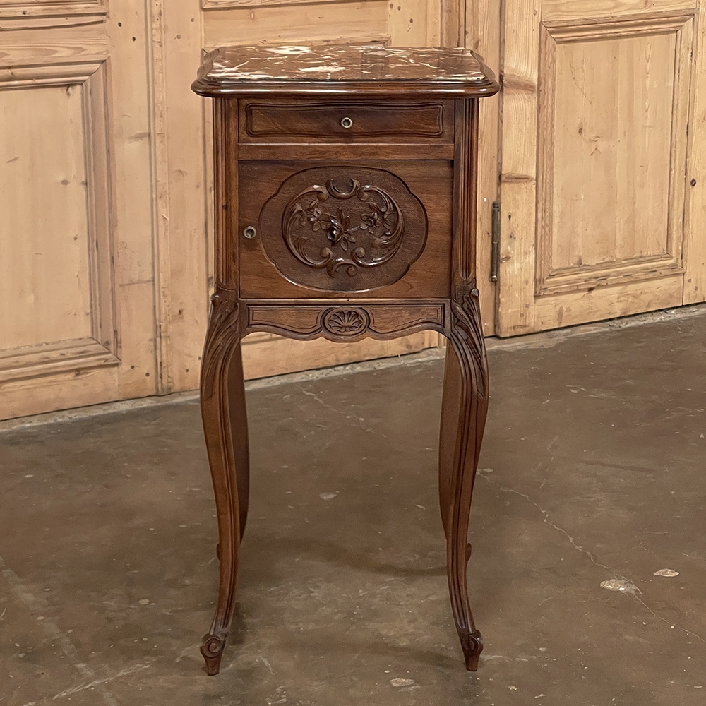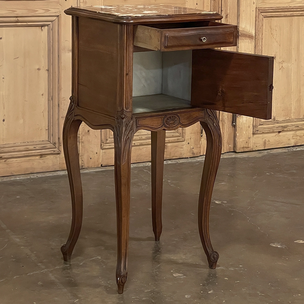 Sale19th Century French Louis XV Walnut Marble Top Nightstand is a classic example of the genre, rendered in sumptuous French walnut and topped with beautifully veined marble for a timeless effect. The front facade has been beautifully carved directly into the cabinet door with relief depictions of flowers, foliage and acanthus fronds. A shell appears on the apron below, contrasting the tailored molding of the drawer. The four cabriole legs have been graced with carved detail, adorned with bold acanthus plumes on the shoulders and escargots on the tips of the feet. Cast brass knobs add a nice accent, and the cabinet door drops open to reveal an additional marble-lined storage compartment, augmenting that of the drawer above. Finished on all sides, it is suitable not only as a bedside companion, but also in other rooms as an end table or side table in a seating group, making a great spot for a lamp with a drawer for remote controls and a cabinet for books and magazines.