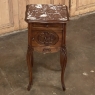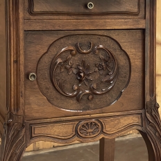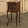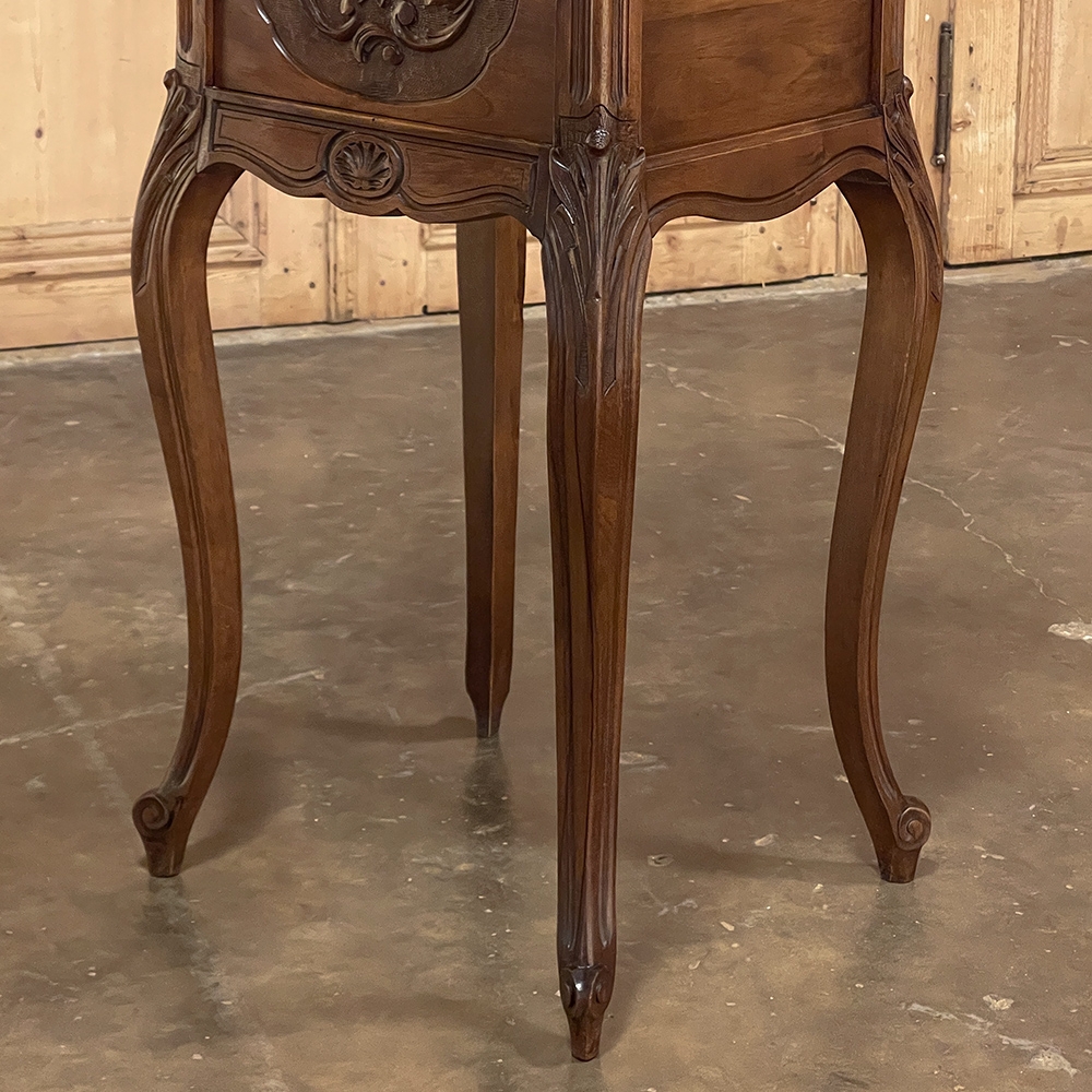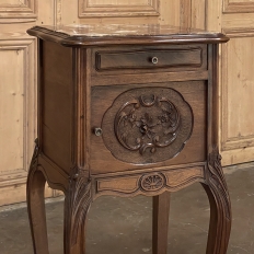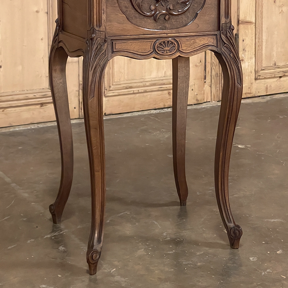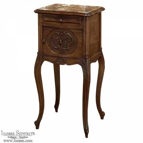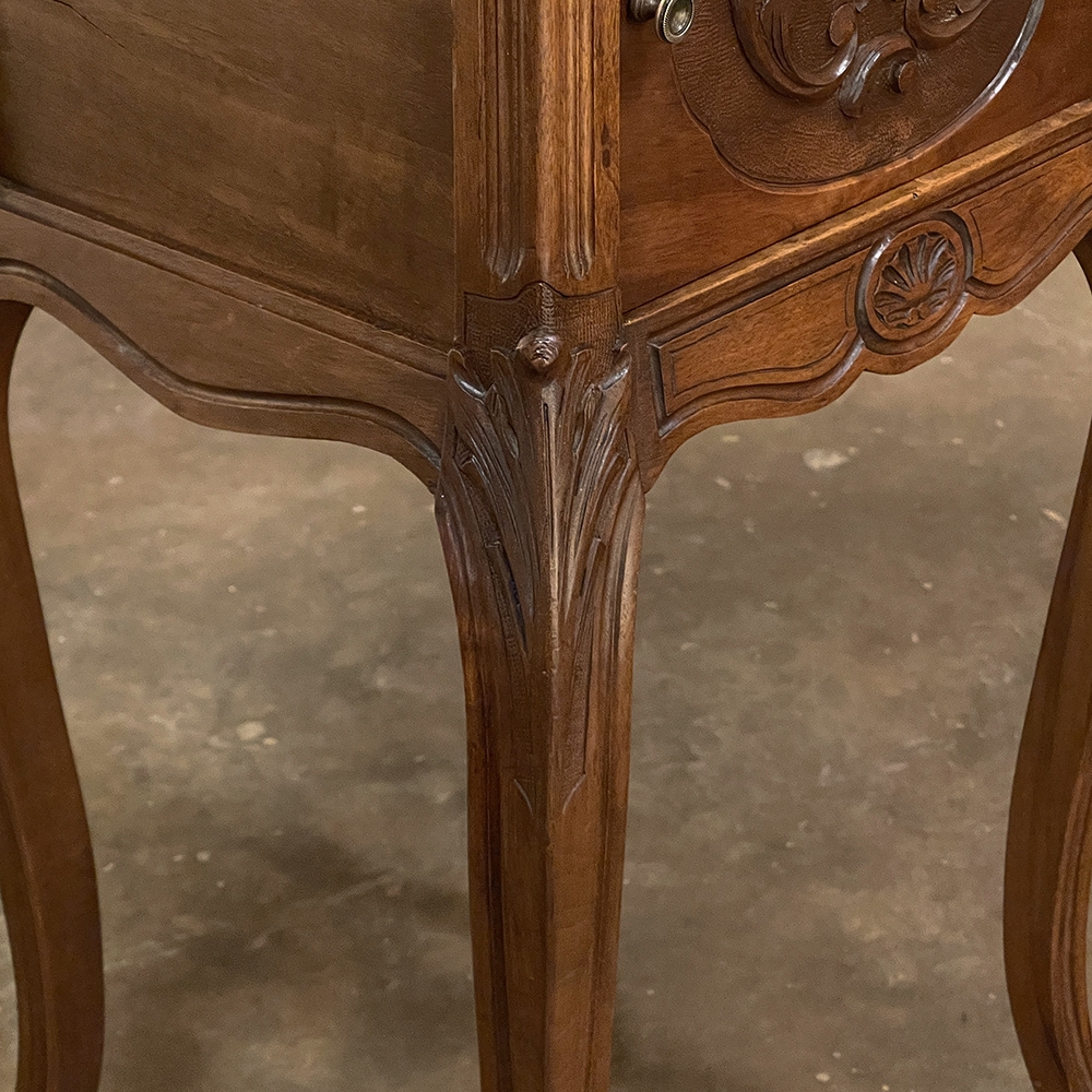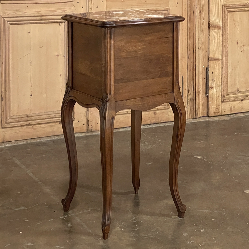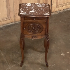 Sale19th Century French Louis XV Walnut Marble Top Nightstand is a classic example of the genre, rendered in sumptuous French walnut and topped with beautifully veined marble for a timeless effect. The front facade has been beautifully carved directly into the cabinet door with relief depictions of flowers, foliage and acanthus fronds. A shell appears on the apron below, contrasting the tailored molding of the drawer. The four cabriole legs have been graced with carved detail, adorned with bold acanthus plumes on the shoulders and escargots on the tips of the feet. Cast brass knobs add a nice accent, and the cabinet door drops open to reveal an additional marble-lined storage compartment, augmenting that of the drawer above. Finished on all sides, it is suitable not only as a bedside companion, but also in other rooms as an end table or side table in a seating group, making a great spot for a lamp with a drawer for remote controls and a cabinet for books and magazines.