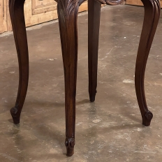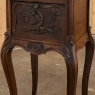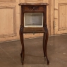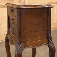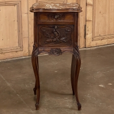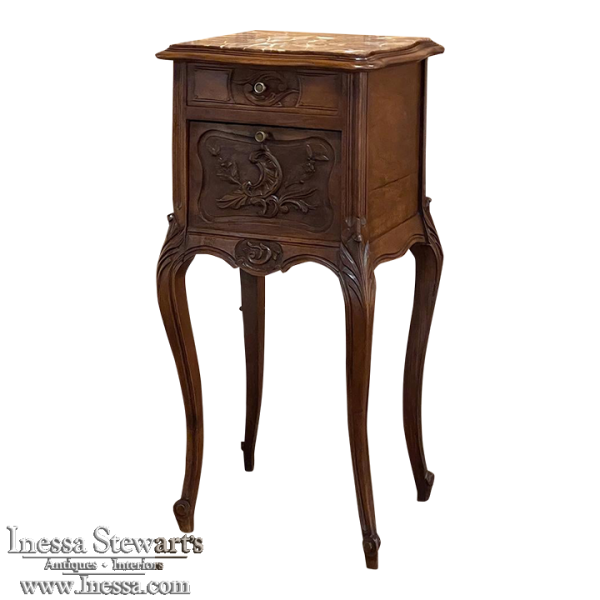 Sale19th Century French Louis XV Walnut Marble Top Nightstand is a classic example of the genre, rendered in sumptuous French walnut and topped with beautifully veined marble for a timeless effect. The front facade has been beautifully carved directly into the cabinet door with a classic Rococo composition of asymmetrical shell, floral and foliates. A flourish appears on the apron below, as well. The four cabriole legs have been graced with carved detail, adorned with bold acanthus plumes on the shoulders and escargots on the tips of the feet. Cast brass knobs add a nice accent, and the cabinet door drops open to reveal an additional porcelain-lined storage compartment, augmenting that of the drawer above. Finished on all sides, it is suitable not only as a bedside companion, but also in other rooms as an end table or side table in a seating group, making a great spot for a lamp with a drawer for remote controls and a cabinet for books and magazines.