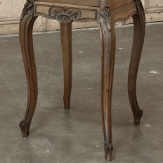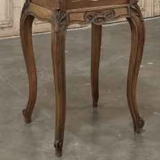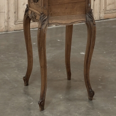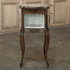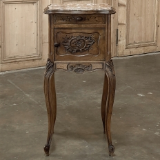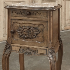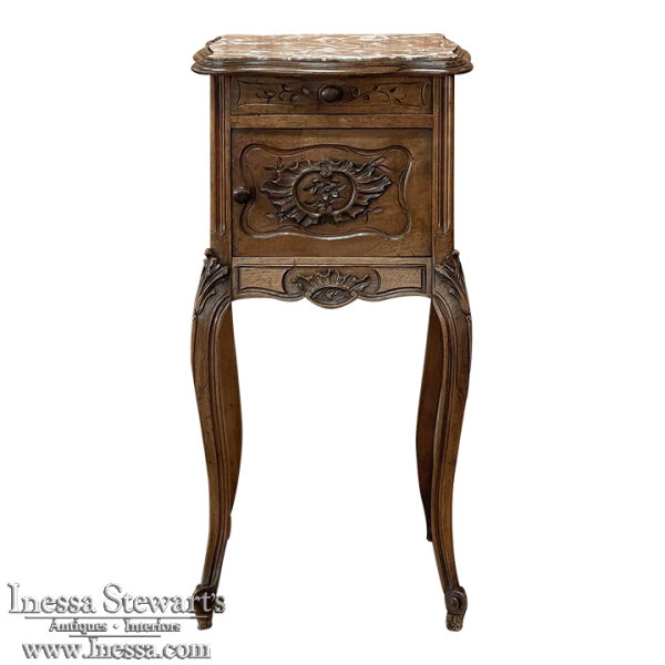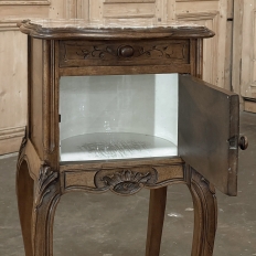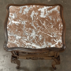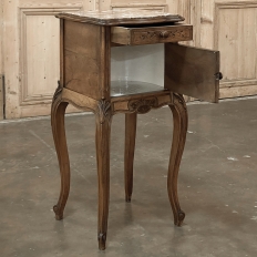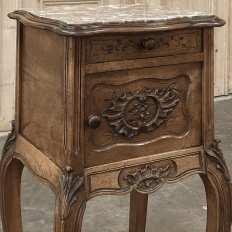 Sale19th Century French Louis XV Walnut Marble Top Nightstand is a classic example of the genre, rendered in sumptuous French walnut and topped with beautifully veined marble for a timeless effect. The front facade has been beautifully carved directly into the cabinet door with stylized shell and foliates in relief. A shell flourish appears on the apron below, contrasting the tailored molding of the drawer. The four cabriole legs have been graced with carved detail, adorned with bold acanthus plumes on the shoulders and escargots on the tips of the feet. Cast brass knobs add a nice accent, and the cabinet door opens to reveal a porcelain-lined storage compartment, augmenting that of the drawer above. Finished on all sides, it is suitable not only as a bedside companion, but also in other rooms as an end table or side table in a seating group, making a great spot for a lamp with a drawer for remote controls and a cabinet for books and magazines.