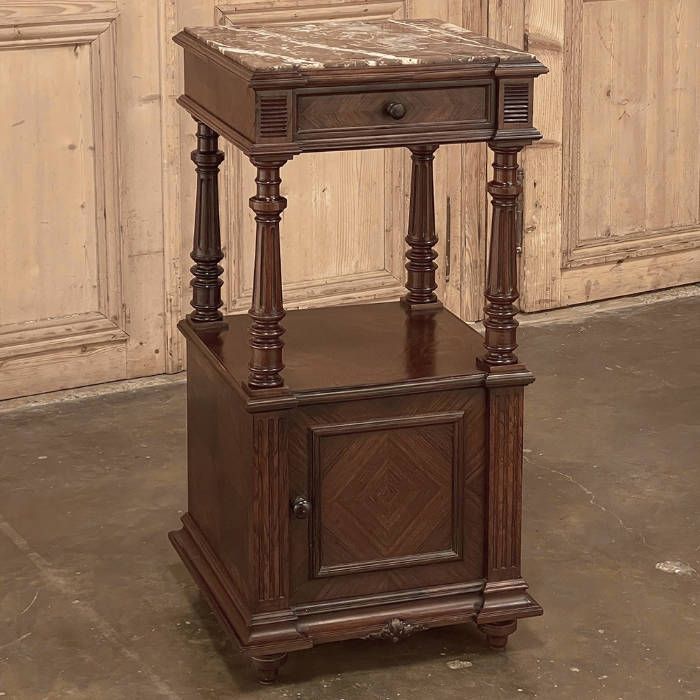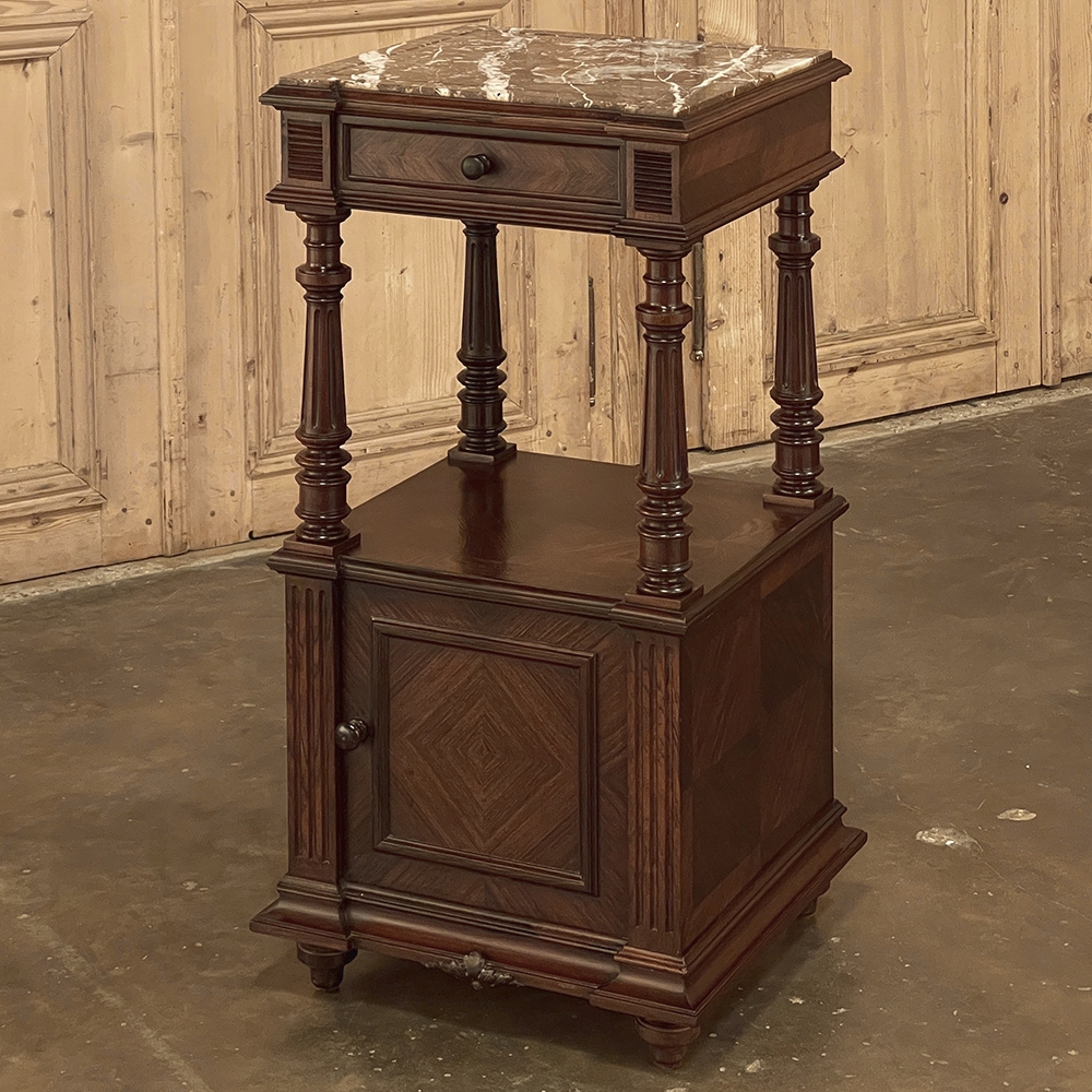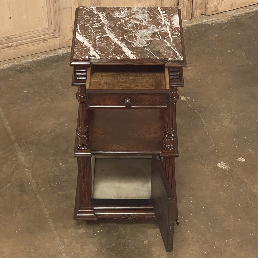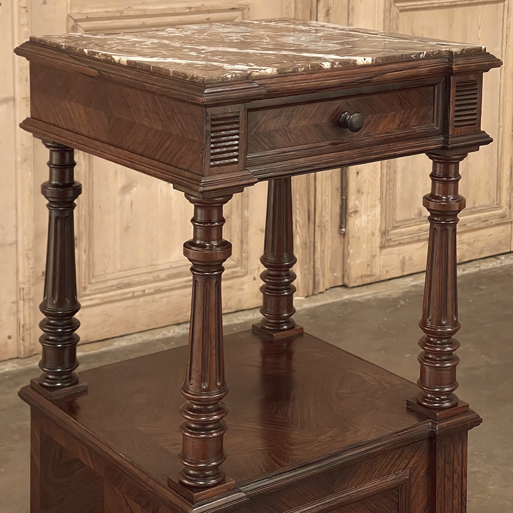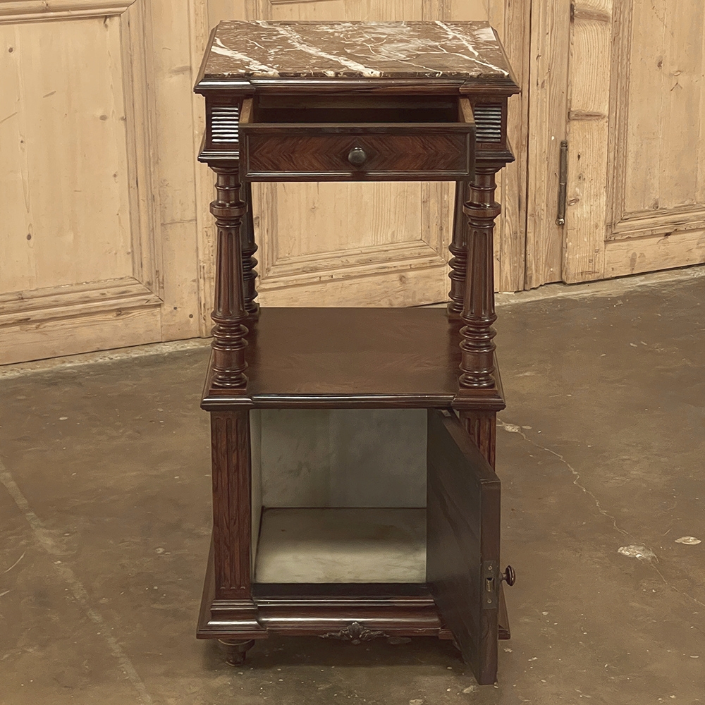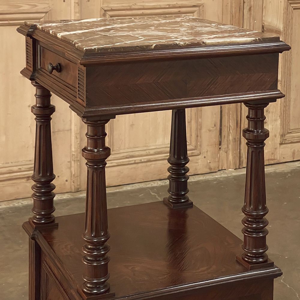 19th Century French Louis XVI Rosewood Marble Top Nightstand were crafted from what is considered the king of woods, obtained in such abundance during the late 18th and entire 19th centuries by European furniture makers that the species is protected today. The rich natural coloration and ability to last for centuries without signs of aging were its strongest points. This nightstand illustrates the point, with classical styling inspired by the ancient Greeks and Romans, including rosettes flanking the drawer, with an open space with shelf defined by four tapered and fluted columns, and lastly a cabinet below framed by fluted pilasters whose door opens to reveal a marble lined interior. Elegantly executed molding detail pervades the design, and wraps around the luxuriously veined marble top to create the perfect finishing touch!